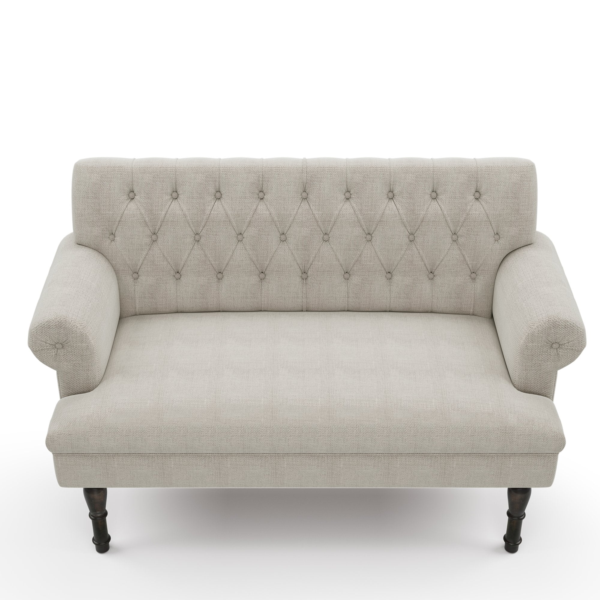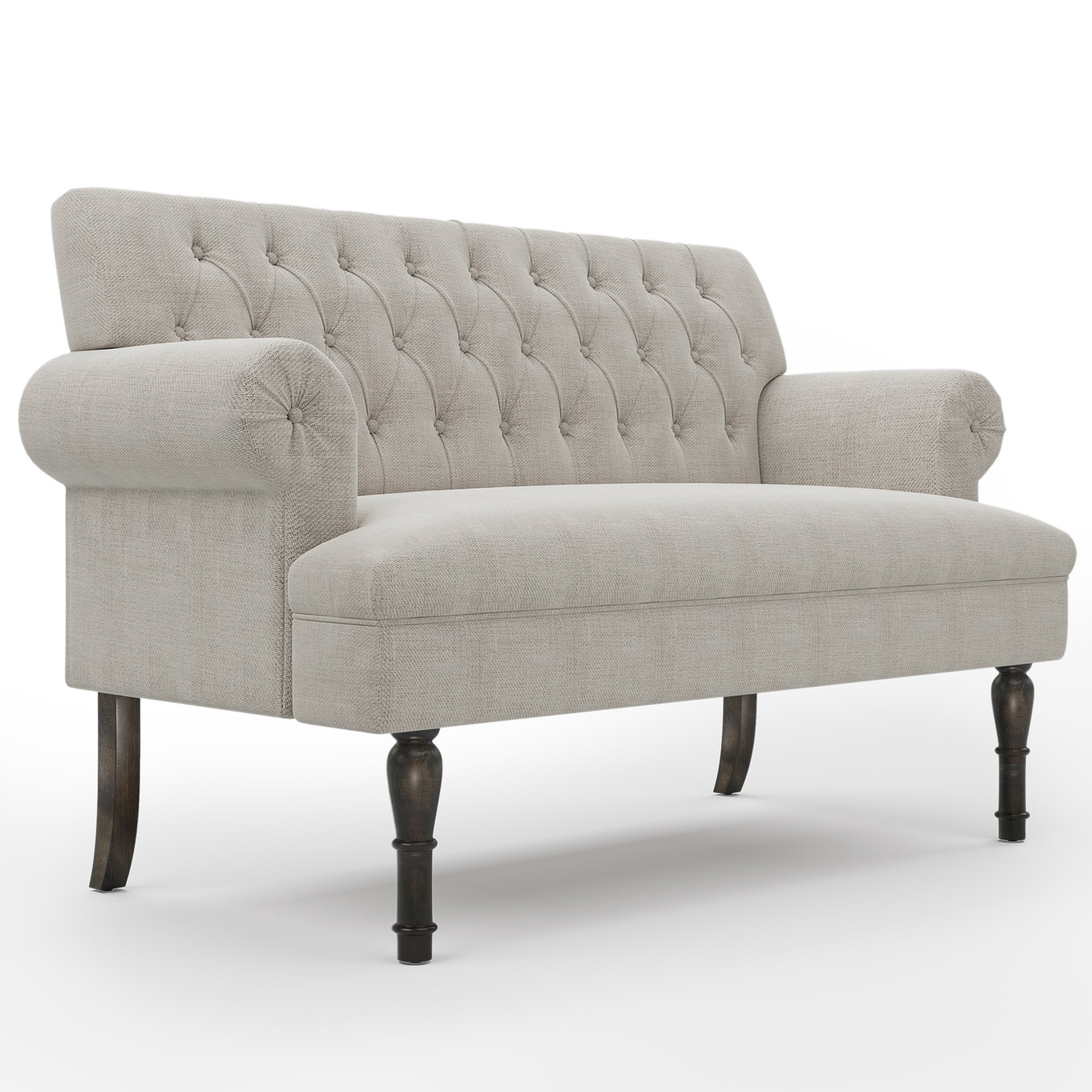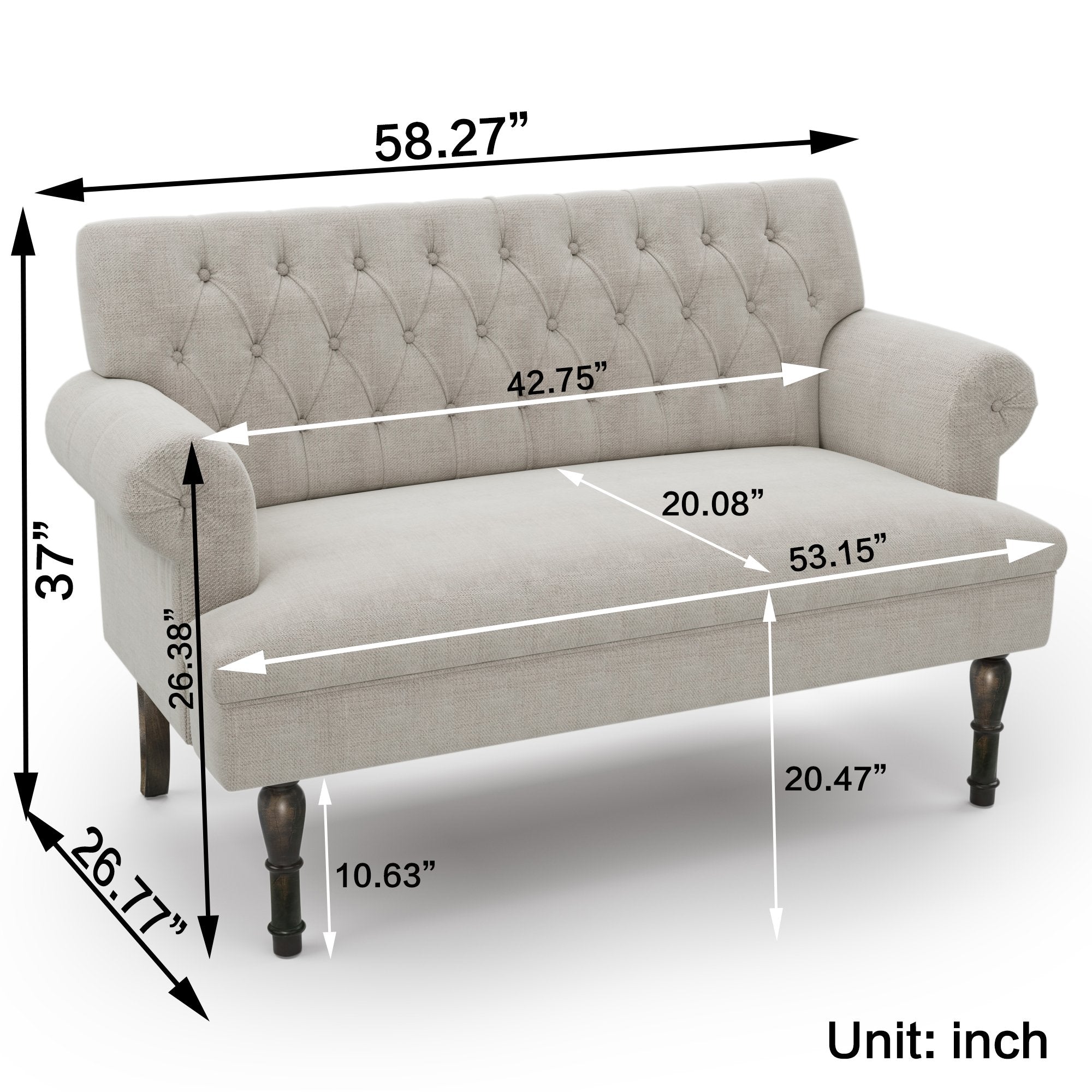 58" Linen Textured Fabric Chesterfield Settee Button Tufted Scrolled Arm Loveseat High Gourd Wood Leg Studio Bench (Pillows not included) Light Beige
