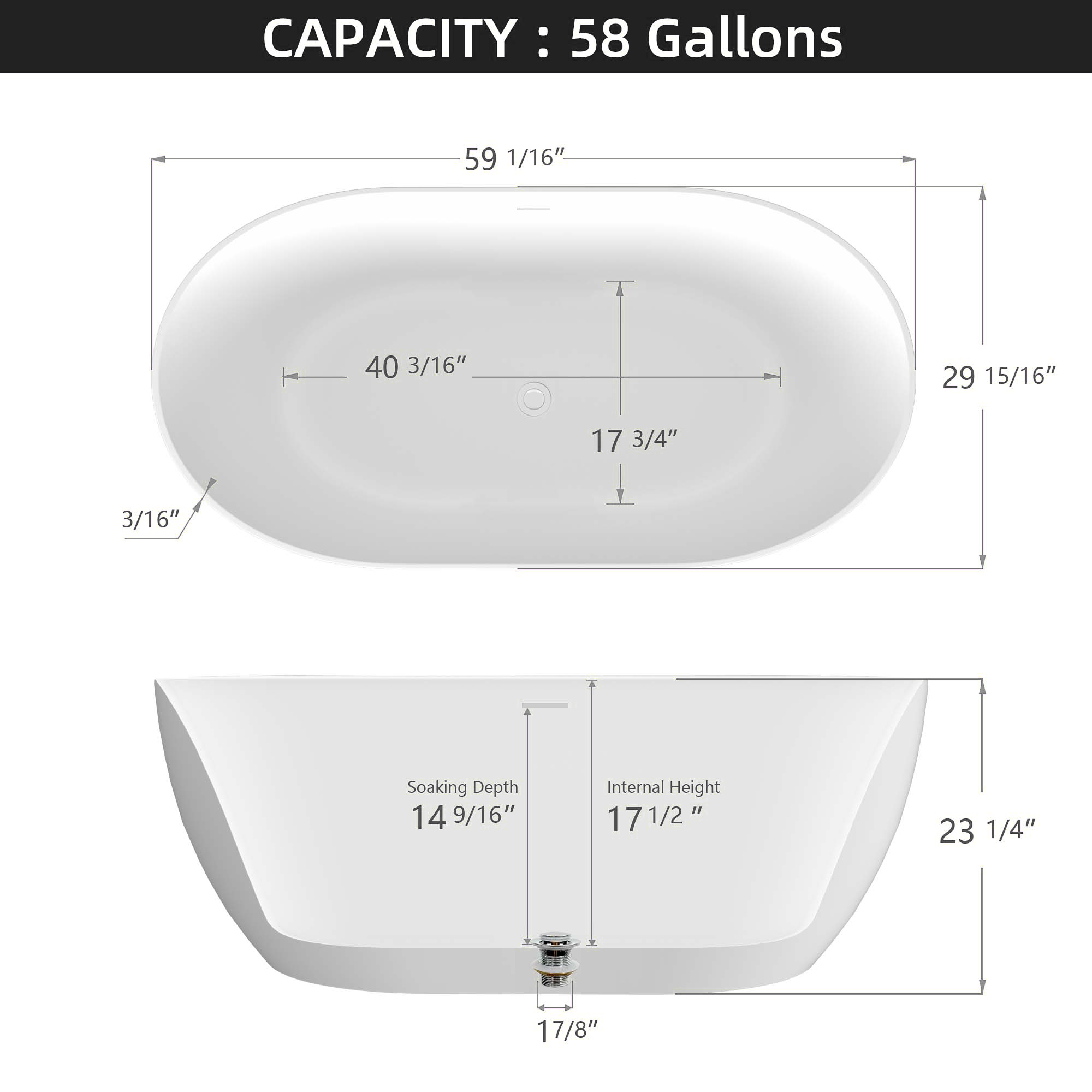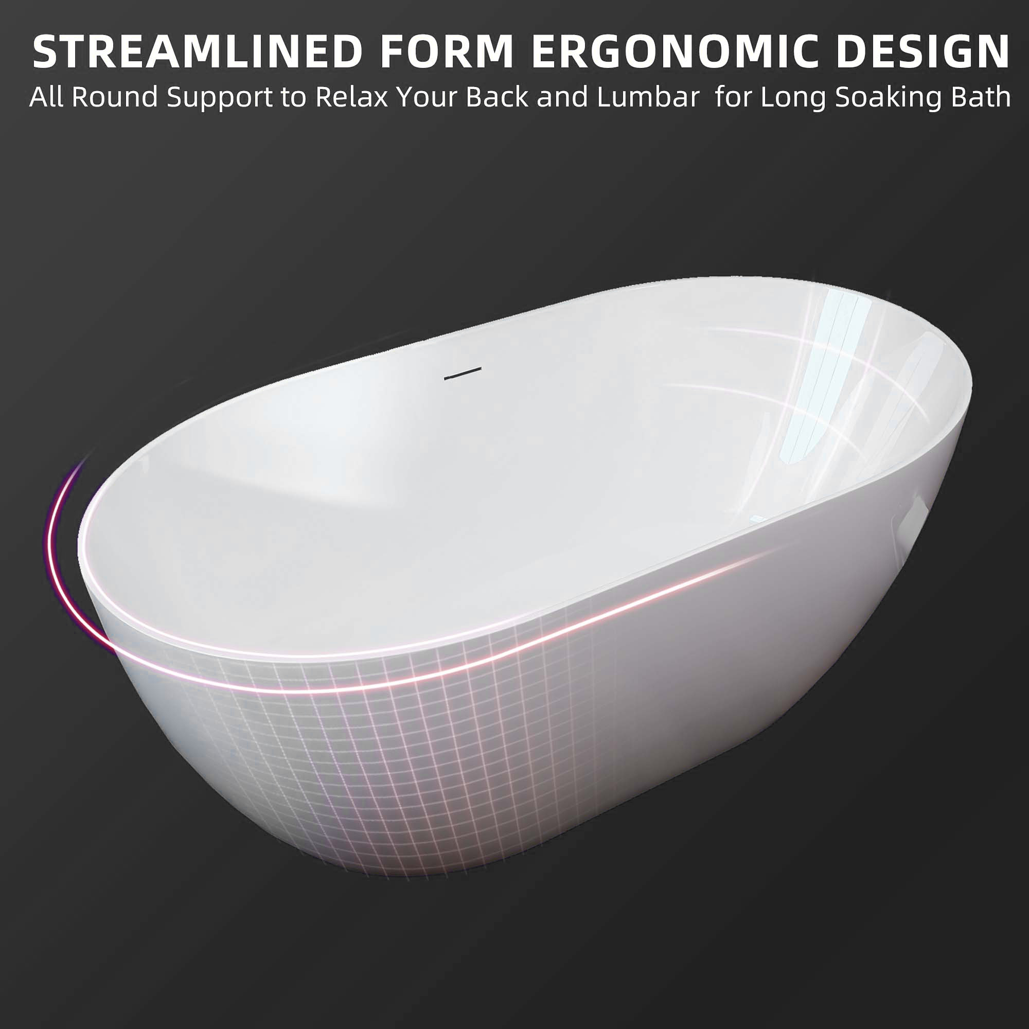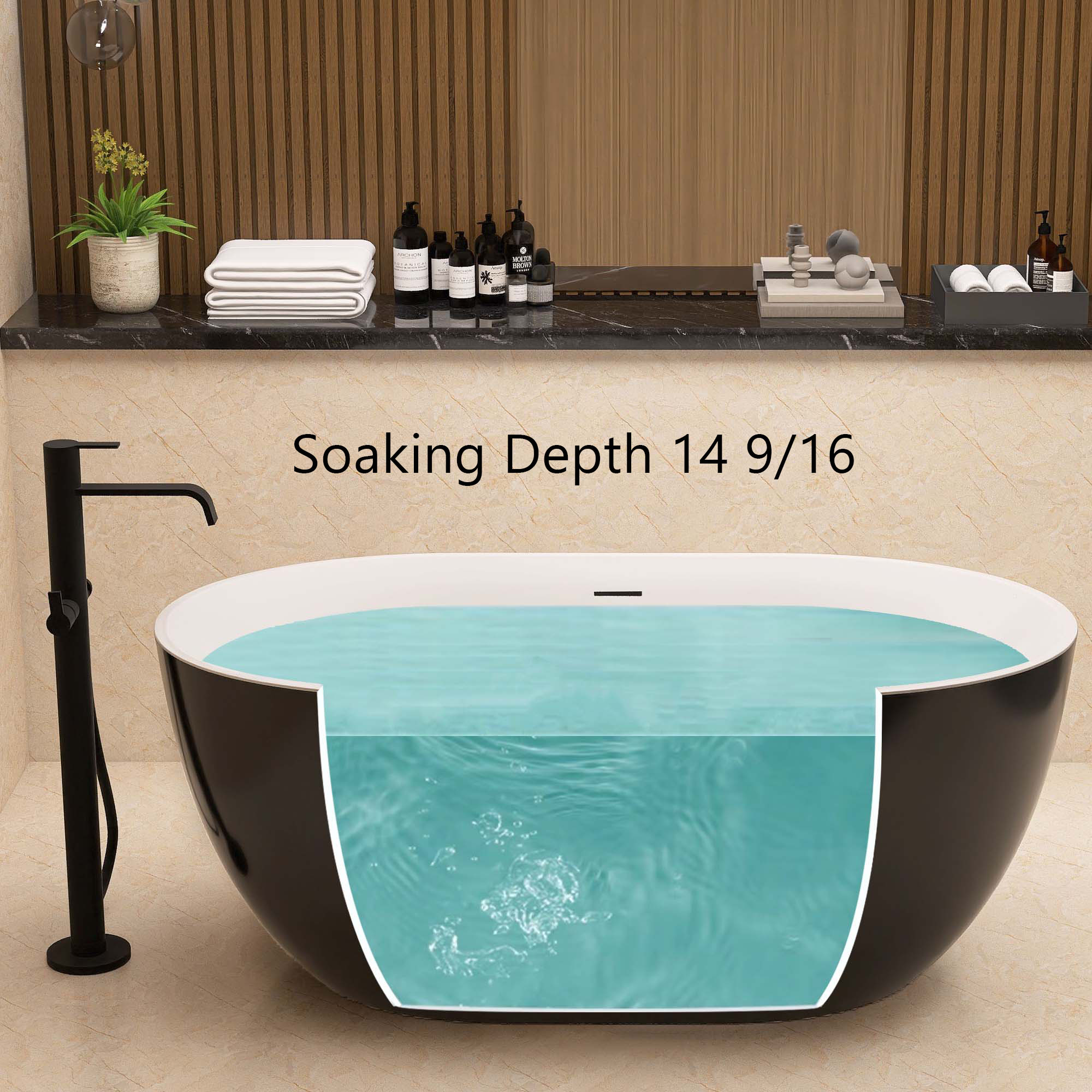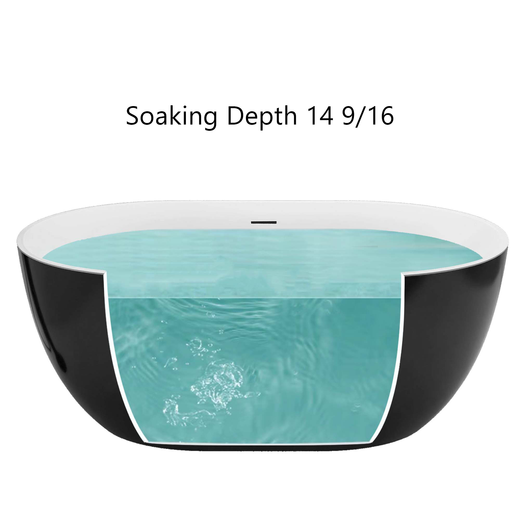The 59-inch length and 14-9/16 inch soaking depth of this acrylic free-standing tub allow for a deep soak but less space occupation. Streamlined form gently sloping ergonomic design black soaking tub following the natural curves of your body to provide exceptional comfort, full support to your back and lumbar to enjoy a relaxing soak in our free-standing tub.