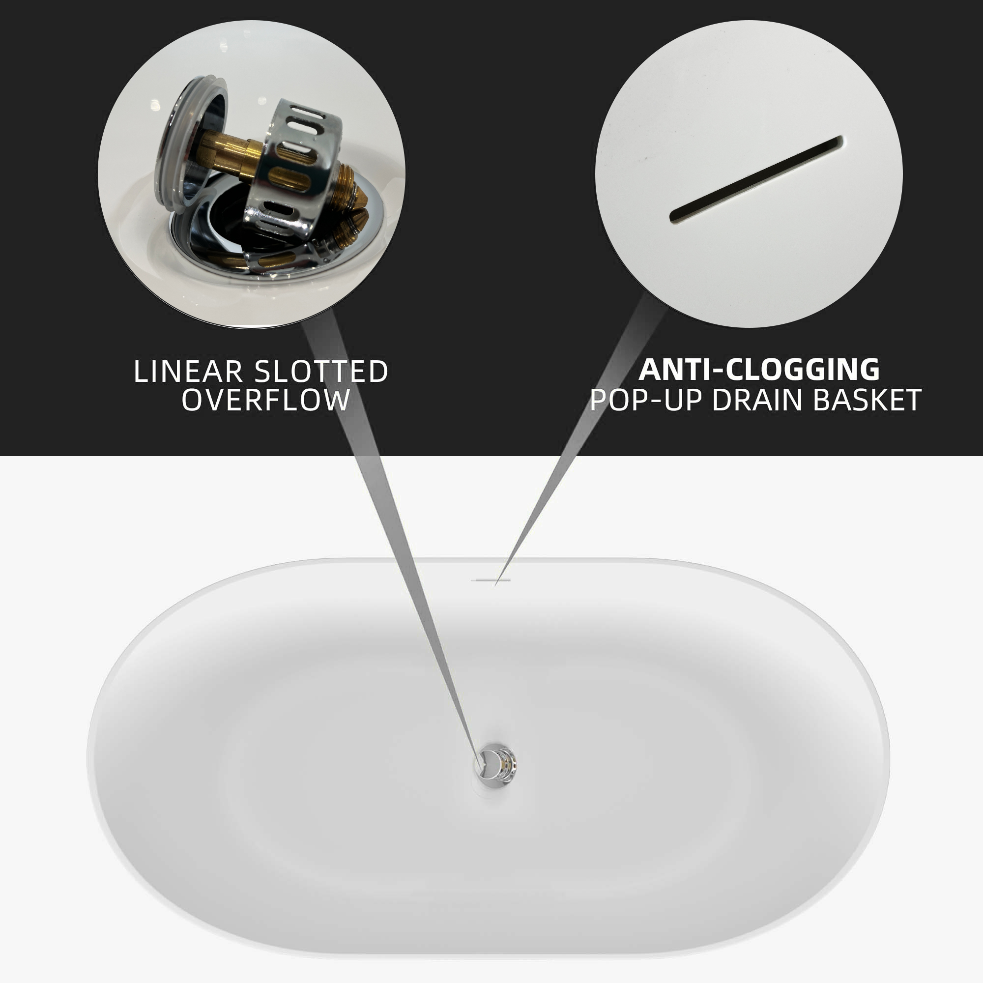 The overflow and drain of this freestanding bathtub 59 inches is an integrated sealed system. The overflow is a stylish linear slot, with no need to cover it. And this black freestanding tub comes with a chrome pop-up drain with a basket, made of stainless steel and a silica gasket seal, it is durable & watertight & anti-clogging, and very useful to keep your jewelry away from the drain.ABS drain pipe is included.