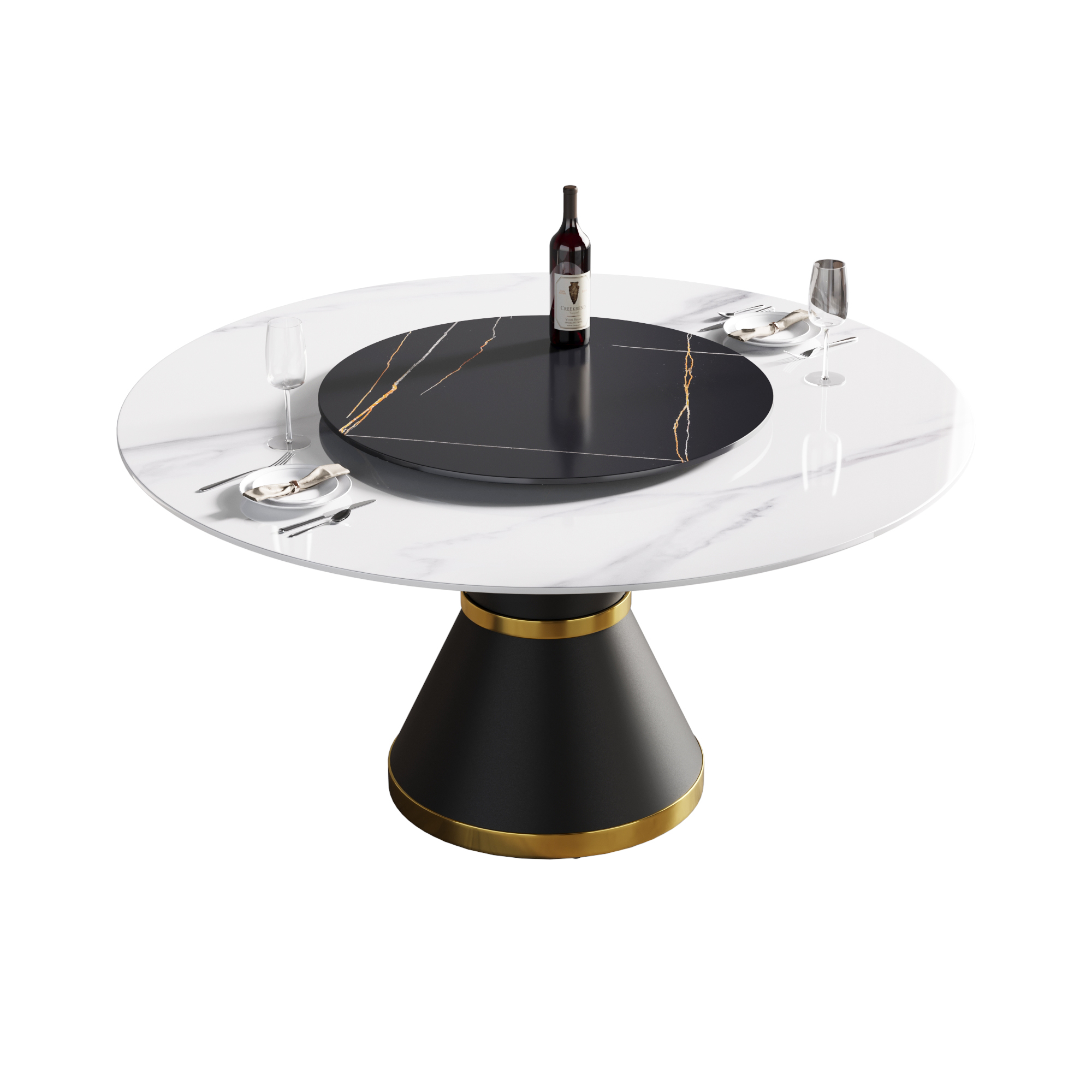 This modern and simple dining table will become the core of your dining, because it is not only the place where you hold dinner and family dinner, but also adds beauty to your space. Undoubtedly, the most striking thing about this dining table is the contrast between the snow-white panel and the aesthetic texture on the table top. Candlesticks can be placed on the big space desktop to create a romantic atmosphere for loved ones and create a beautiful environment for family dinners and delicious food ~Product description:[White Simple Appearance] This round table is made of artificial stone, and it is made into a perfect dining table with exquisite craftsmanship, which can accommodate 8 people. The hollowed-out base adds a touch of medieval simplicity to this table.[Strong dining table panel & easy to clean] Desktop is one of the strongest surfaces, made of sintered stone, which is pressed into a blade shape after heating, providing you with a desktop that can be used for many years. This material can prevent burns, stains and scratches, and has the characteristics of heat resistance, fire resistance and antifouling.[Stable base] This dining table adopts a black carbon steel base, which is hard and stable for the big advantages, and can keep the level of the whole dining table.[Rotatable disk] Adding a rotatable disk to the dining table can increase the area of the dining table. The rotating design can make everyone in the family taste every dish easily.Product advantages:[Anti-fouling & easy cleaning] Extremely low water permeability can make oil or liquid impermeable, and the desktop can be kept clean only by wiping.[Fire resistance and high temperature resistance] When in direct contact with high-temperature objects or flames, it will not deform, crack or emit gas or odor.[Using natural materials] Natural materials do not release harmful substances, and are 100% recyclable. No radiation, direct contact with food.Warm tip:During the processing of natural materials, there will be subtle changes in color tone, surface texture and texture, and there will be subtle differences with pictures, which is a normal phenomenon. Natural changes are not regarded as product defects.