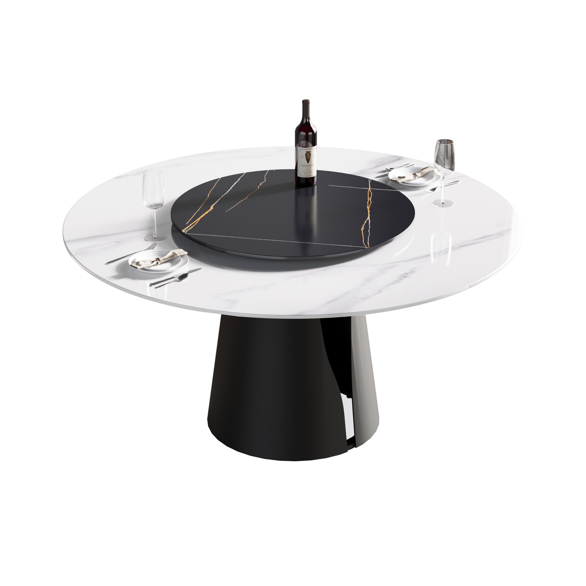 This modern and simple dining table will become the core of your dining, because it is not only the place where you hold dinner and family dinner, but also adds beauty to your space. Undoubtedly, the most striking thing about this dining table is the contrast between the snow-white panel and the aesthetic texture on the table top. Candlesticks can be placed on the big space desktop to create a romantic atmosphere for loved ones and create a beautiful environment for family dinners and delicious food ~Product description:[White Simple Appearance] This round table is made of artificial stone, and it is made into a perfect dining table with exquisite craftsmanship, which can accommodate 8 people. The hollowed-out base adds a touch of medieval simplicity to this table.[Strong dining table panel & easy to clean] Desktop is one of the strongest surfaces, made of sintered stone, which is pressed into a blade shape after heating, providing you with a desktop that can be used for many years. This material can prevent burns, stains and scratches, and has the characteristics of heat resistance, fire resistance and antifouling.[Stable base] This dining table adopts a black carbon steel base, which is hard and stable for the big advantages, and can keep the level of the whole dining table.[Rotatable disk] Adding a rotatable disk to the dining table can increase the area of the dining table. The rotating design can make everyone in the family taste every dish easily.Product advantages:[Anti-fouling & easy cleaning] Extremely low water permeability can make oil or liquid impermeable, and the desktop can be kept clean only by wiping.[Fire resistance and high temperature resistance] When in direct contact with high-temperature objects or flames, it will not deform, crack or emit gas or odor.[Using natural materials] Natural materials do not release harmful substances, and are 100% recyclable. No radiation, direct contact with food.Warm tip:During the processing of natural materials, there will be subtle changes in color tone, surface texture and texture, and there will be subtle differences with pictures, which is a normal phenomenon. Natural changes are not regarded as product defects.