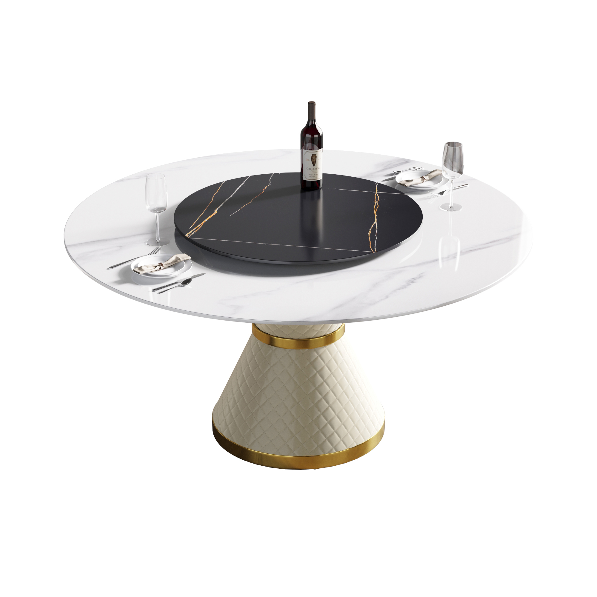 59.05"Modern artificial stone round white carbon steel base dining table-can accommodate 6 people-31.5"black artificial stone turntable