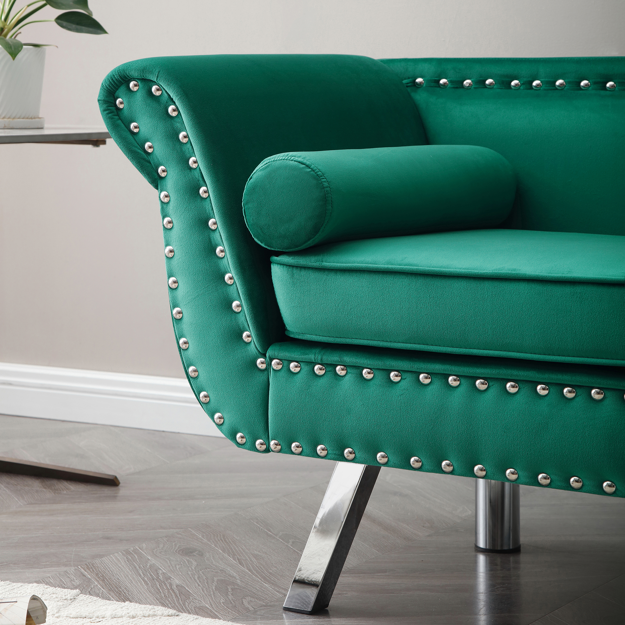 This unique modern velvet loveseat design features with elegantly curved back, rolled armrests, nail head trimming,2pcs matching bolster pillows, and silver metal legs. Delicate decoration for small spaces, such as living room, bedroom, apartment, office, etc.