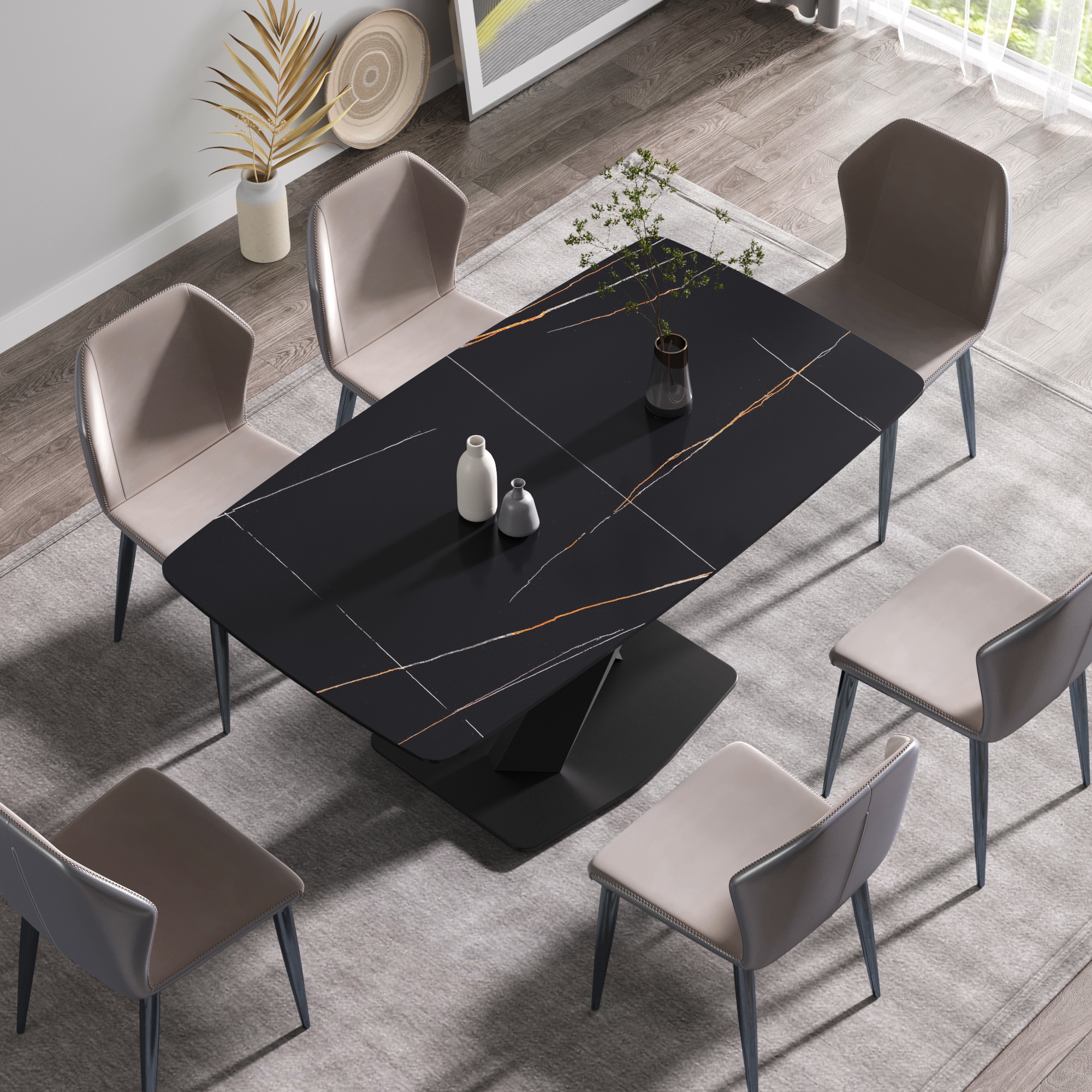 This modern and simple dining table will become the core of your dining, because it is not only the place where you hold dinner and family dinner, but also adds beauty to your space. Undoubtedly, the most striking thing about this dining table is the contrast between the snow-white panel and the aesthetic texture on the table top. Candlesticks can be placed on the dining table in a large space to create a romantic atmosphere for loved ones and a beautiful environment for family dinners and food ~Product description:[Black simple appearance] This rectangular dining table is made of artificial stone, which is made into a perfect dining table with exquisite craftsmanship and can accommodate 6 people.[Strong dining table panel & easy to clean] The table top is one of the strongest surfaces. The 12mm thick desktop is made of sintered stone, which is heated and pressed into a blade shape, providing you with a desktop that can be used for many years. This material can prevent burns, stains and scratches, and has the characteristics of heat resistance, fire resistance and antifouling.[Stable base] This dining table adopts a unique base design, which is not only beautiful but also stable.Product advantages:[Anti-fouling & easy cleaning] Extremely low water permeability can make oil or liquid impermeable, and the desktop can be kept clean only by wiping.[Fire resistance and high temperature resistance] When in direct contact with high-temperature objects or flames, it will not deform, crack or emit gas or odor.[Using natural materials] Natural materials do not release harmful substances, and are 100% recyclable. No radiation, direct contact with food.[High hardness] The 12mm thick panel has high hardness, leaving no trace whether it is knocked or cut with a knife.Warm tip:During the processing of natural materials, there will be subtle changes in color tone, surface texture and texture, and there will be subtle differences with pictures, which is a normal phenomenon. Natural changes are not regarded as product defects.