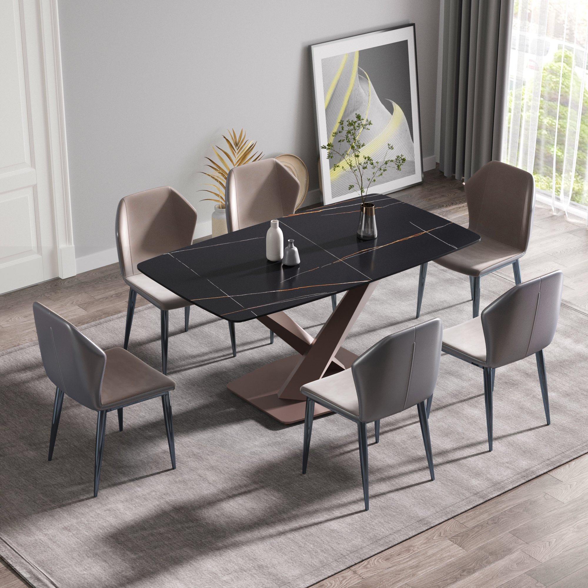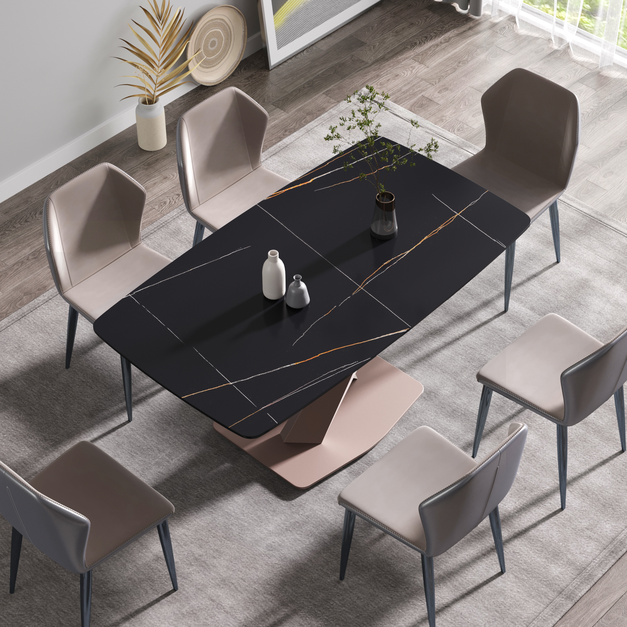 This modern and simple dining table will become the core of your dining, because it is not only the place where you hold dinner and family dinner, but also adds beauty to your space. Undoubtedly, the most striking thing about this dining table is the contrast between the snow-white panel and the aesthetic texture on the table top. Candlesticks can be placed on the dining table in a large space to create a romantic atmosphere for loved ones and a beautiful environment for family dinners and food ~Product description:[Black simple appearance] This rectangular dining table is made of artificial stone, which is made into a perfect dining table with exquisite craftsmanship and can accommodate 6 people.[Strong dining table panel & easy to clean] The table top is one of the strongest surfaces. The 12mm thick desktop is made of sintered stone, which is heated and pressed into a blade shape, providing you with a desktop that can be used for many years. This material can prevent burns, stains and scratches, and has the characteristics of heat resistance, fire resistance and antifouling.[Stable base] This dining table adopts a unique base design, which is not only beautiful but also stable.Product advantages:[Anti-fouling & easy cleaning] Extremely low water permeability can make oil or liquid impermeable, and the desktop can be kept clean only by wiping.[Fire resistance and high temperature resistance] When in direct contact with high-temperature objects or flames, it will not deform, crack or emit gas or odor.[Using natural materials] Natural materials do not release harmful substances, and are 100% recyclable. No radiation, direct contact with food.[High hardness] The 12mm thick panel has high hardness, leaving no trace whether it is knocked or cut with a knife.Warm tip:During the processing of natural materials, there will be subtle changes in color tone, surface texture and texture, and there will be subtle differences with pictures, which is a normal phenomenon. Natural changes are not regarded as product defects.