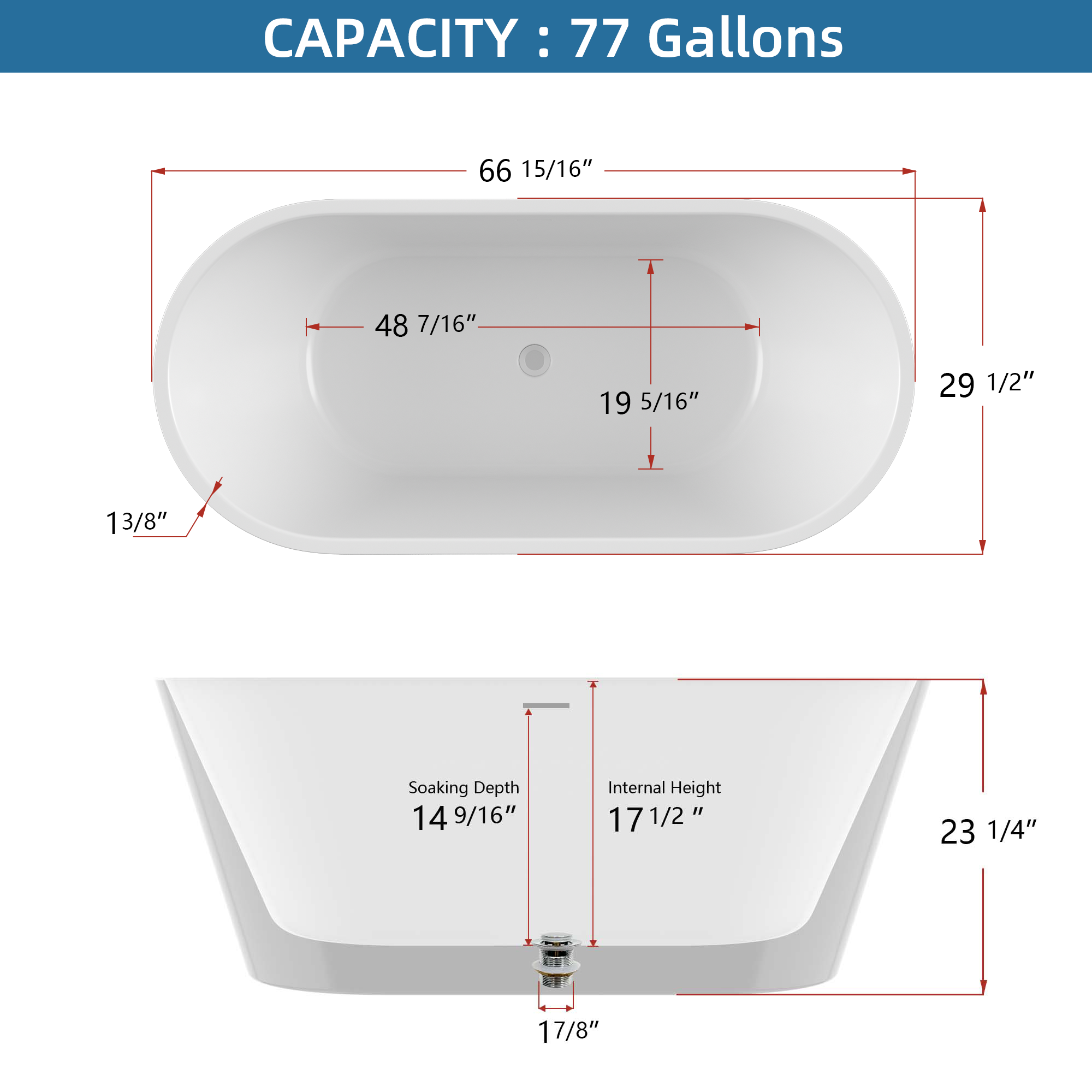 The 67-inch length and 14-9/16 inch soaking depth of this acrylic free-standing tub allow for a deep soak but less space occupation. Streamlined form gently sloping ergonomic design white soaking tub following the natural curves of your body to provide exceptional comfort, and full support to your back and lumbar to enjoy a relaxing soak in our free-standing tub.