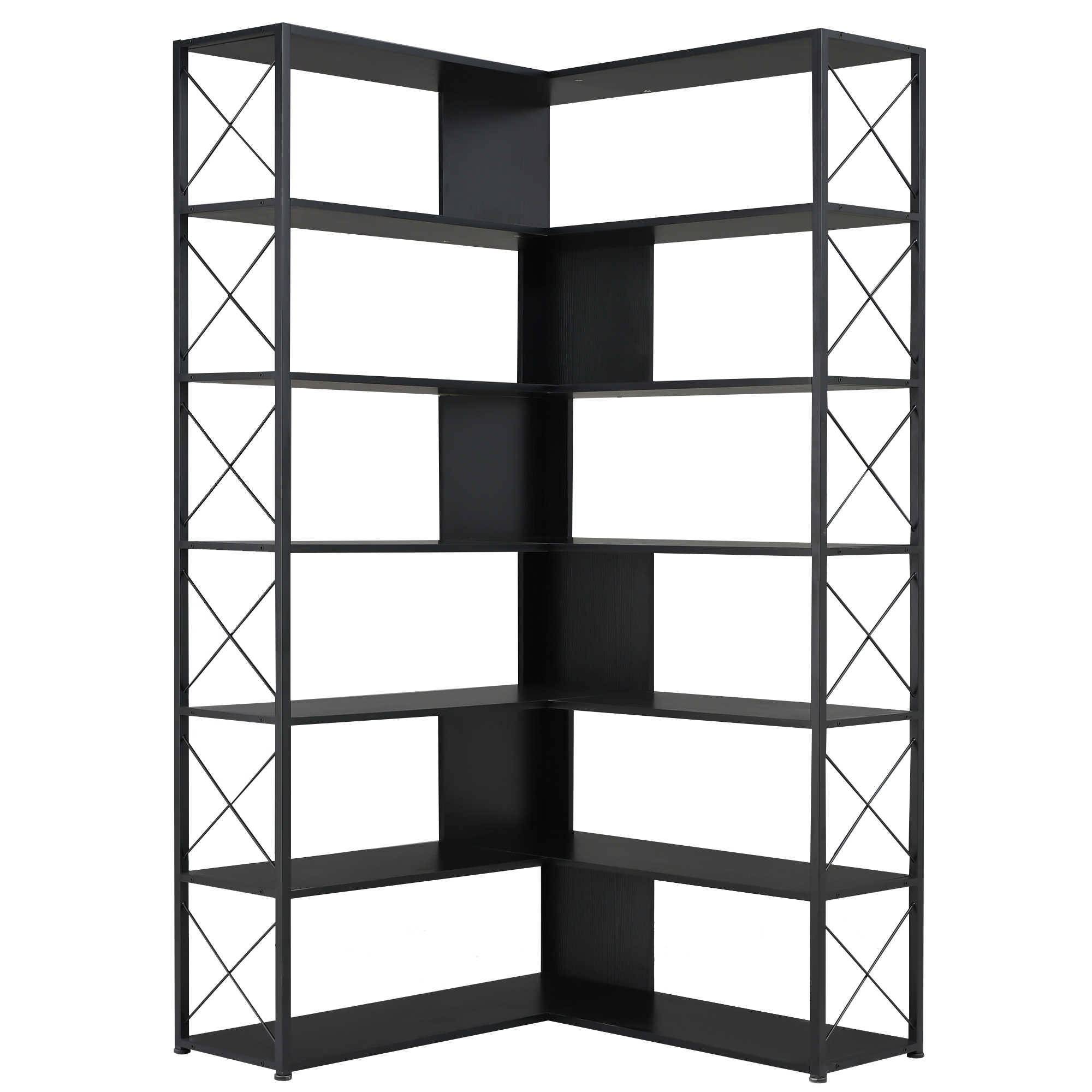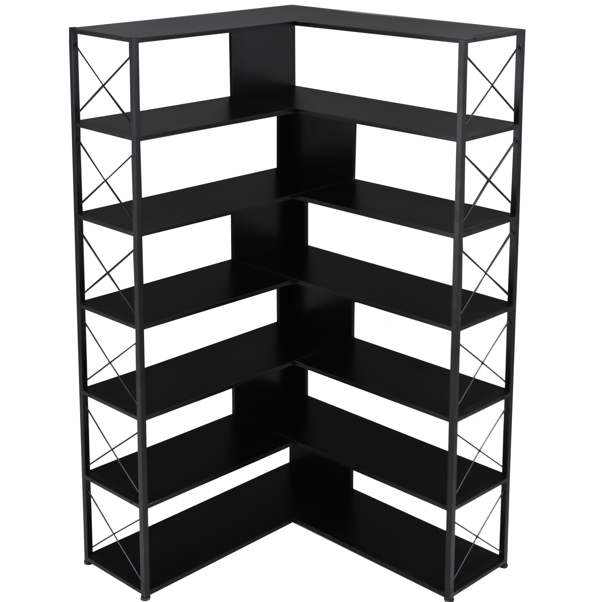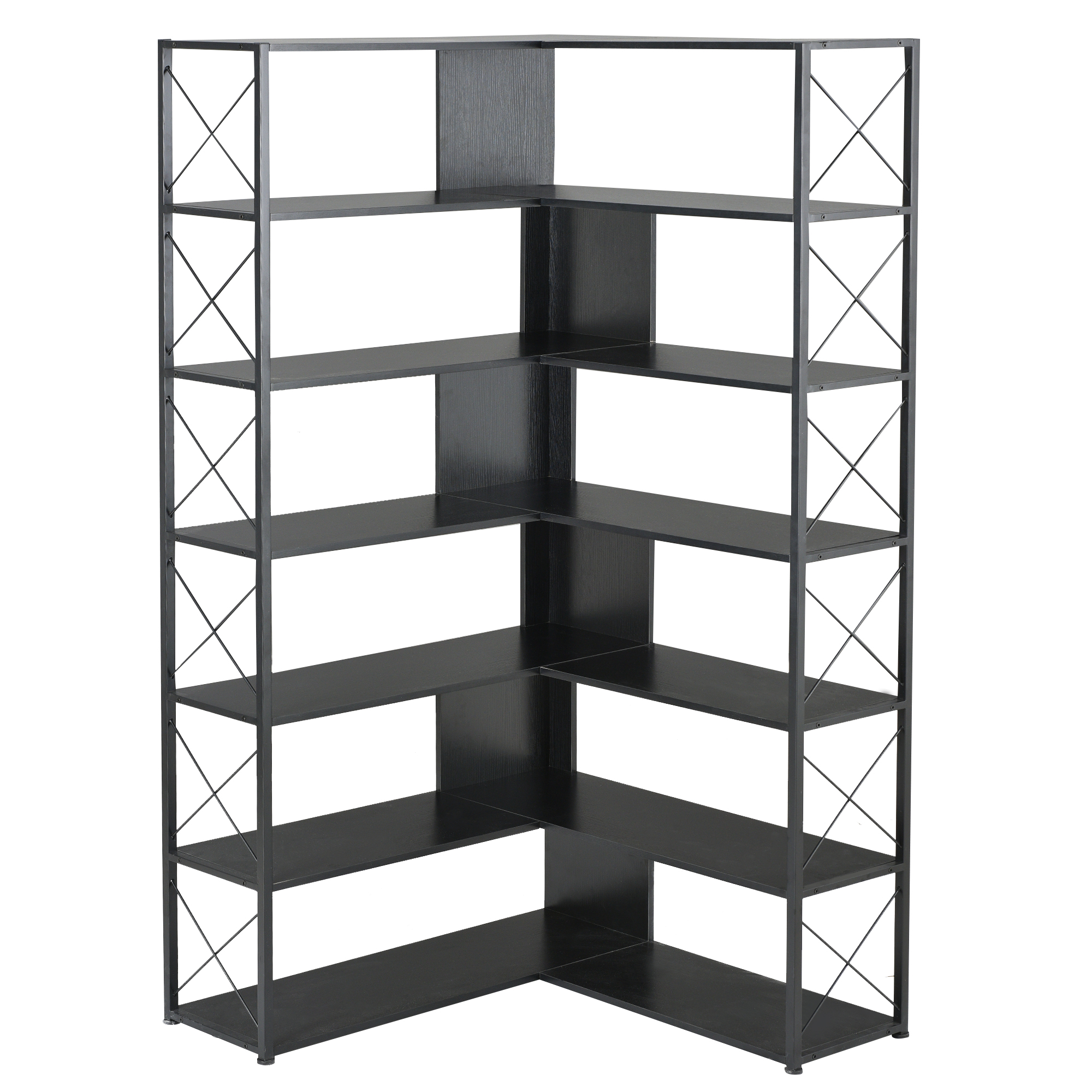 As a piece of functional furniture, this elegant and tall bookshelf has an L-shaped design, and it makes more efficient use of corner space. The X-shaped design on both sides is not only graceful but also can further strengthen the stability of the whole bookshelf and can be used as a safety facility to prevent items from falling.