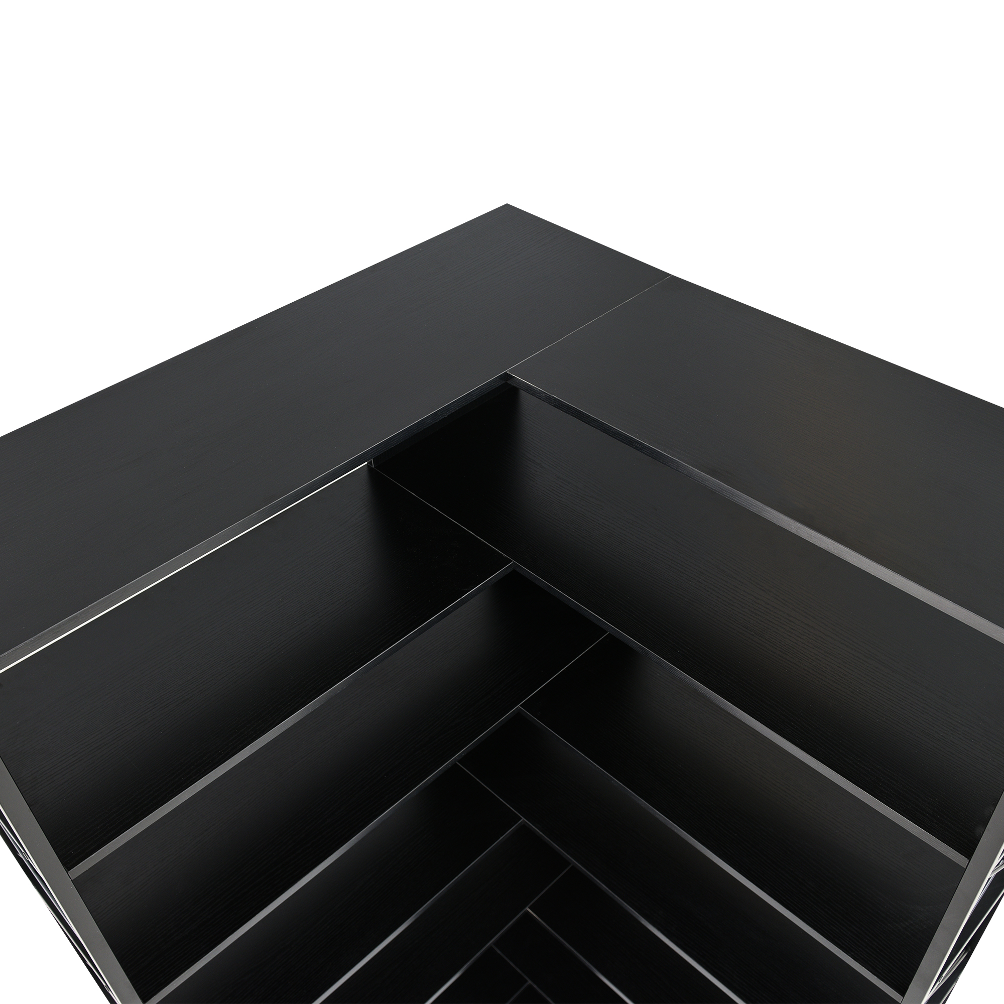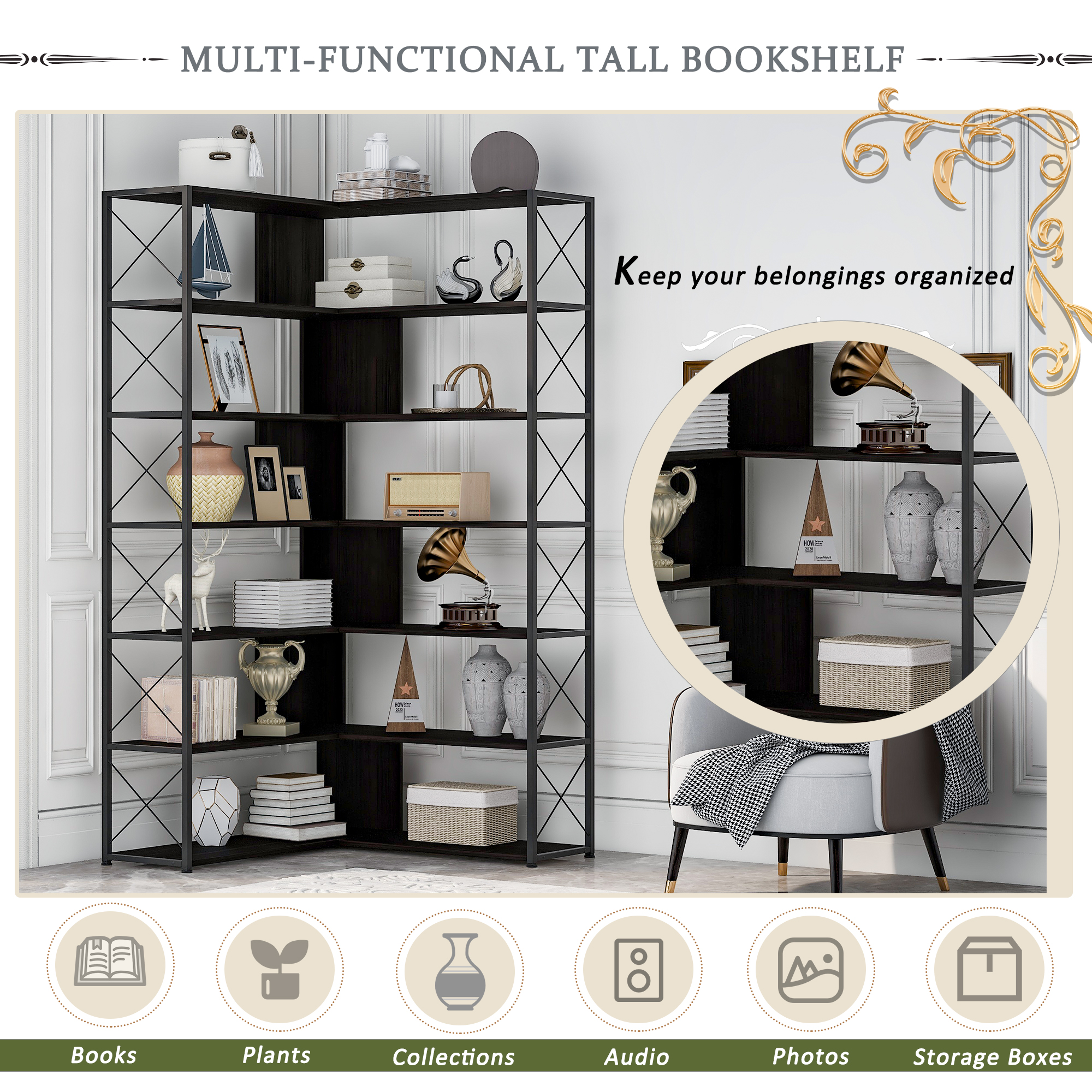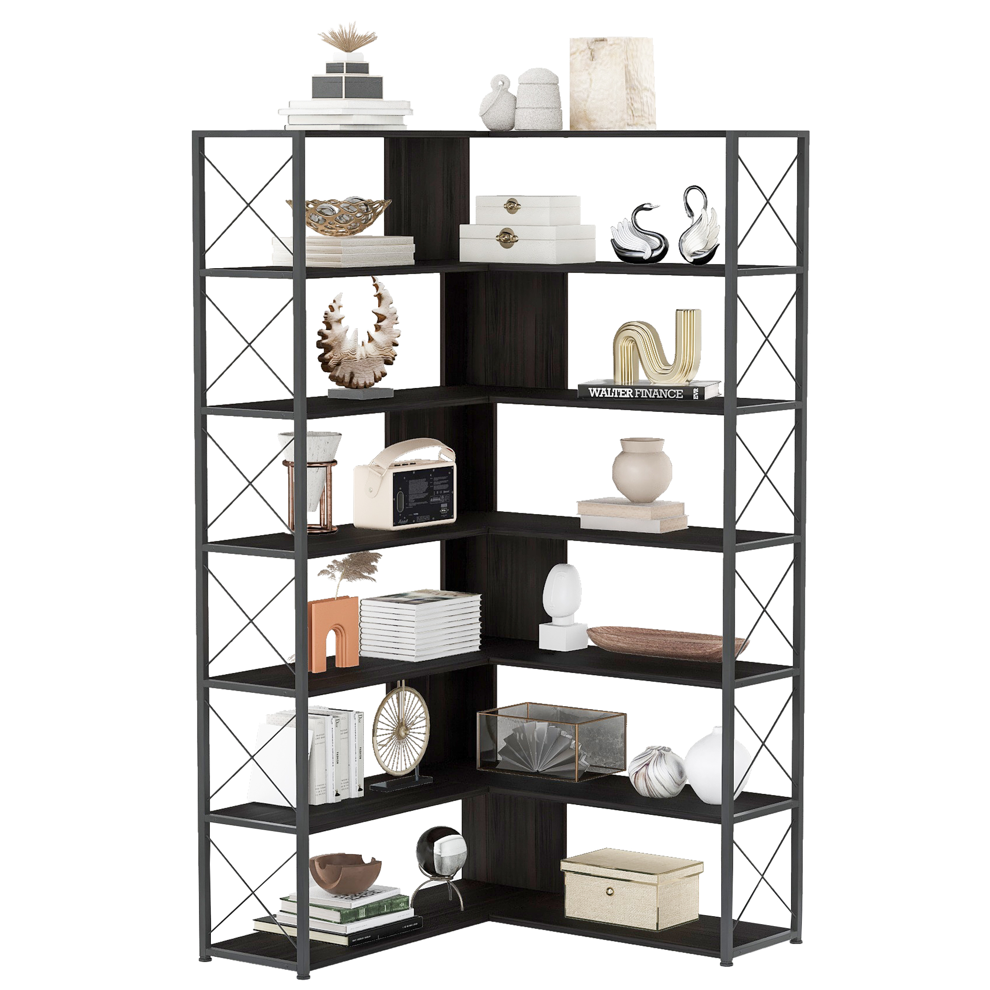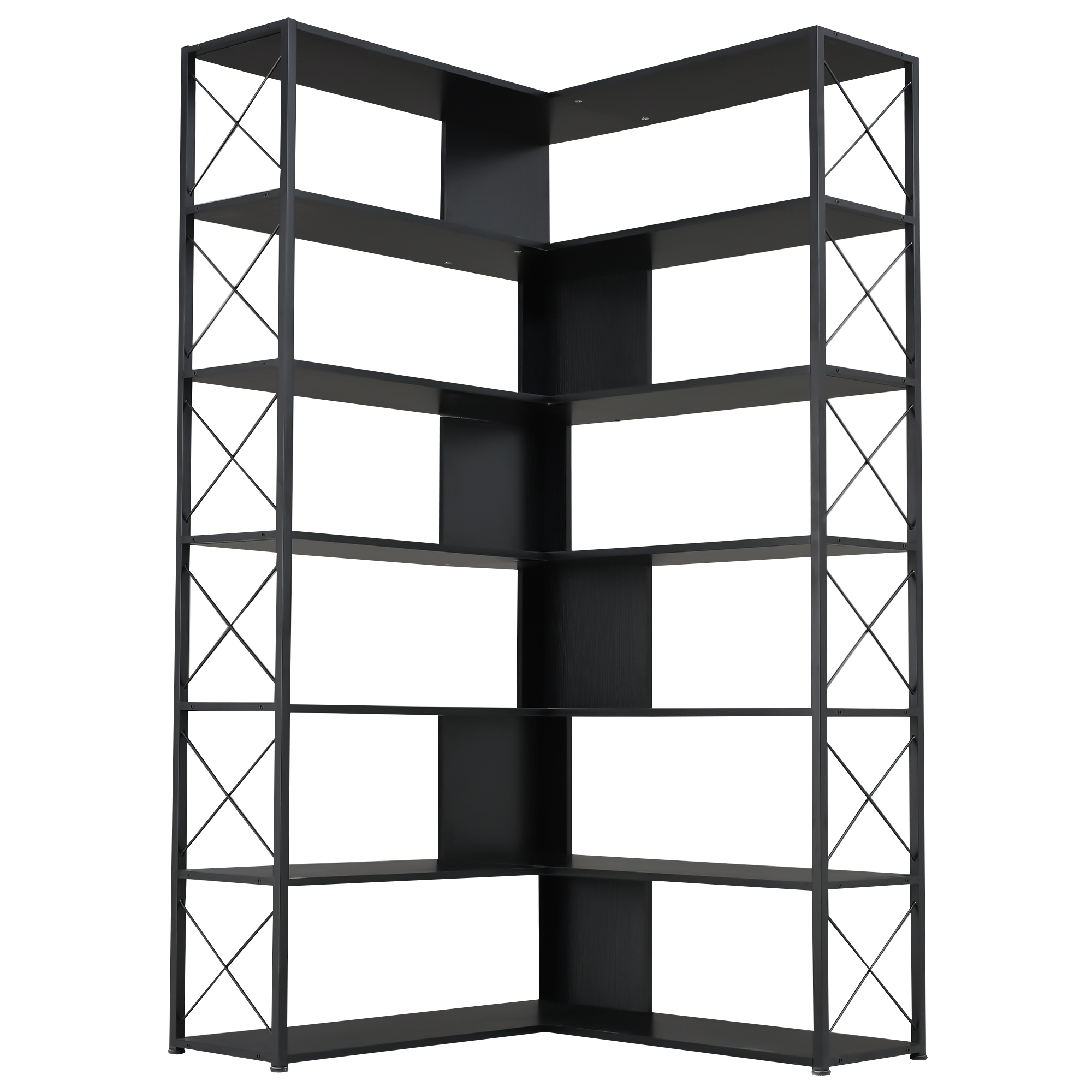 As a piece of functional furniture, this elegant and tall bookshelf has an L-shaped design, and it makes more efficient use of corner space. The X-shaped design on both sides is not only graceful but also can further strengthen the stability of the whole bookshelf and can be used as a safety facility to prevent items from falling.