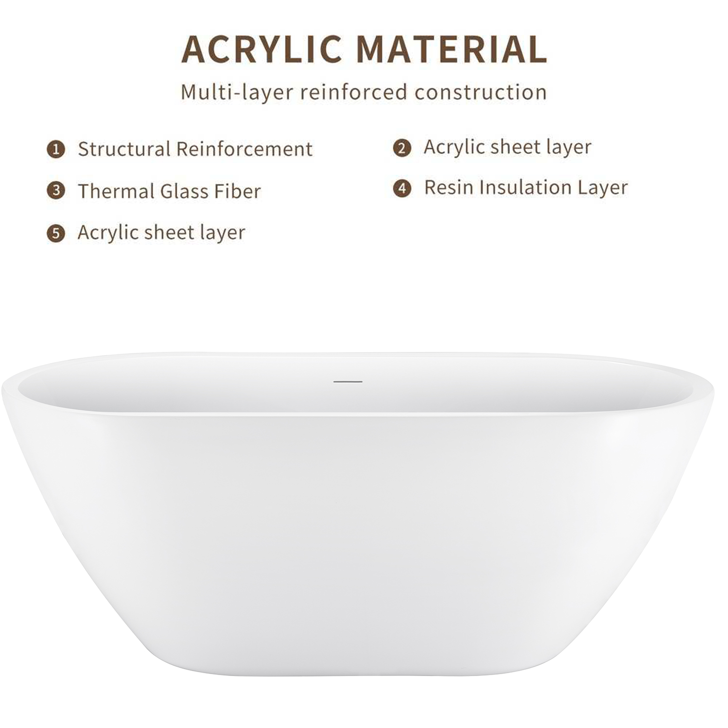 All bright white,100% glossy acrylic, glass fiber reinforced, durable Environmentally friendly material, non-toxic, non-cracking, high gloss, durable Easy to clean, resistant to many household chemicals and cosmetics.Achieve dynamic curvature and distinctive handcrafted details with individuality.Refined overflow Chrome finish Refined overflow Rectangular design Prevents water from overflowing into the tub Comfortable bathing.Pop-up bathtub drain Manufactured bathtub drain. Polished chrome plating anti-corrosion and anti-rust, more beautiful and convenient