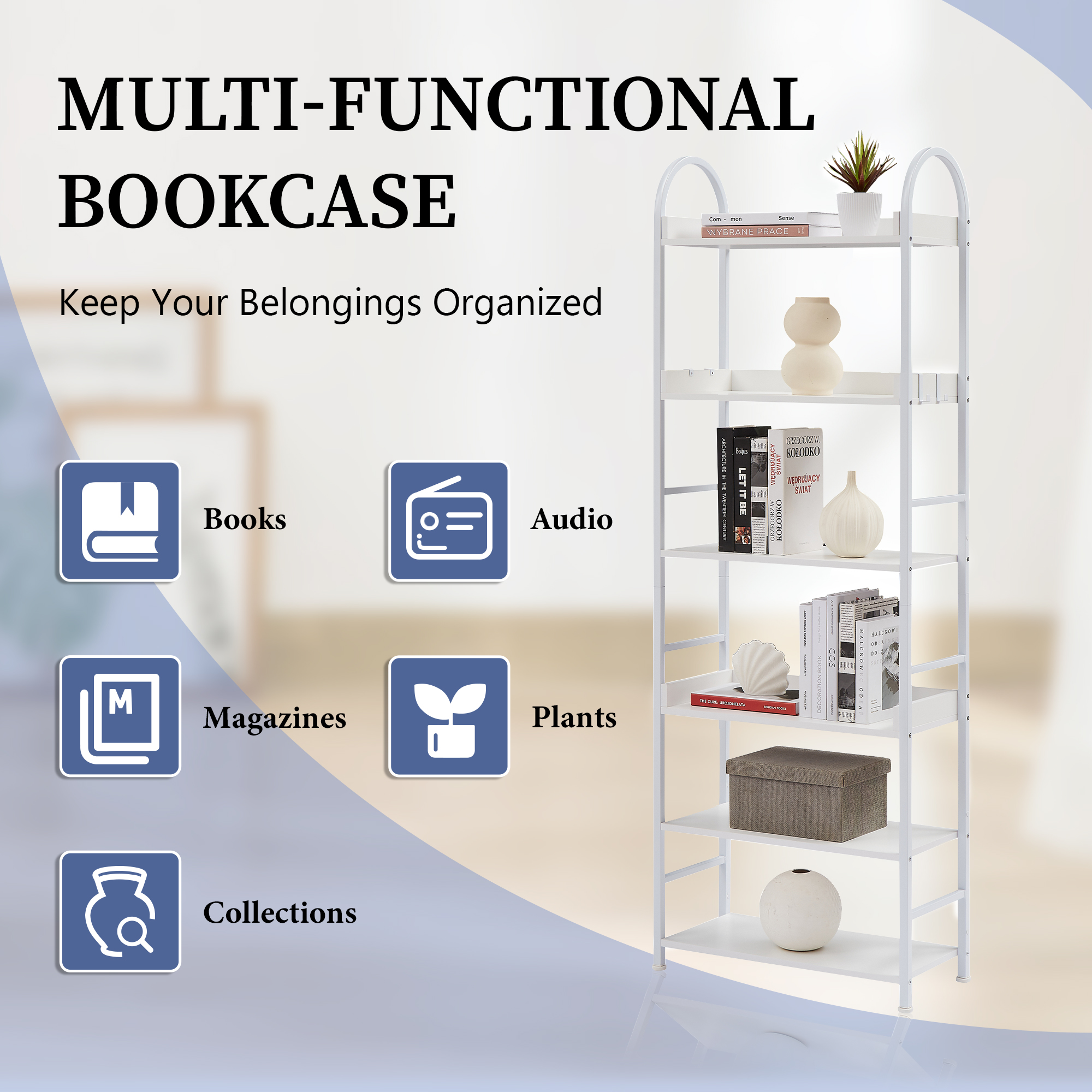 The tall bookshelf has six levels, providing ample storage space, and will not take up much space in the house. It can be placed in the study, e-sports room, utility room, garage, etc., suitable for many different home decoration styles.