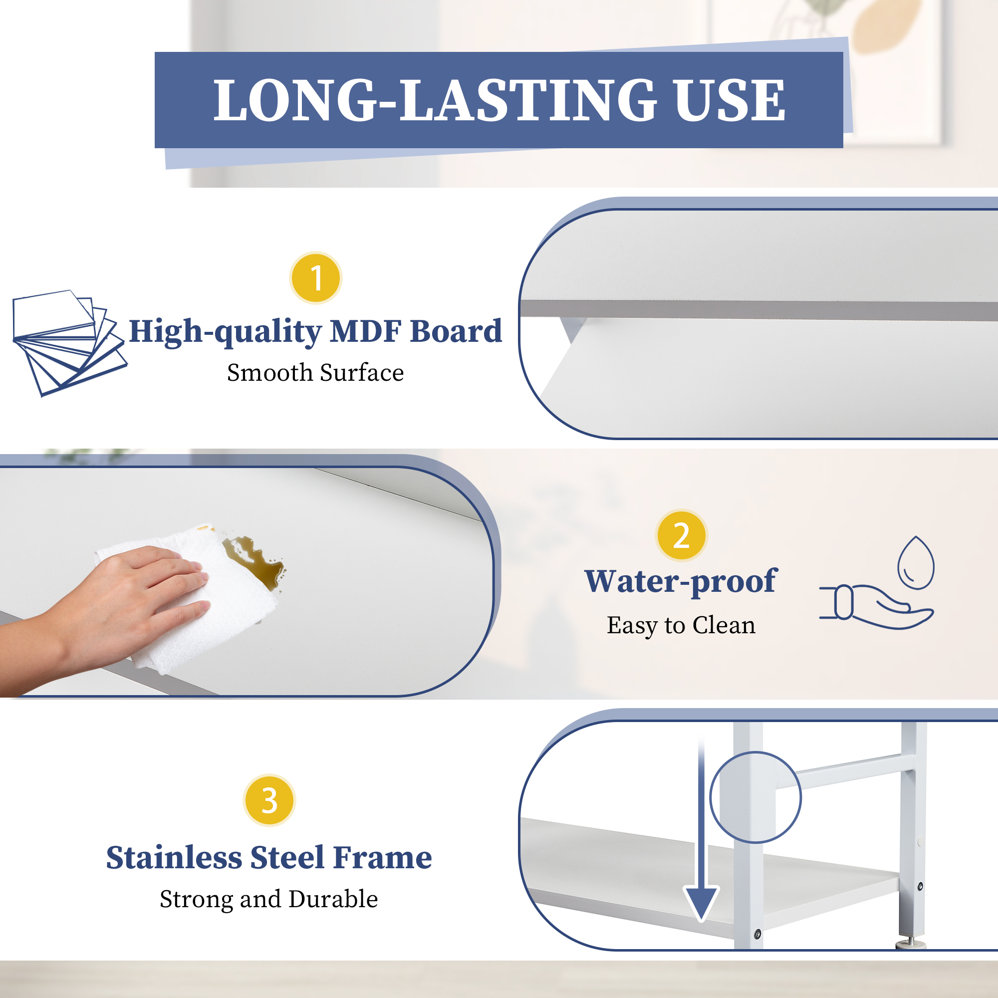 The stainless steel metal frame, ensured that this bookshelf is strong and not prone to rust during long-term use, coupled with high-quality MDF boards, which guarantees stability and practicality. Besides, the surface of this bookshelf is smooth, waterproof and easy to clean, hassle-free.