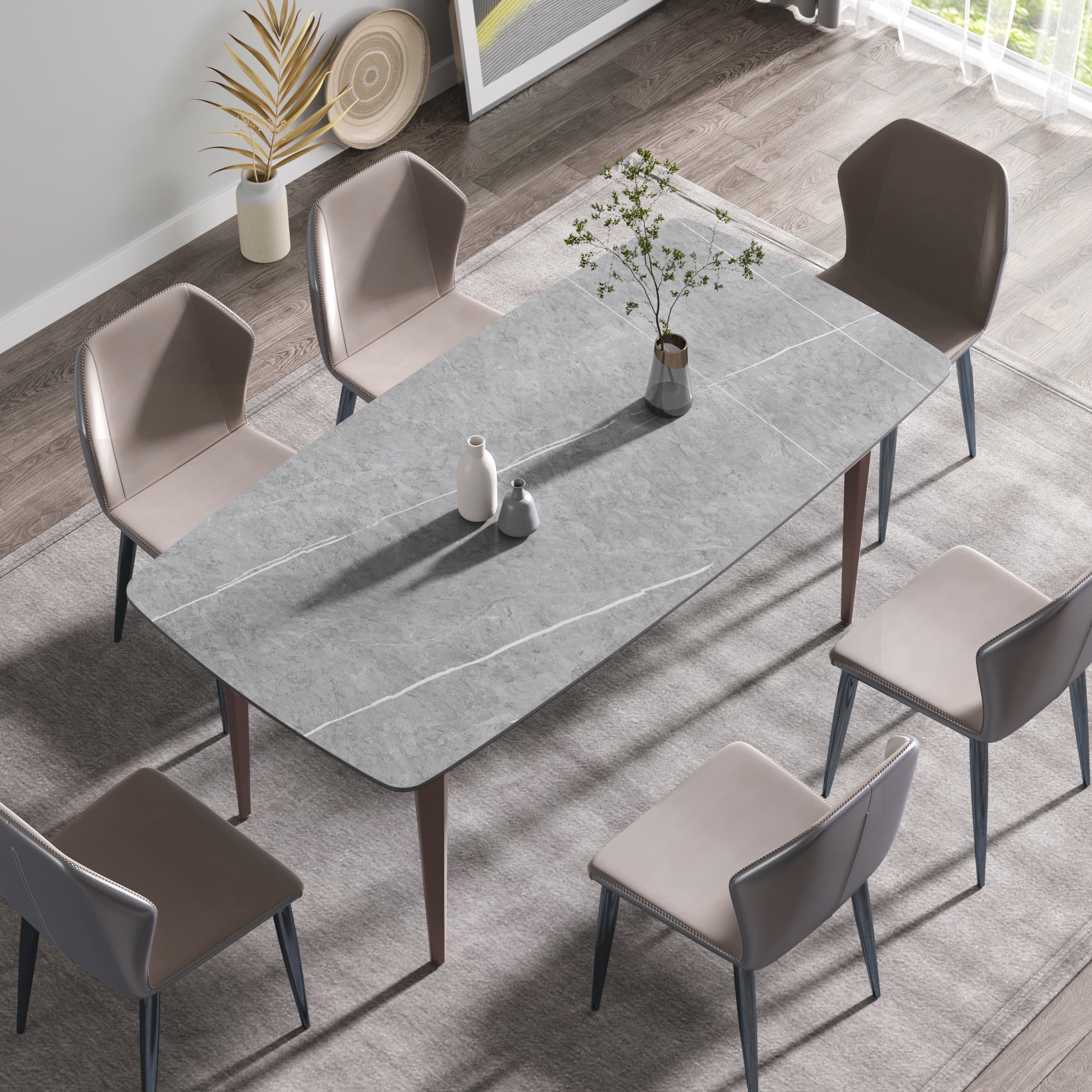 This modern and simple dining table will become the core of your dining, because it is not only the place where you hold dinner and family dinner, but also adds beauty to your space. Undoubtedly, the most striking thing about this dining table is the contrast between the bright panel and the aesthetic texture on the table top. Candlesticks can be placed on the dining table in a large space to create a romantic atmosphere for loved ones and a beautiful environment for family dinners and food ~Product description:[Grey simple appearance] This rectangular dining table is made of artificial stone, and it is made into a perfect dining table with exquisite craftsmanship. It is noble and beautiful.[Spacious dining space] This panel is 70.87 inches long and can accommodate up to 6-8 people, which can make the whole family have a pleasant meal.[Rugged dining table panel & easy to clean] Rugged tabletop is another selling point. The 12mm thick desktop is made of sintered stone, which is heated and pressed into a blade shape, providing you with a desktop that can be used for many years. This material can prevent burns, stains and scratches, and has the characteristics of heat resistance, fire resistance and antifouling.[Stable base] This dining table is designed with four legs, and each leg has a contact surface, which has high stability.Product advantages:[Anti-fouling & easy cleaning] Extremely low water permeability can make oil or liquid impermeable, and the desktop can be kept clean only by wiping.[Fire resistance and high temperature resistance] When in direct contact with high-temperature objects or flames, it will not deform, crack or emit gas or odor.[Using natural materials] Natural materials do not release harmful substances, and are 100% recyclable. No radiation, direct contact with food.[High hardness] The 12mm thick panel has high hardness, leaving no trace whether it is knocked or cut with a knife.Warm tip:During the processing of natural materials, there will be subtle changes in color tone, surface texture and texture, and there will be subtle differences with pictures, which is a normal phenomenon. Natural changes are not regarded as product defects.