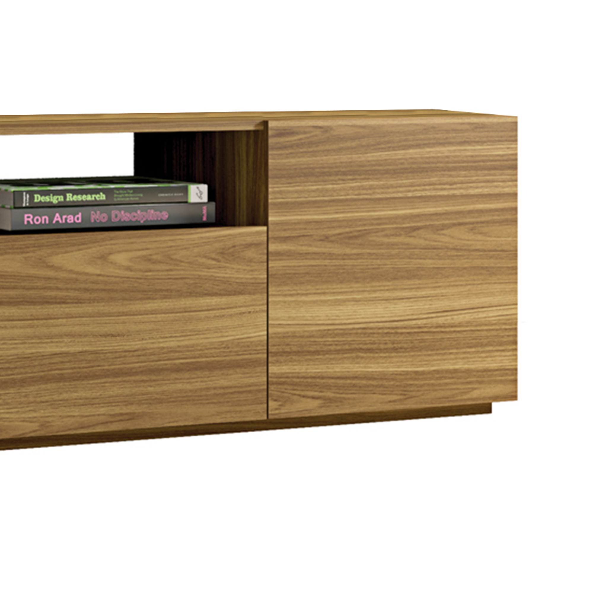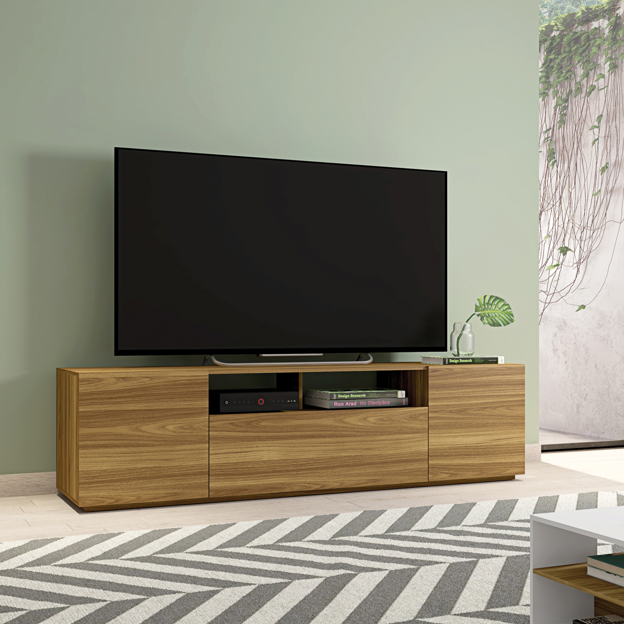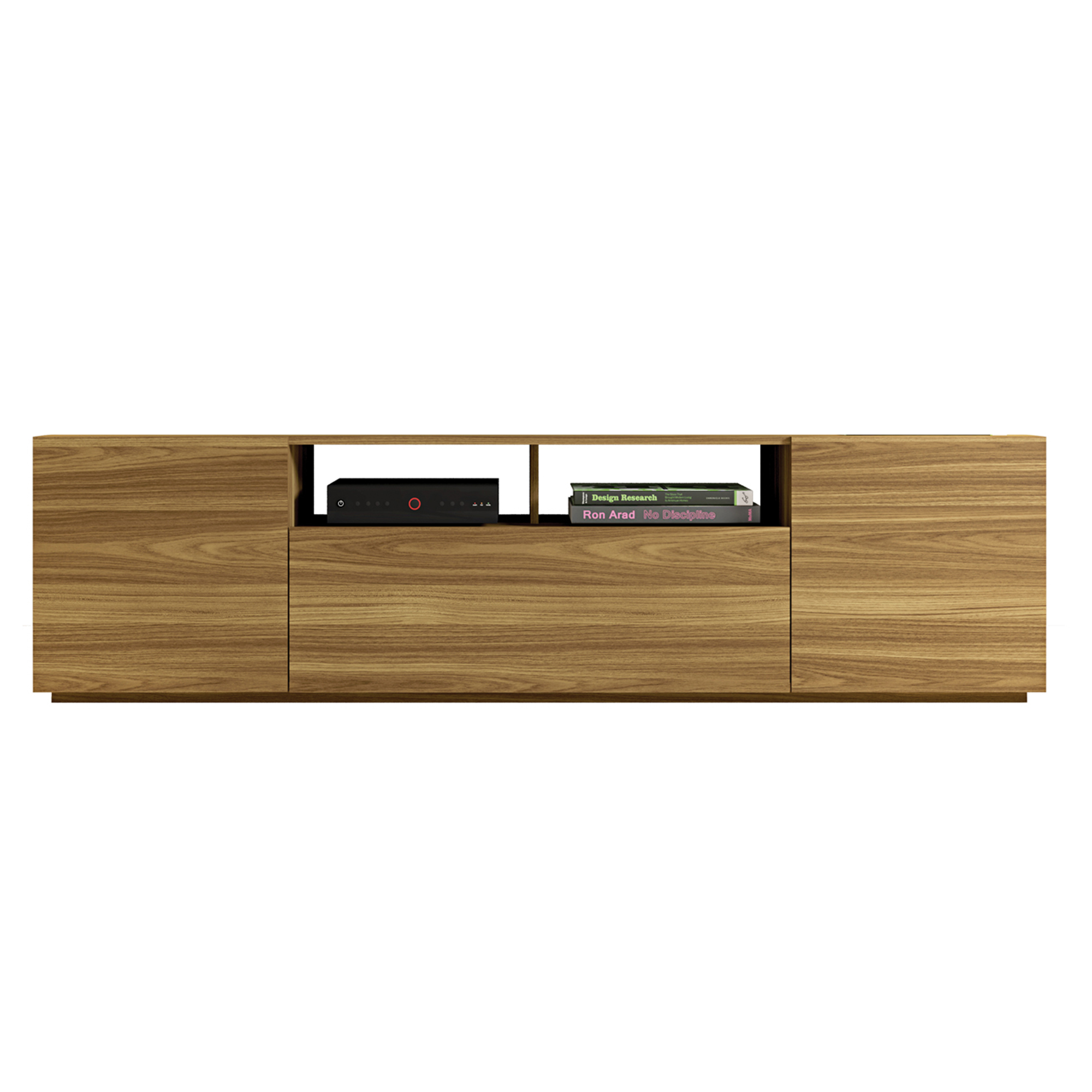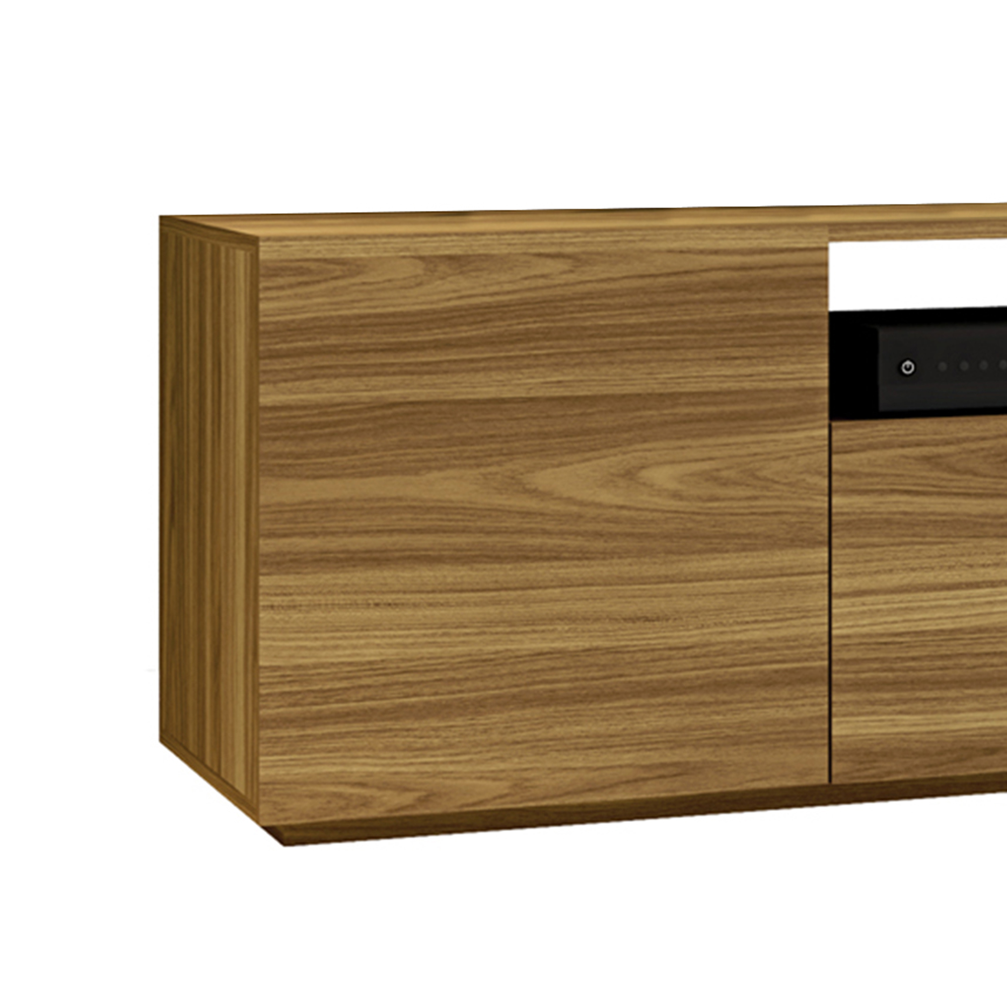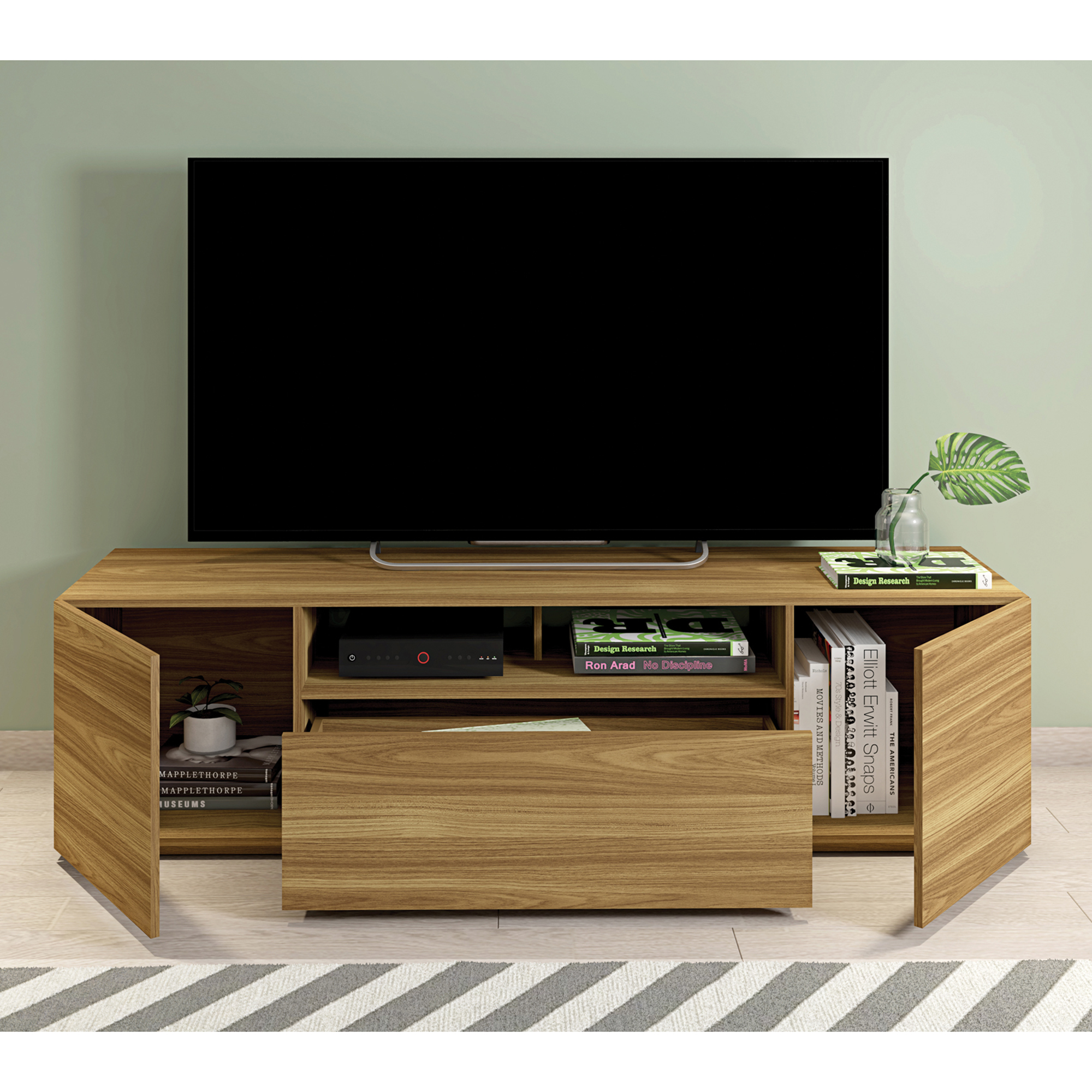Crafted with a deeply natural appeal, this TV media entertainment console is sure to add expressive character to any interior decor setting. Exhibiting replicated wood grain details for aesthetic appeal, it offers plenty of storage space behind two soft closing doors, one large center drawer, and two open compartments. Accented with a natural brown finish, the floating base provides utmost stability to the overall structure.