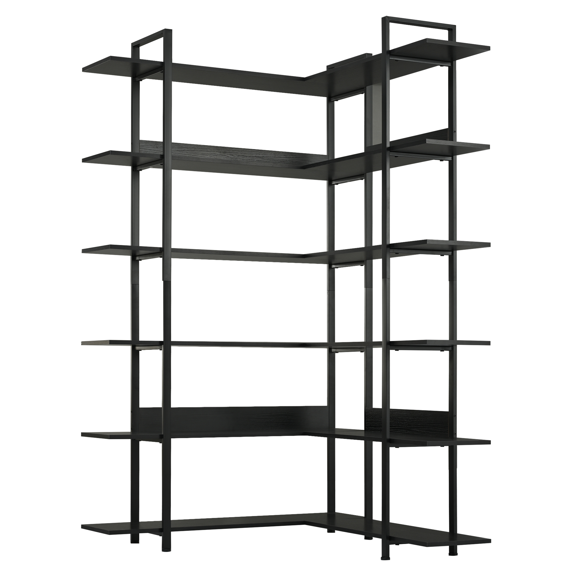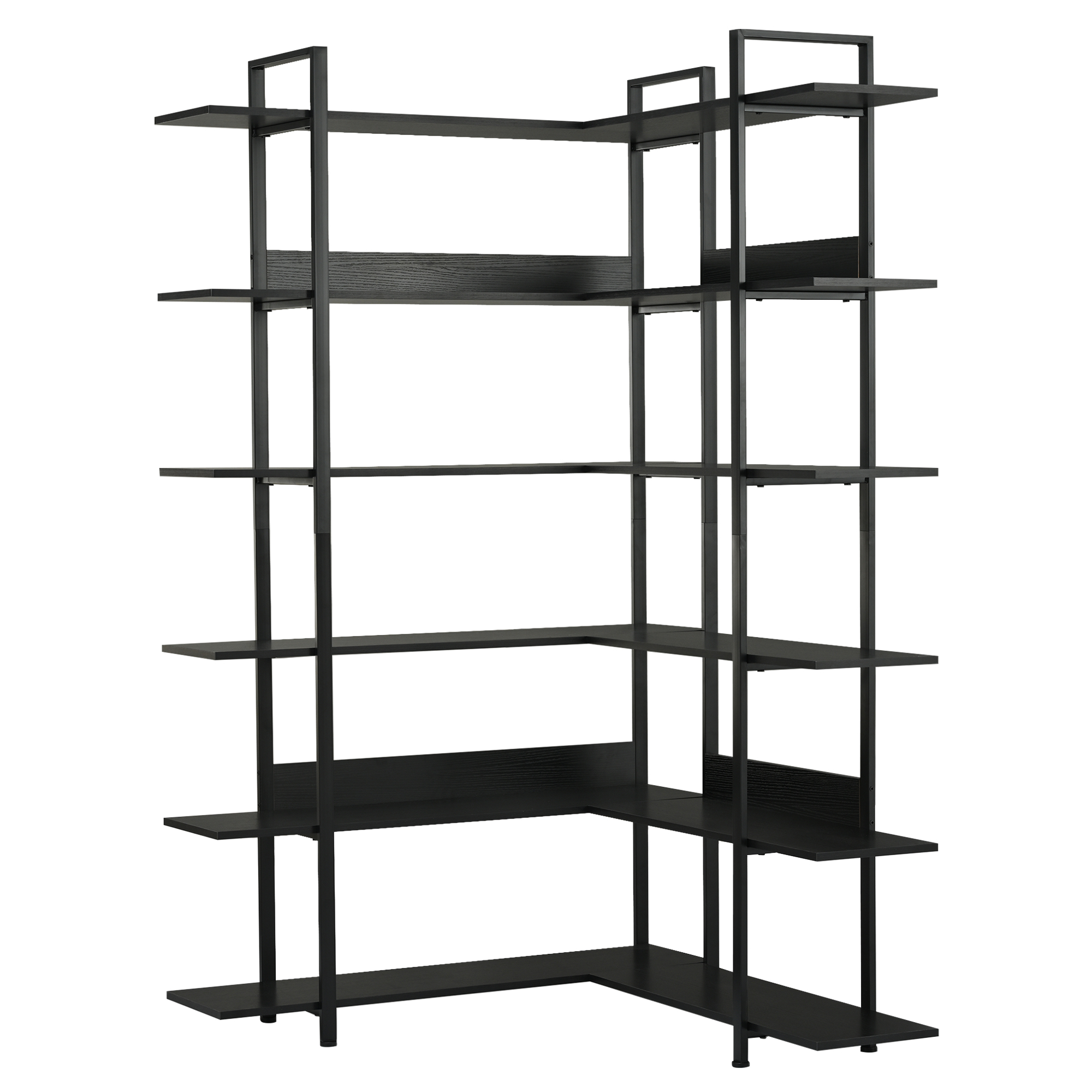 This bookshelf, in an L-shape design, can perfectly fit the corner of the room and efficiently use the space. The second and fifth floors of this bookshelf are set up with back baffles to prevent items from falling, practical and elegant. Wood appearance and metal frame construction, are suitable for many different home decoration styles.