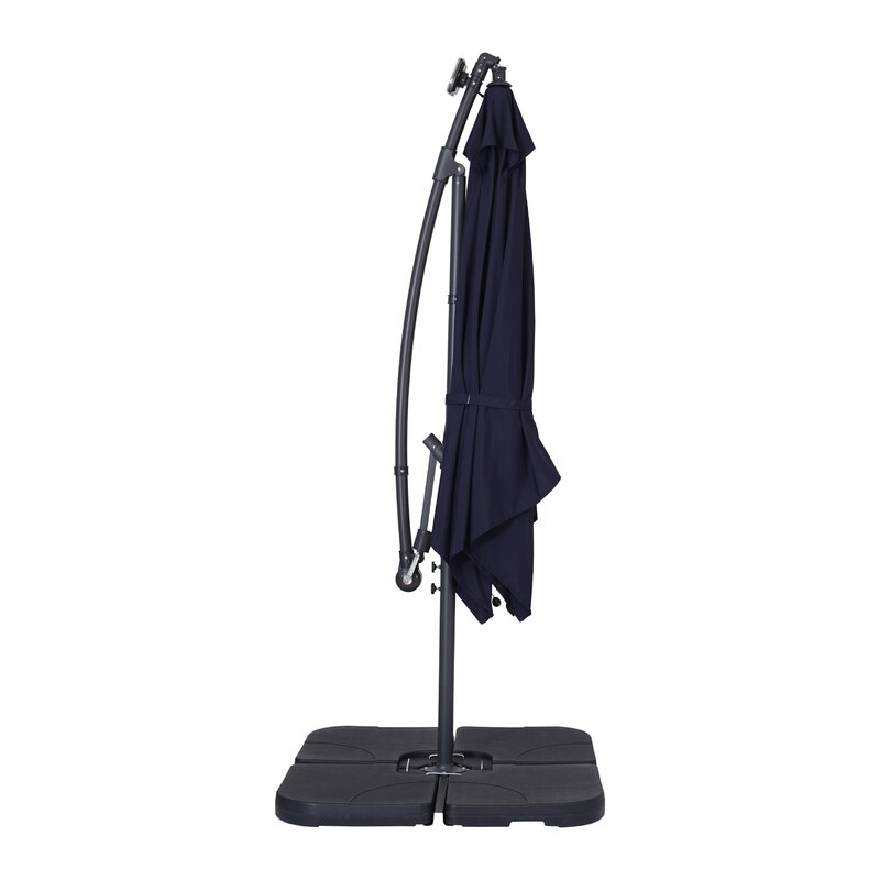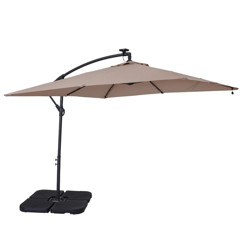 Our beautiful patio Hanging umbrella enables you to enjoy an outdoor relaxing time in the hot summer with great shade. Made of solid and durable iron and aluminum parts, this outdoor offset umbrella can adapt to the harsh outdoor climate. The canopy which is made of durable solution-dyed fabrics is waterproof and UV resistant. 32 LED Rib Lights and a central hub light powered by solar rechargeable batteries provide ambient mood lighting. It's perfect for gardens, balconies, decks, swimming pools, or cafes.