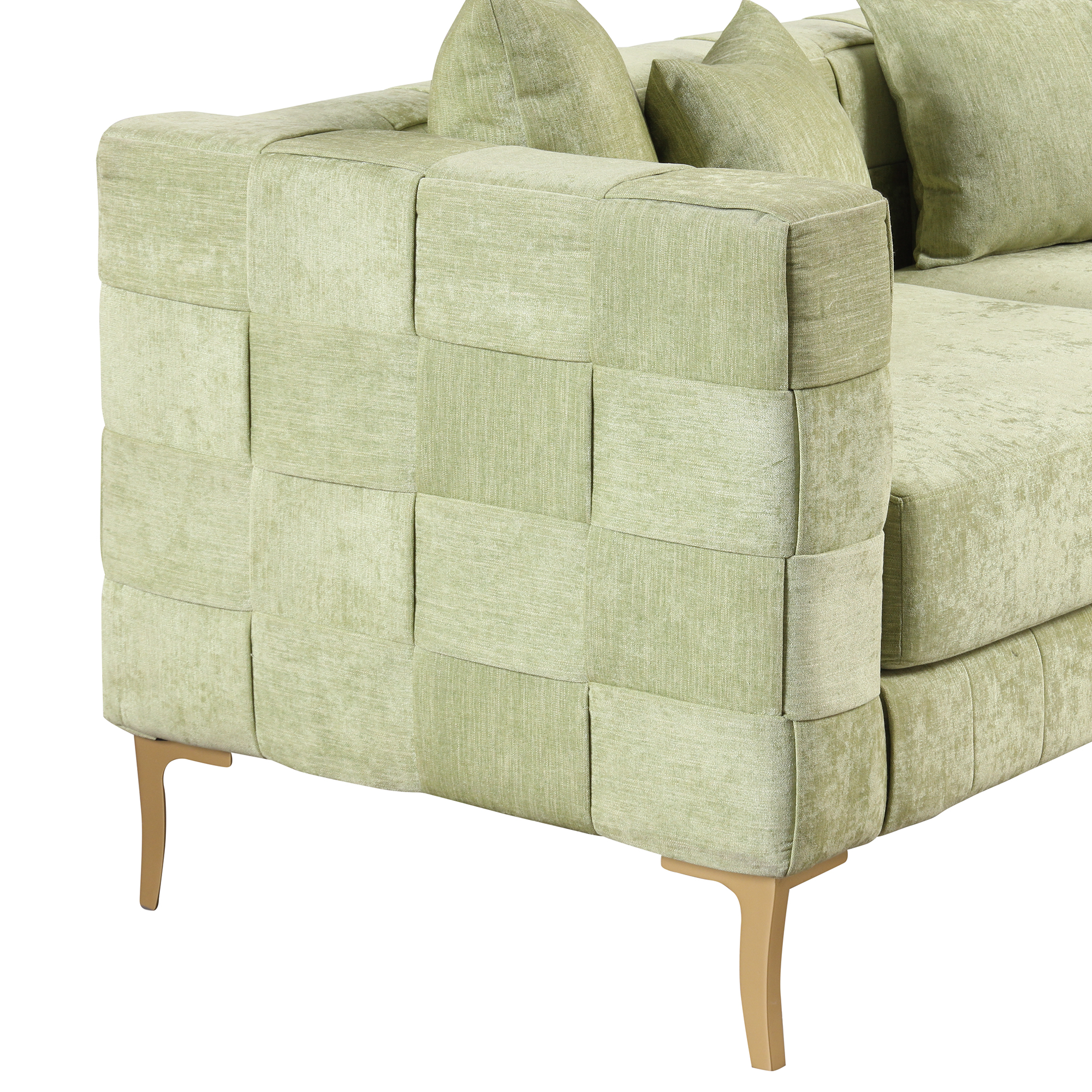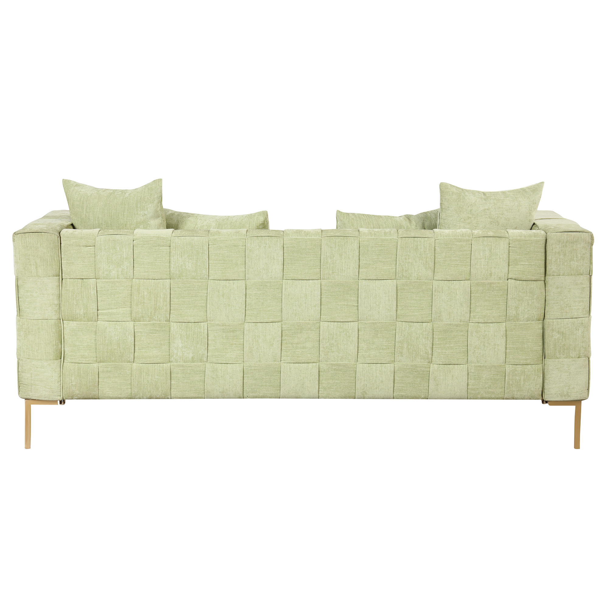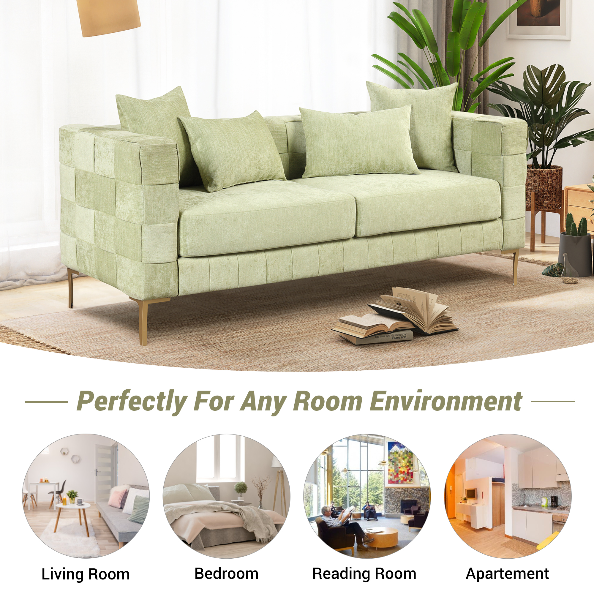 【Modern Design Sofa】 The sofa combines the unique weaving design with clean lines of modern style to create your favorite piece of sofa. This collection has both classic designs and modern aesthetics to perfectly complement your living room, bedroom, and any other spaces. 【Comfy Cushion】Lean back and let your worries drift away as you relax against the fine chenille material constructed cushions of this stylish sofa. Thickened foam core provide extra comfort and support, easily regain their shape when you rise. 【Sturdy and Durable】You don' t have to worry about its durability! Our sofa features a plywood frame and metal legs can easily support the weight of 300 lbs ( per seat ), insuring can be used for a long time.The sofa is easy to assemble, you can assemble the couch within 30 minutes.【4 Pillows Included】4 back pillows and wide track arms finish off the stylish design of this enjoyable sofa. Elevate your everyday space to a luxe getaway. The pillow cover with smooth zippers are removable for easy cleaning.