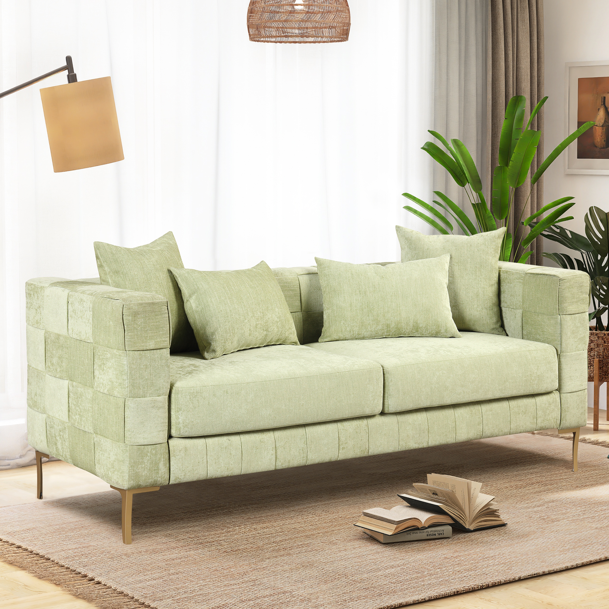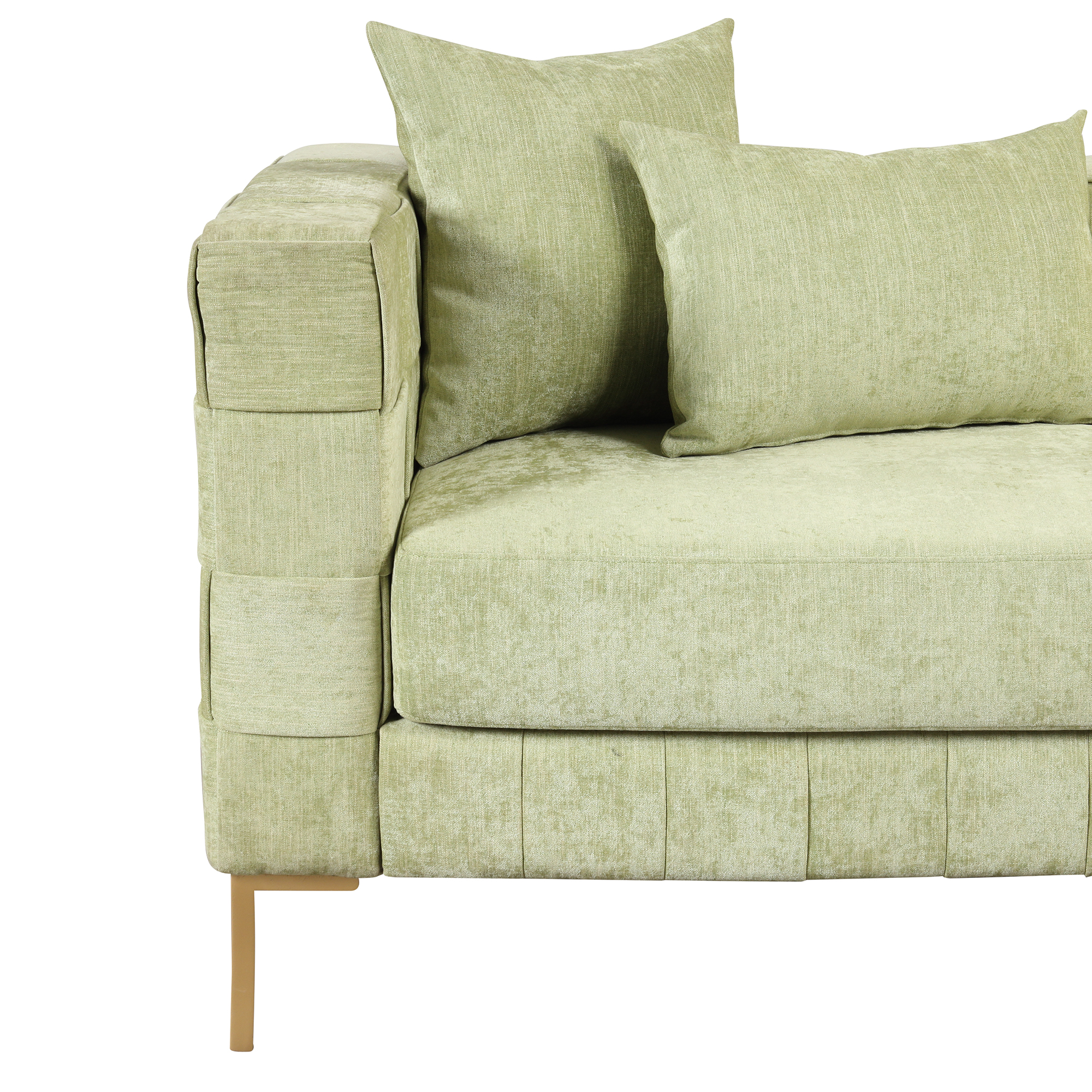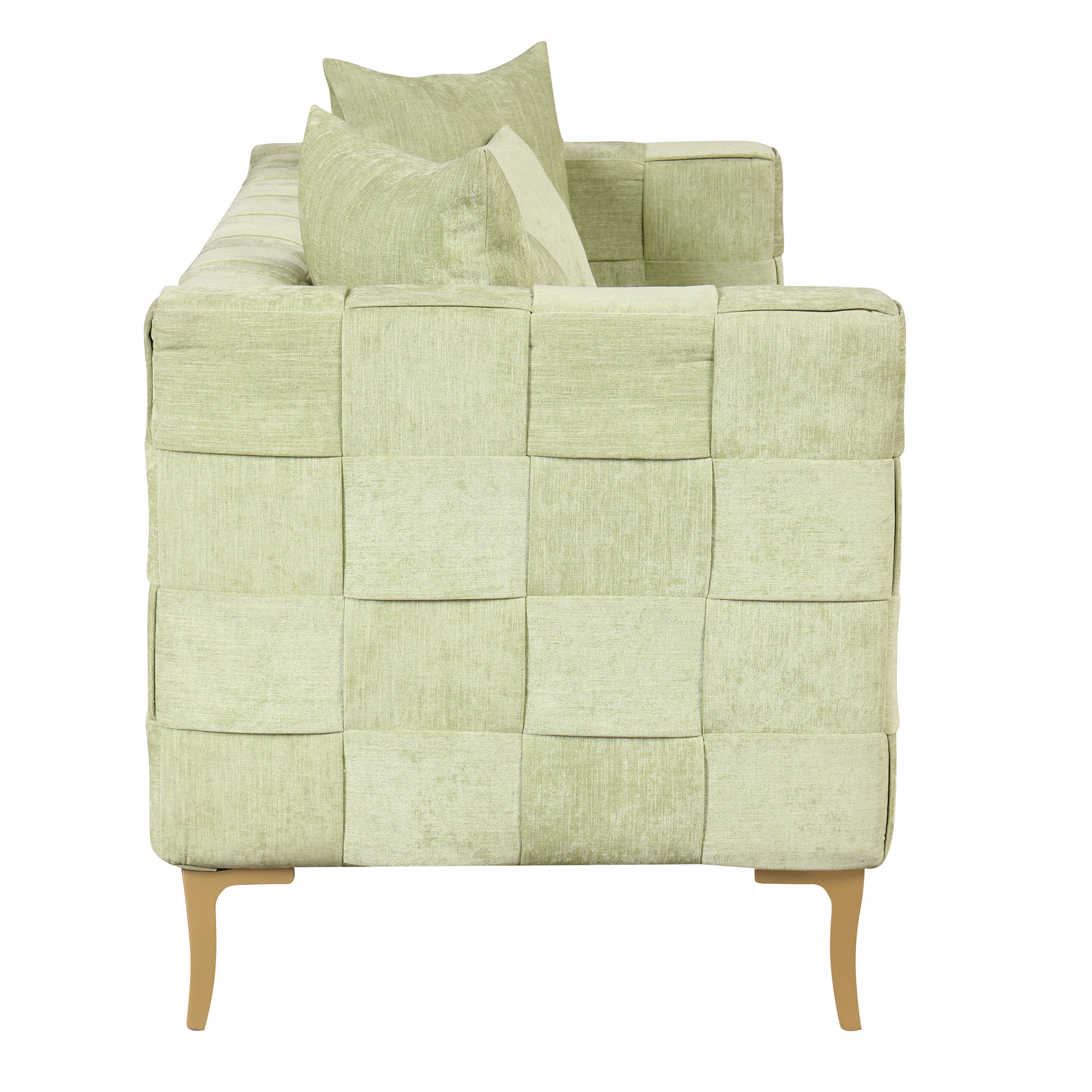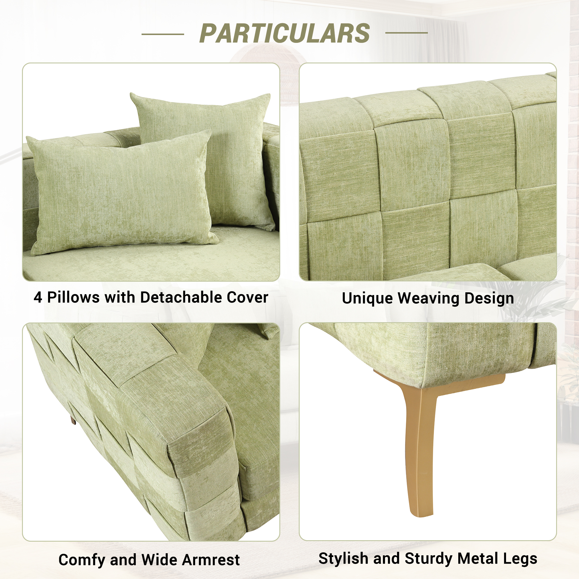 【Modern Design Sofa】 The sofa combines the unique weaving design with clean lines of modern style to create your favorite piece of sofa. This collection has both classic designs and modern aesthetics to perfectly complement your living room, bedroom, and any other spaces. 【Comfy Cushion】Lean back and let your worries drift away as you relax against the fine chenille material constructed cushions of this stylish sofa. Thickened foam core provide extra comfort and support, easily regain their shape when you rise. 【Sturdy and Durable】You don' t have to worry about its durability! Our sofa features a plywood frame and metal legs can easily support the weight of 300 lbs ( per seat ), insuring can be used for a long time.The sofa is easy to assemble, you can assemble the couch within 30 minutes.【4 Pillows Included】4 back pillows and wide track arms finish off the stylish design of this enjoyable sofa. Elevate your everyday space to a luxe getaway. The pillow cover with smooth zippers are removable for easy cleaning.