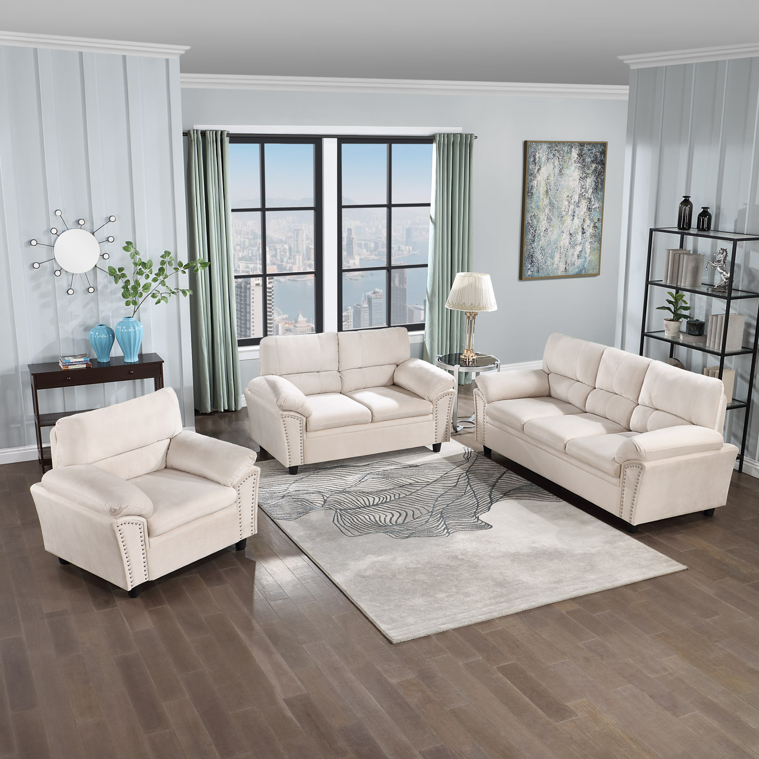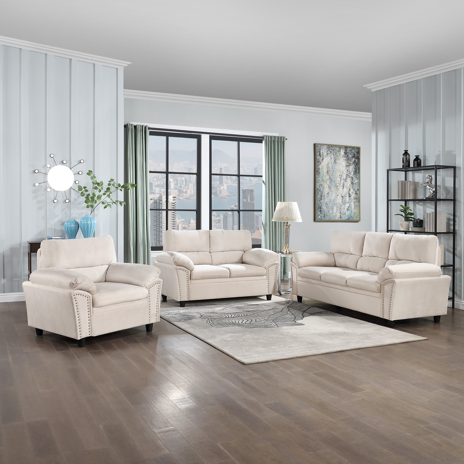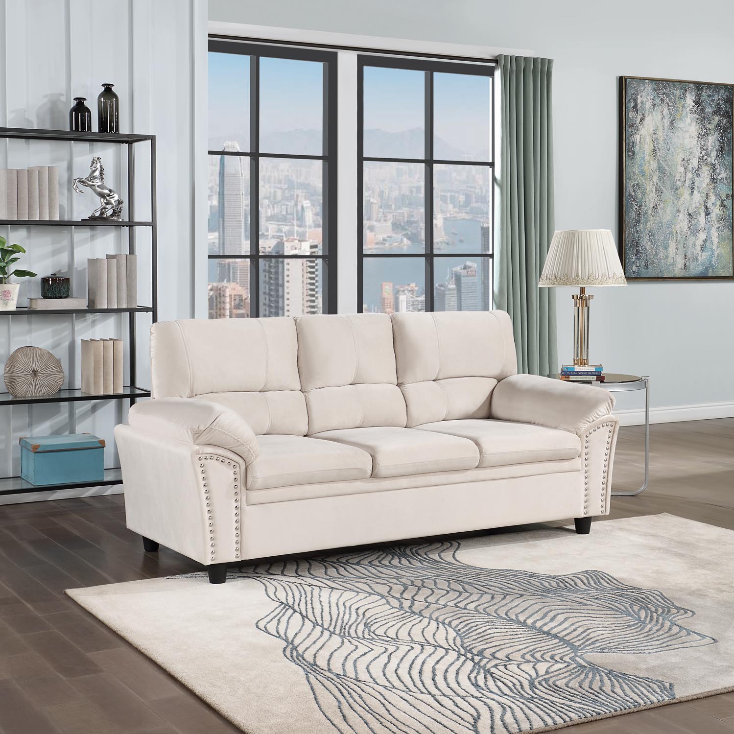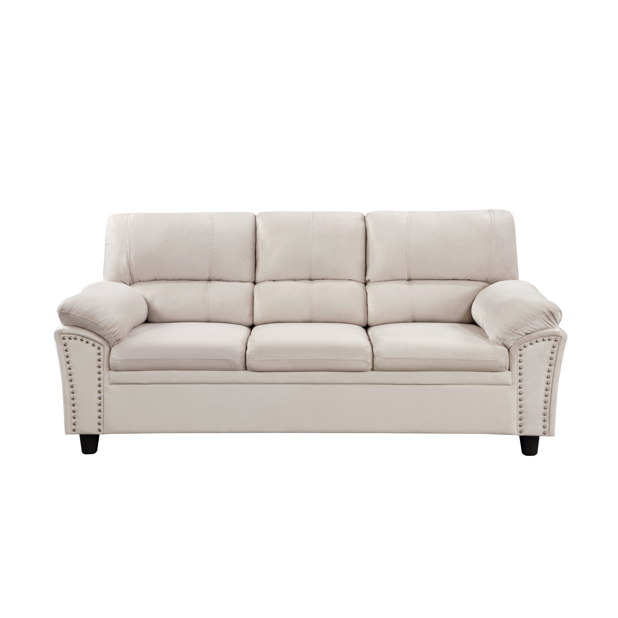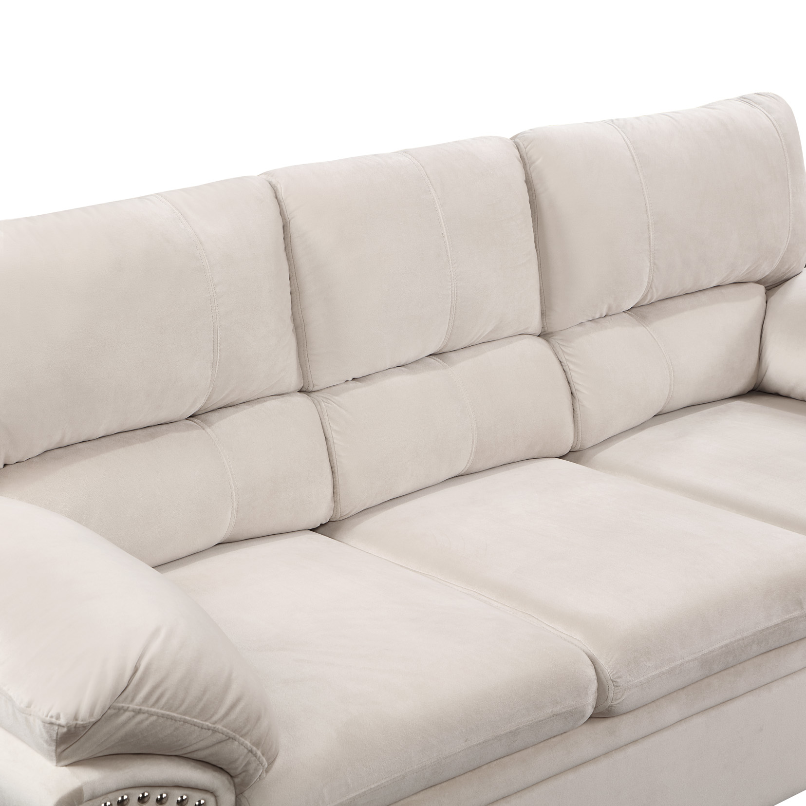 This sofa with velvet and decorative rivets. Be it a single seater, two seater or three seater, this customizable furniture can be combined to fit in any space for any purpose! Whether used for relaxation, conversation, or entertainment, this sofa is sure to create an inviting ambience.