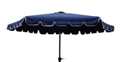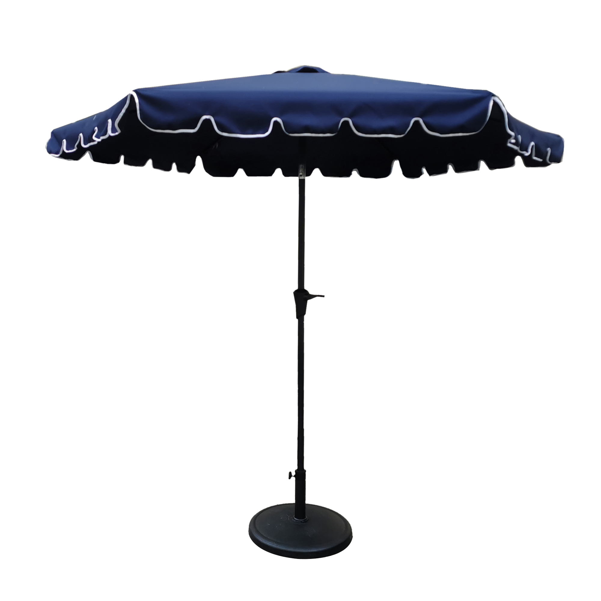 The 9' Scalloped Edge Patio Umbrella will provide plenty of shade on a hot sunny day. It is contains 6 steel ribs. The umbrella features a crank handle and tilt option. The base made from poly resin, this piece is rust-resistant and made to last for years. Enjoy this stylish addition to any patio and outdoor space while minimizing your sun exposure. Water-resistant polyester canopy which protects you to expose under the sun. Rust-resistant powder coated aluminum pole which is sturdy and strong. 6 pcs steel rib in oval shape. Diameter aluminum pole with crank and push button tilt. "Opening Mechanism: Crank Lift Tilt: Yes "Opening Mechanism: Crank LiftTilt: YesStand Included: NoIncluded Rotation: NoAdjustable Height: No" Dimension: (W) 106.3 in. x (D) 106.3 in. x (H) 90.55 in.Stand Included: NoIncluded Rotation: NoAdjustable Height: No" Dimension: (W) 106.3 in. x (D) 106.3 in. x (H) 90.55 in.