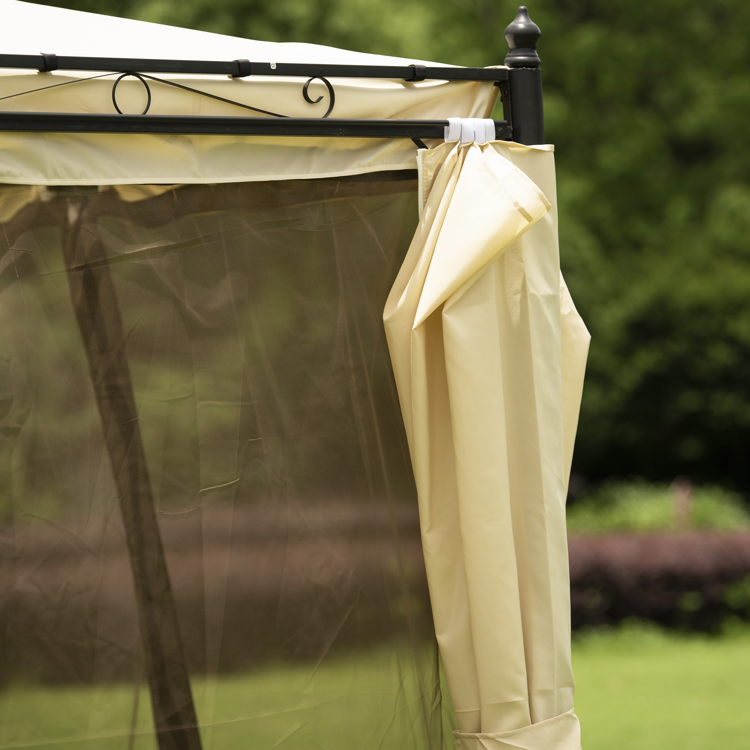 Side Walls with Netting---All sides have see-thru mosquito-netting walls and outer curtains so that small mosquitoes or insects can be kept out to offer more comfort and privacy. Double-side zippers in the nets and curtains make entry out or in easier. All of them also come with velcro straps for fastening and cloth straps for fixing the poles when not in use.
