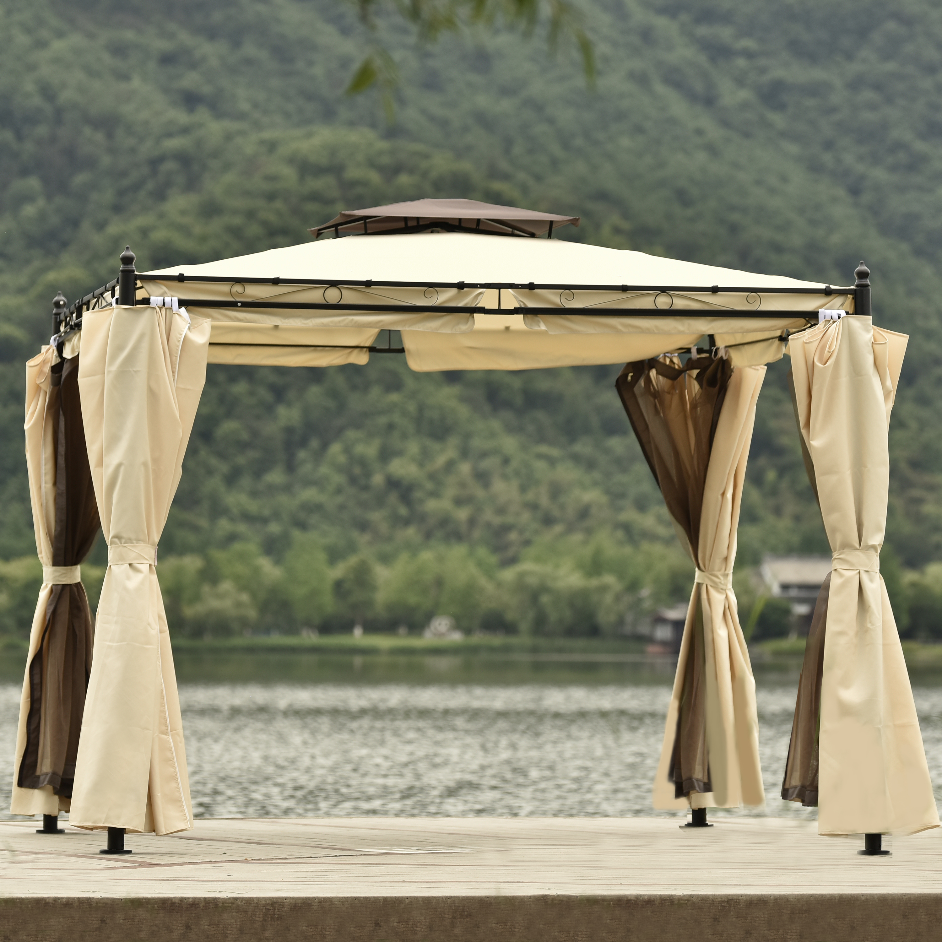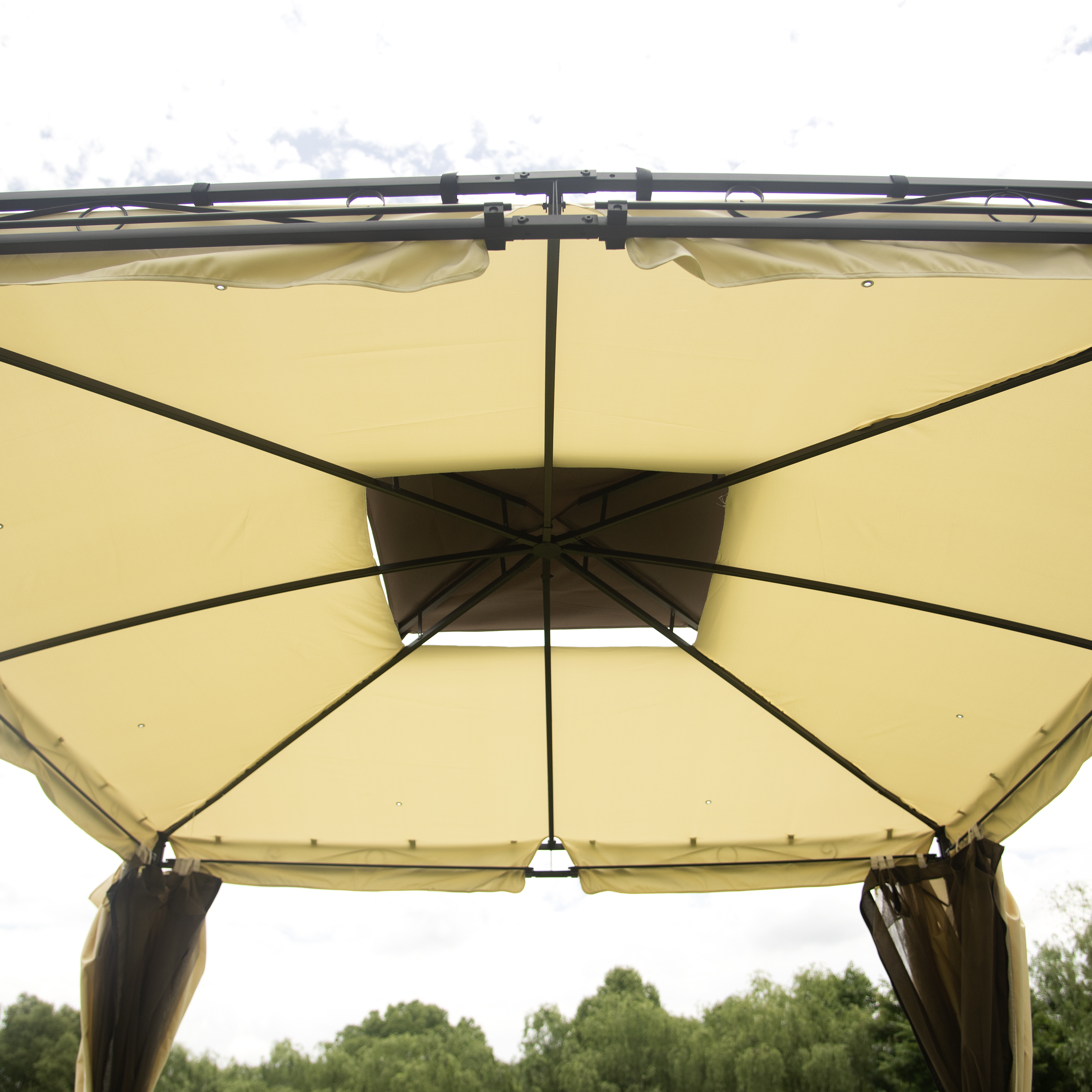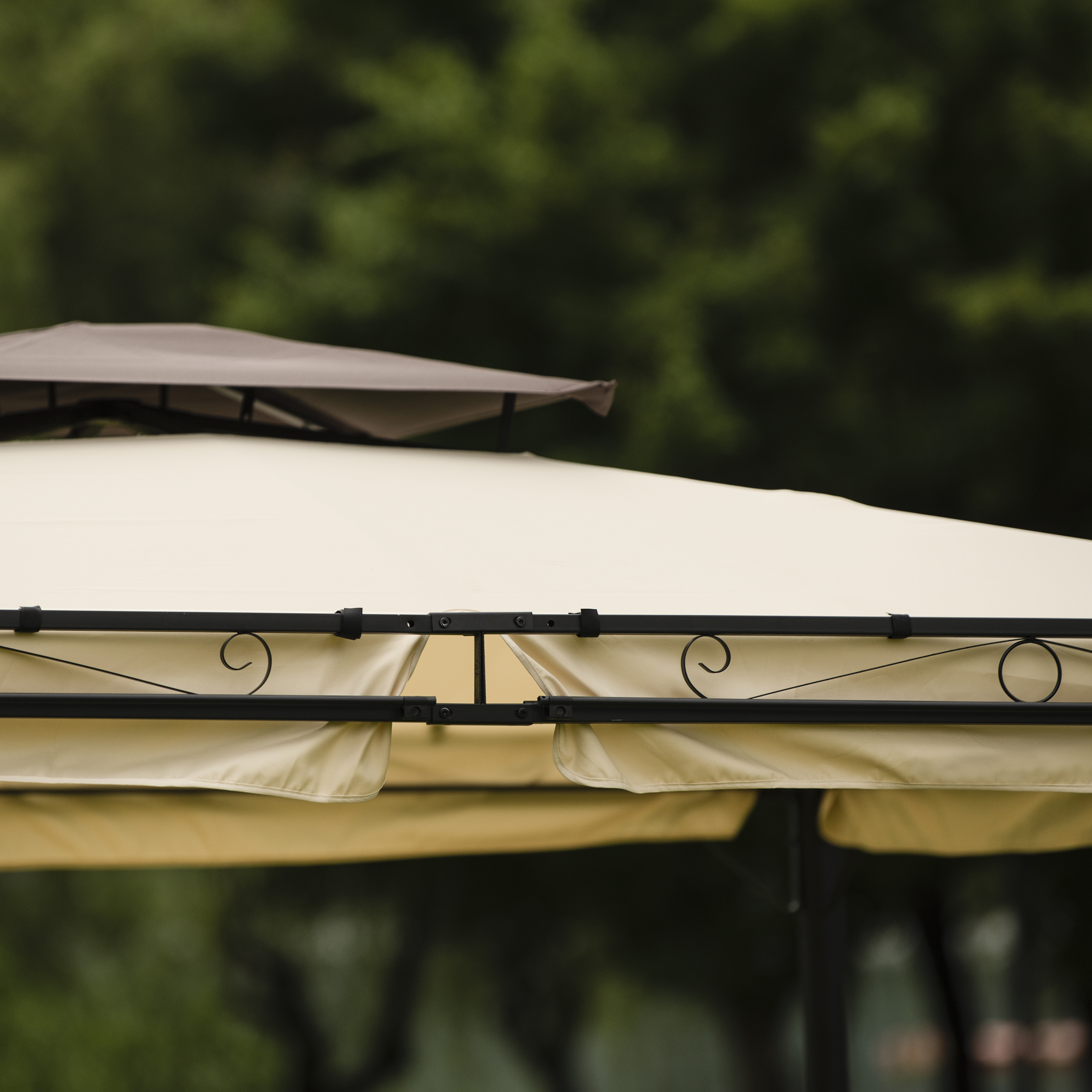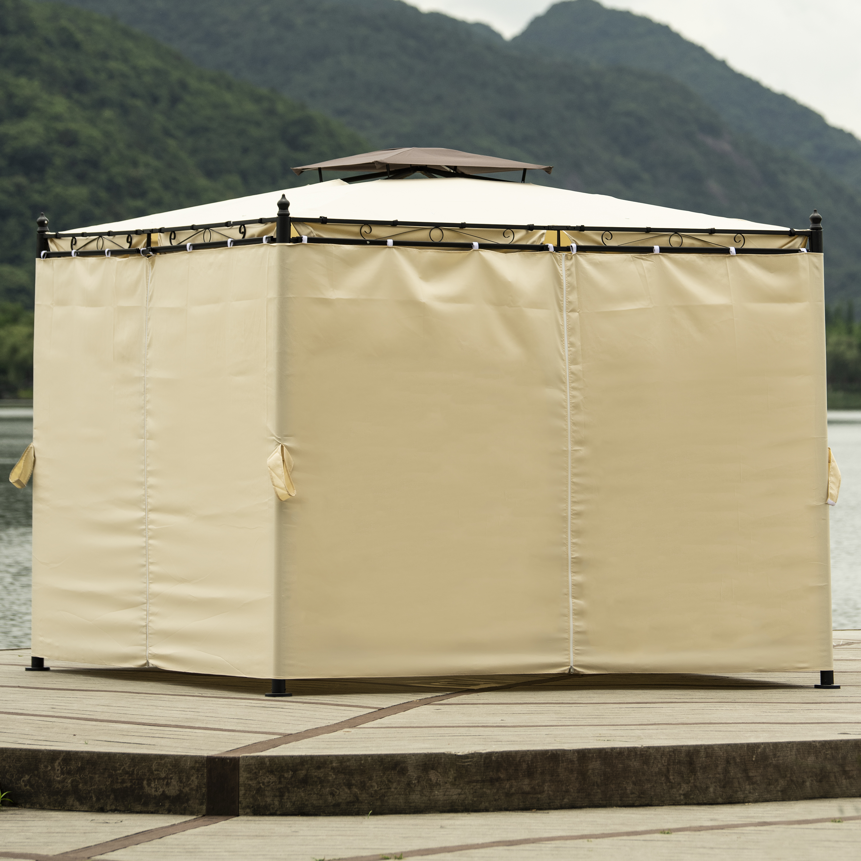 Double Vented Tops---Our gazebo roofs are covered with 180g/�polyester coated with PU paint for water resistance. Designed with 2-tier roofs, it improves air circulation while keeping stable on windy days. 8 built-in holes in the canopy offer better drainage to avoid water accumulation in the rain.
