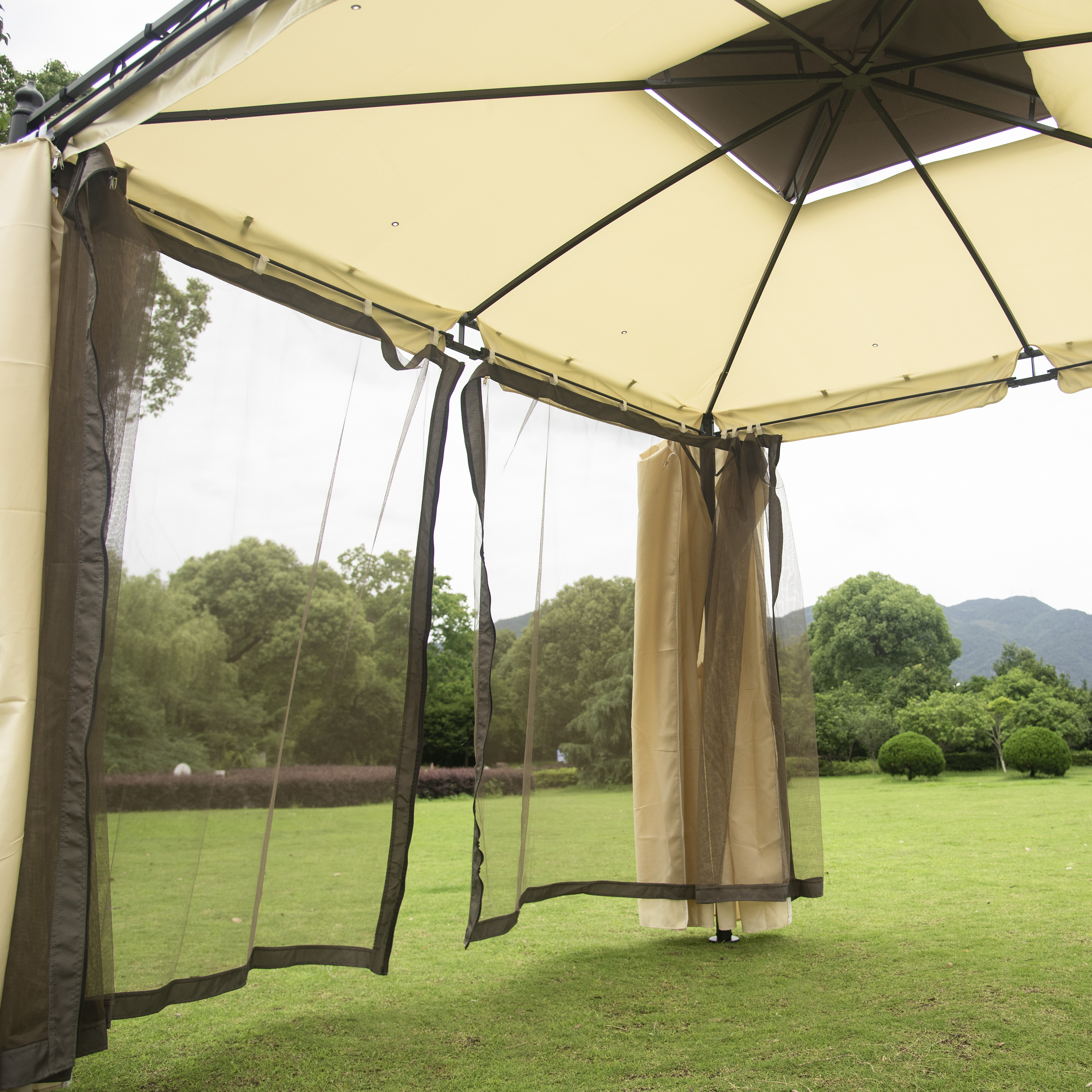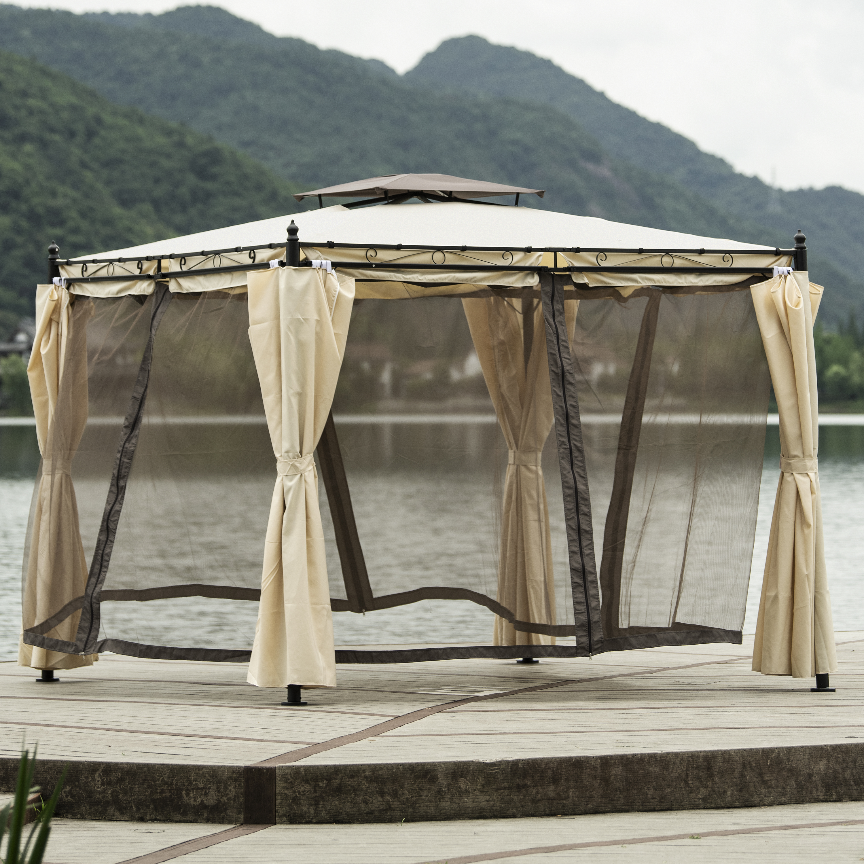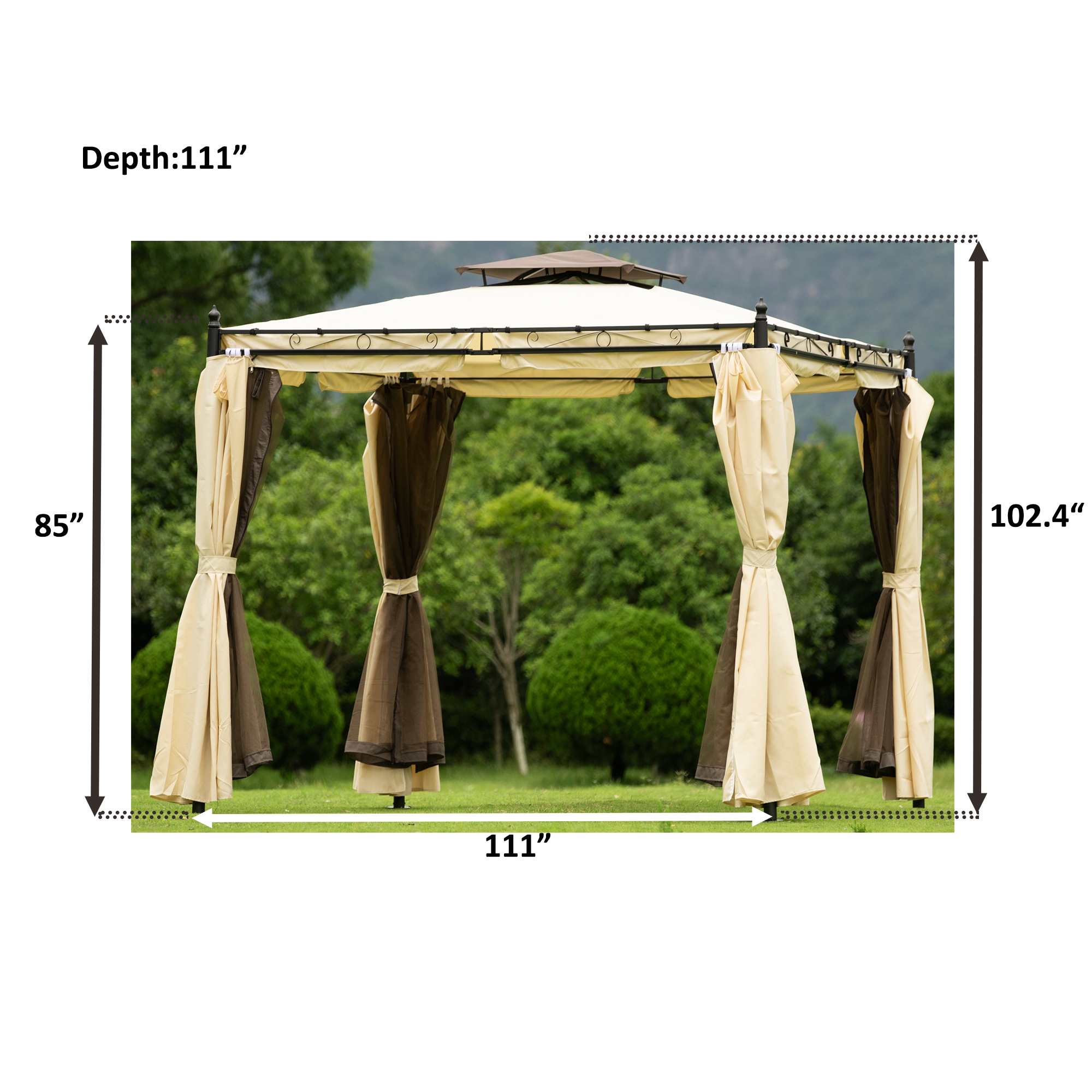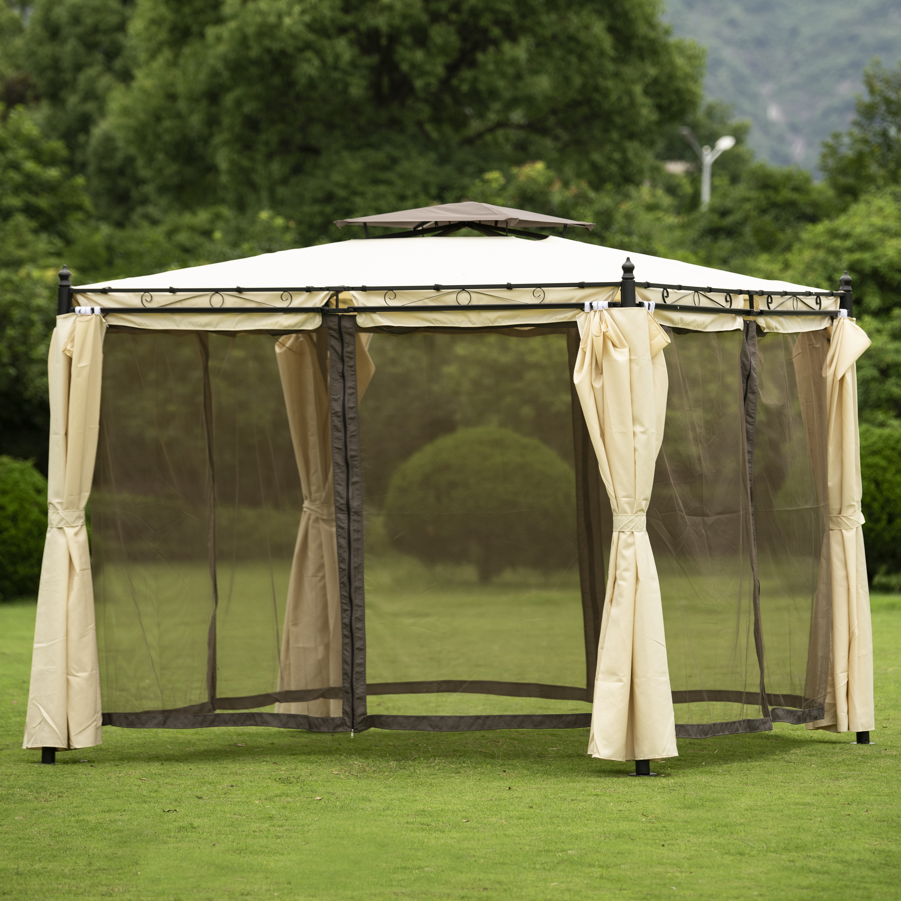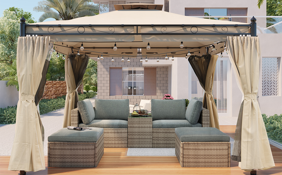 9.3ft.Lx9.3ft. WOutdoor Patio Gazebo with Mosquito nets and Polyester Curtains, Double Roofs for Decks, Poolsides, Gardens, Beige