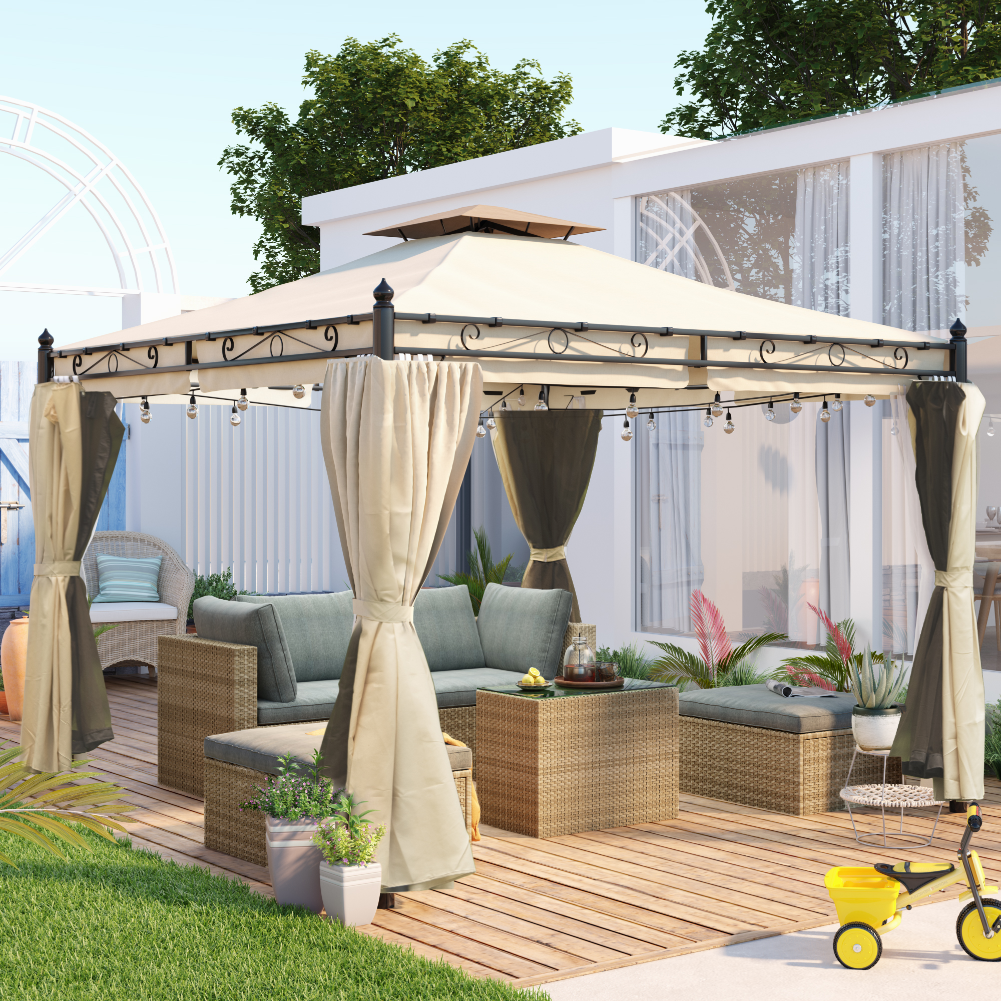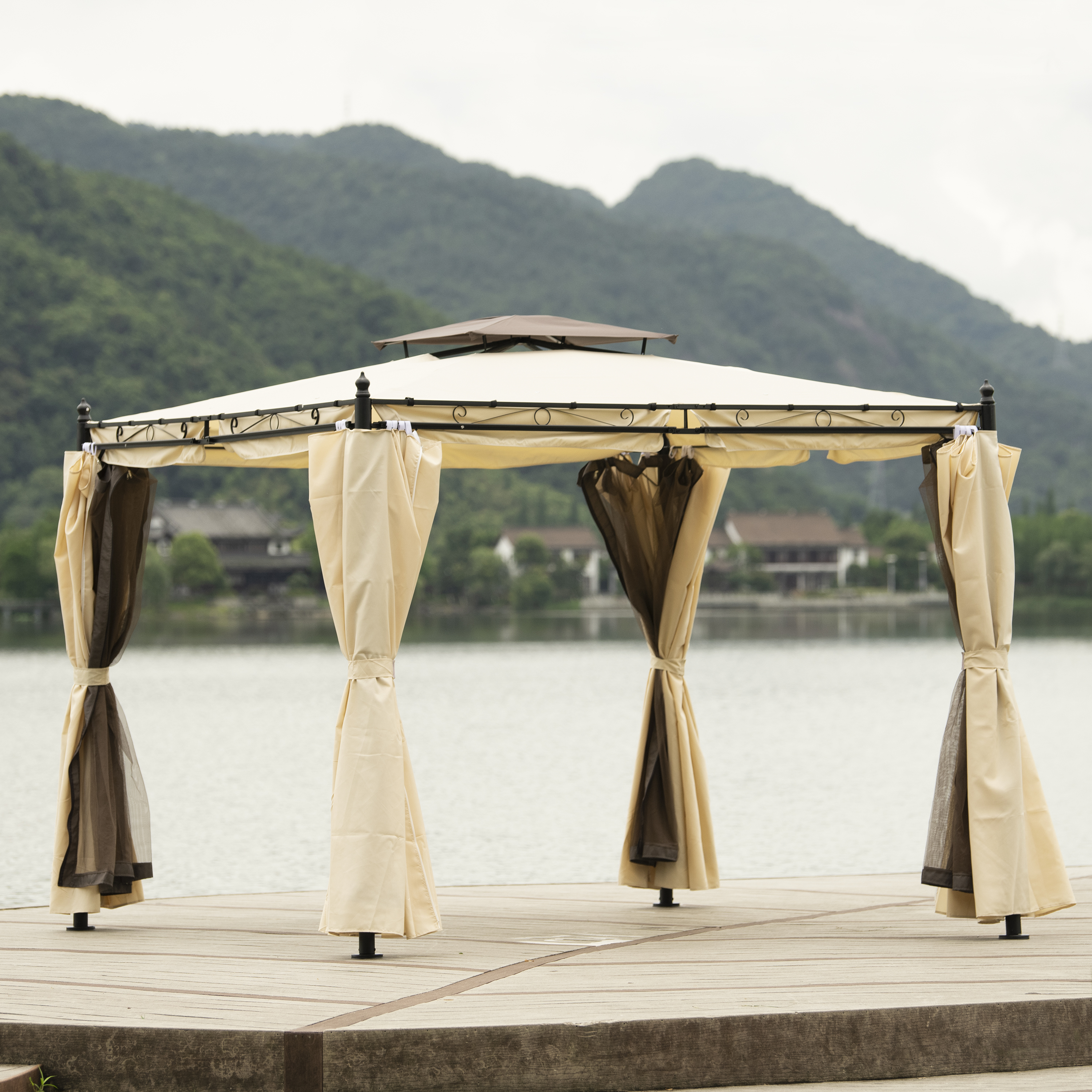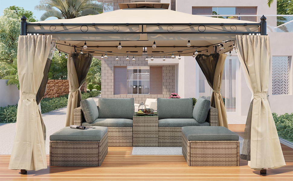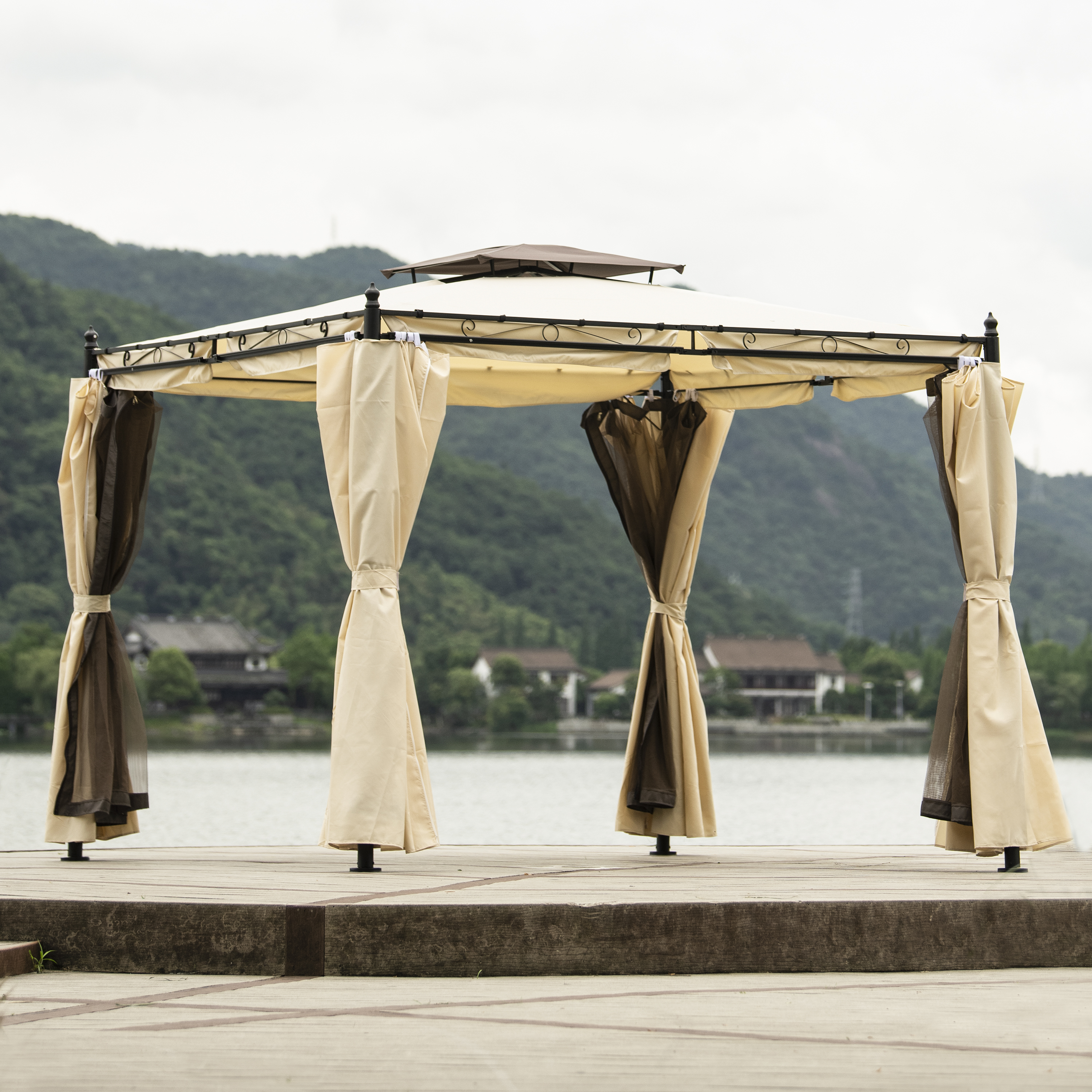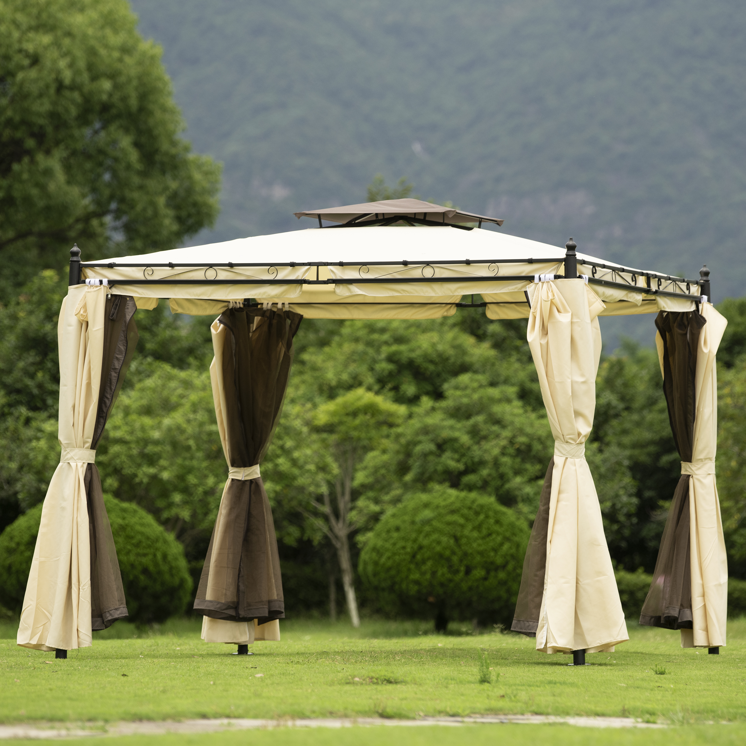 9.3ft.Lx9.3ft. WOutdoor Patio Gazebo with Mosquito nets and Polyester Curtains, Double Roofs for Decks, Poolsides, Gardens, Beige
