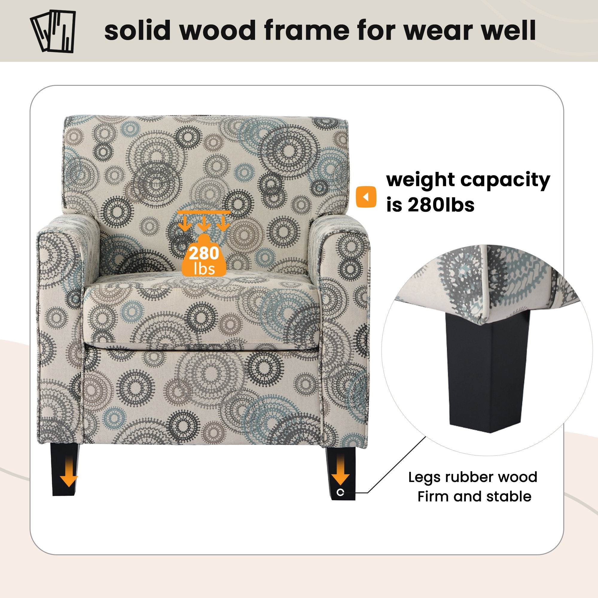 - Solid frame and leg. Seat cushion filled with foam and inner spring for durability and comfort.