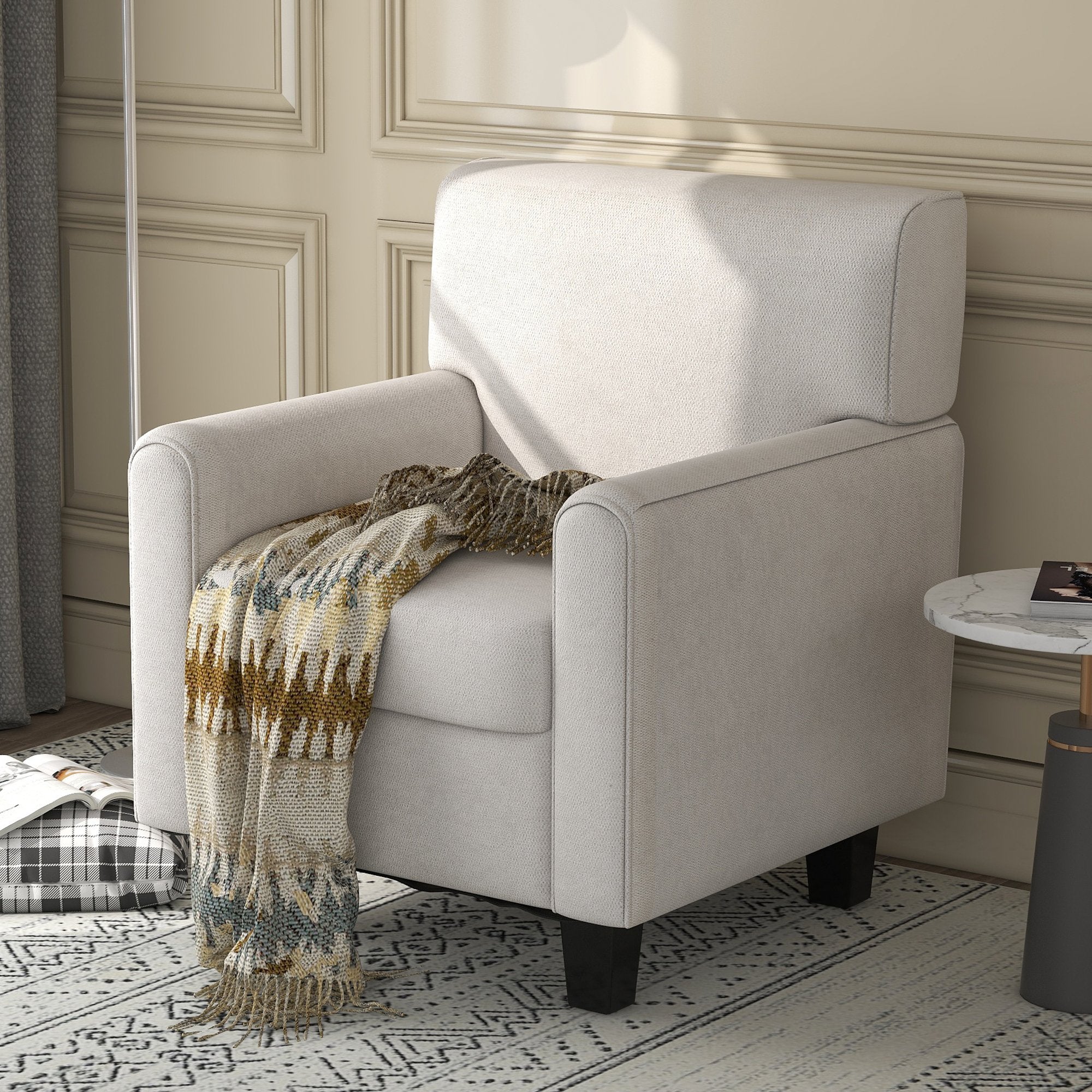 - It comes wrapped in your choice of linen upholstery for a touch of texture, while button tufts along the back emphasize the traditional aesthetic of this chair. Plus, we love that the polyester filling in the cushions gives you a hint of support as you sit.