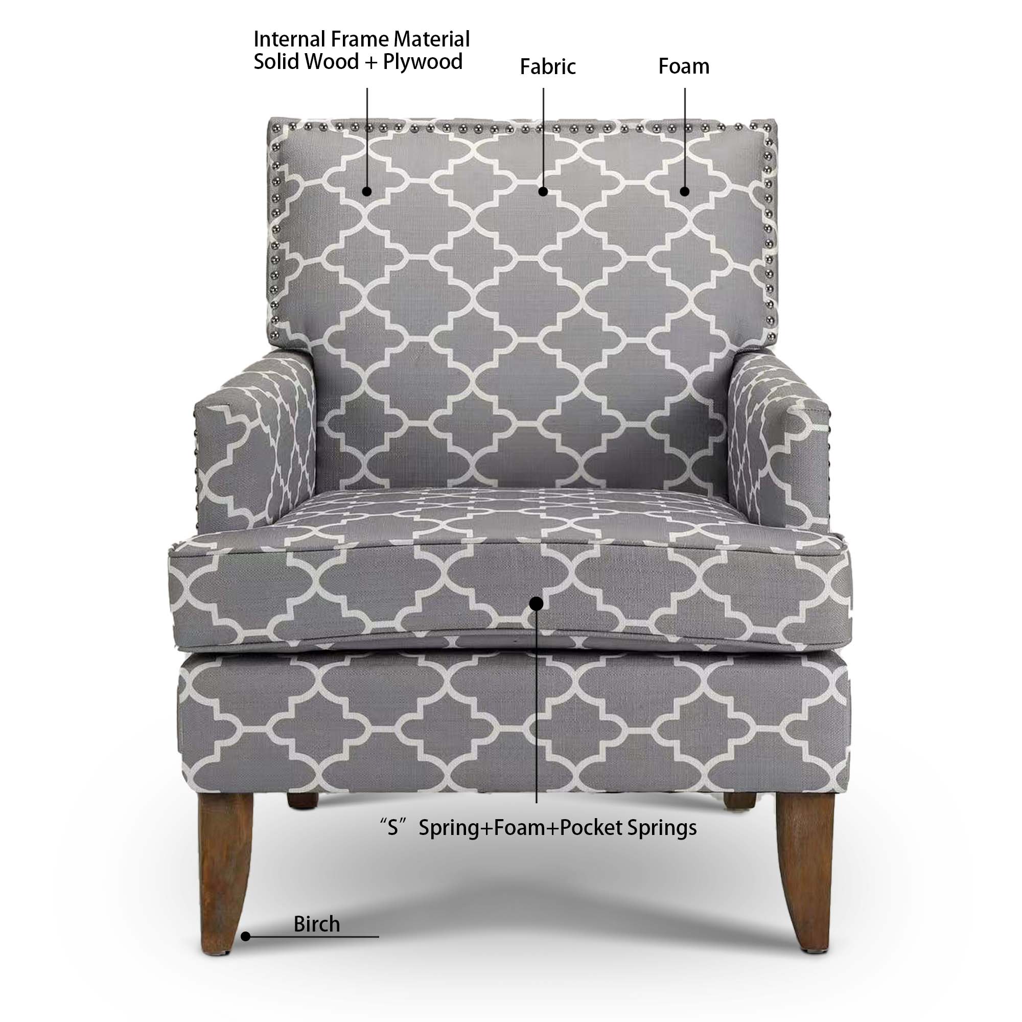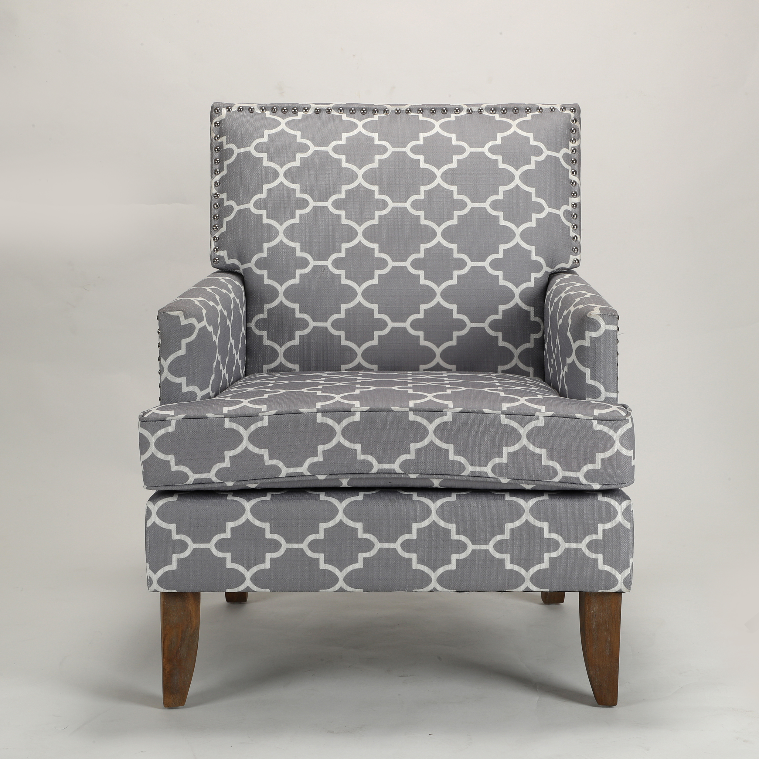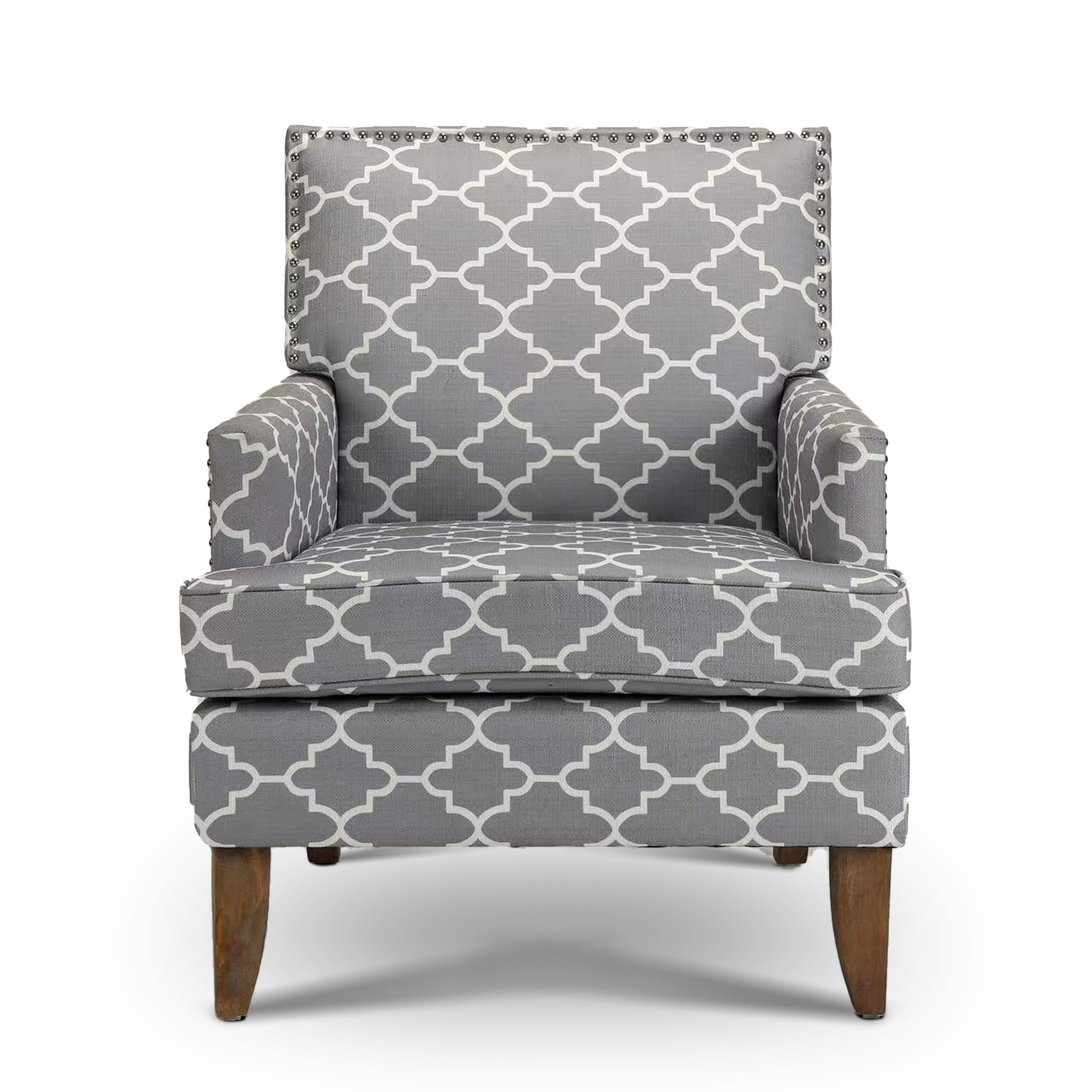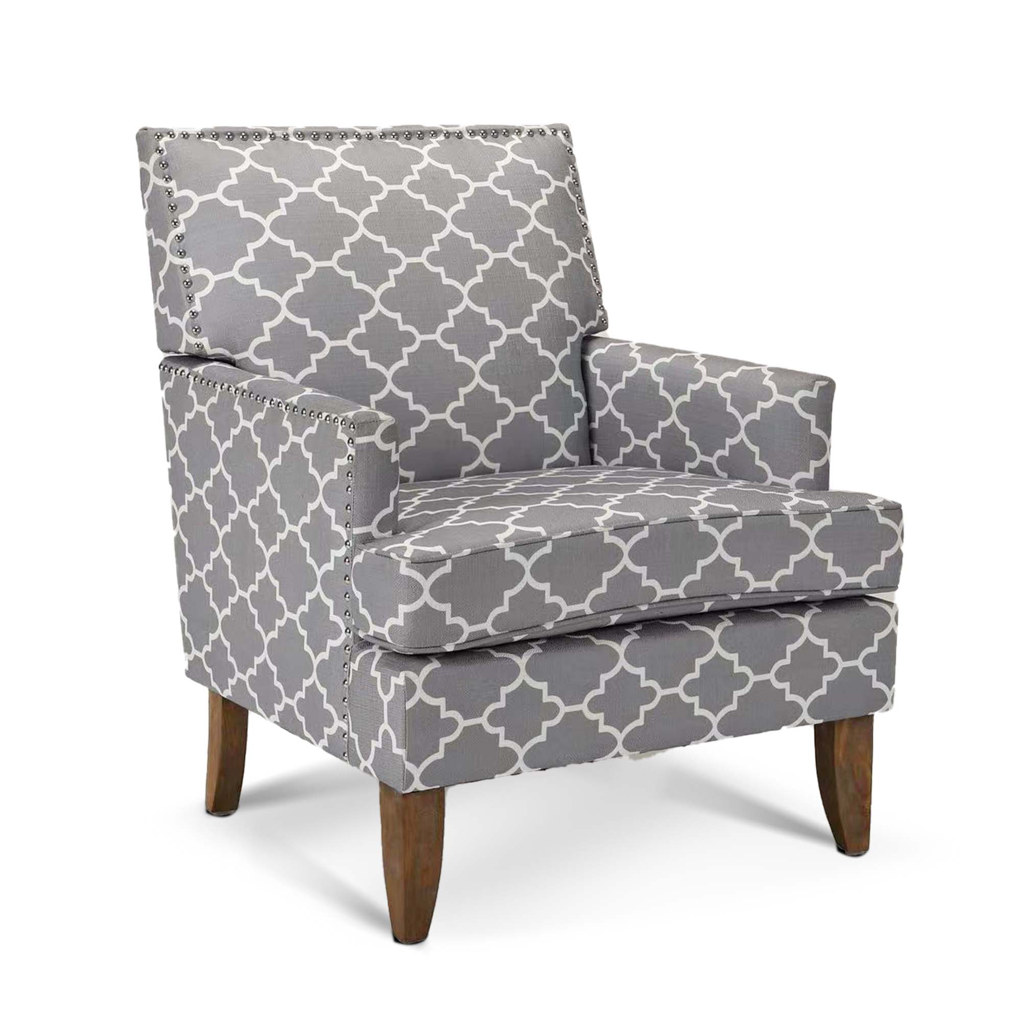This armchair brings a traditional style to your office or living room. It's built with plywood and a solid wood frame that sits on tapered legs with an ancient walnut hue, while its square arms and tight back showcase polyester blend upholstery. The printed fabric pattern features a design. The seat is filled with foam for just the right amount of support. We love how metallic nailhead trim adds a dash of refined style.