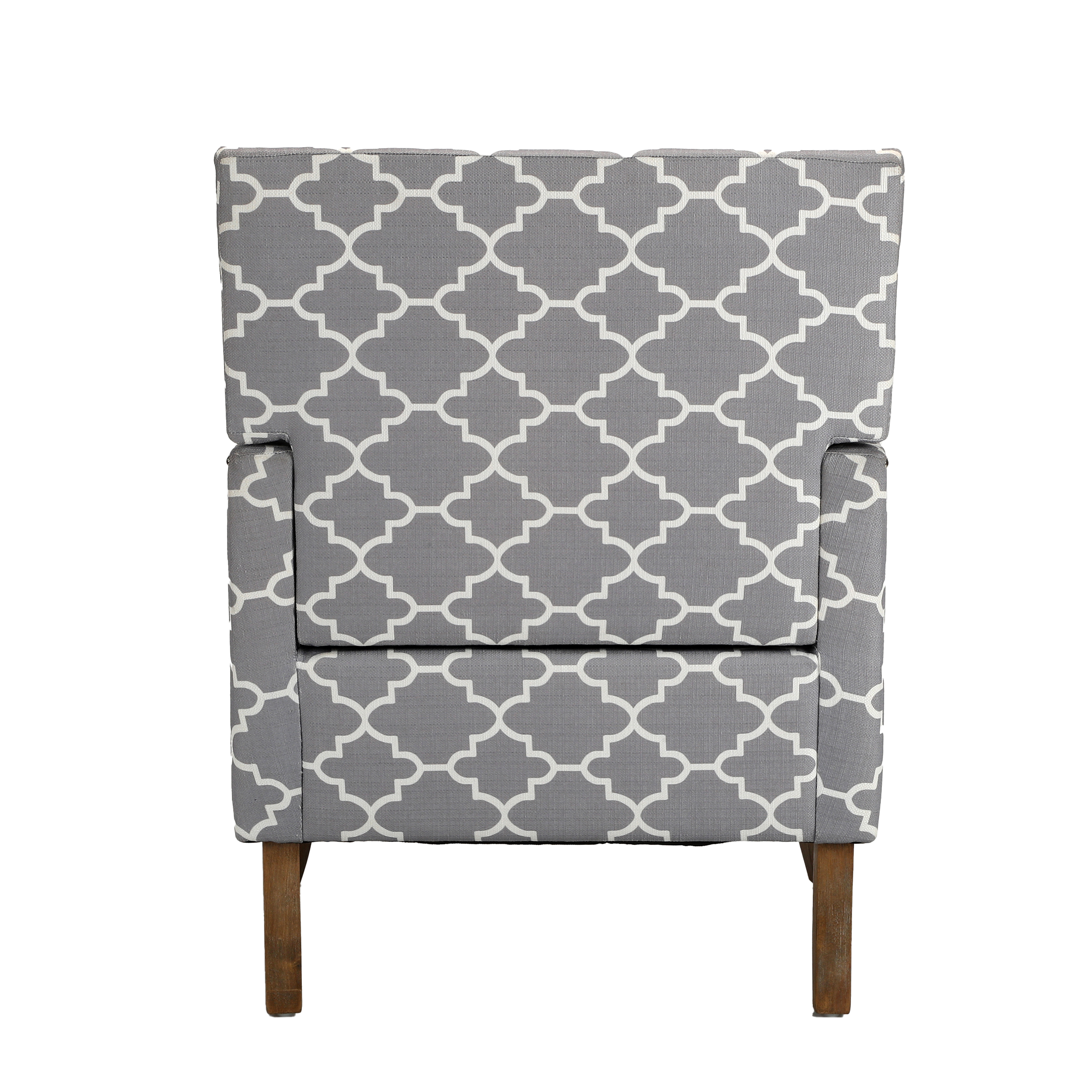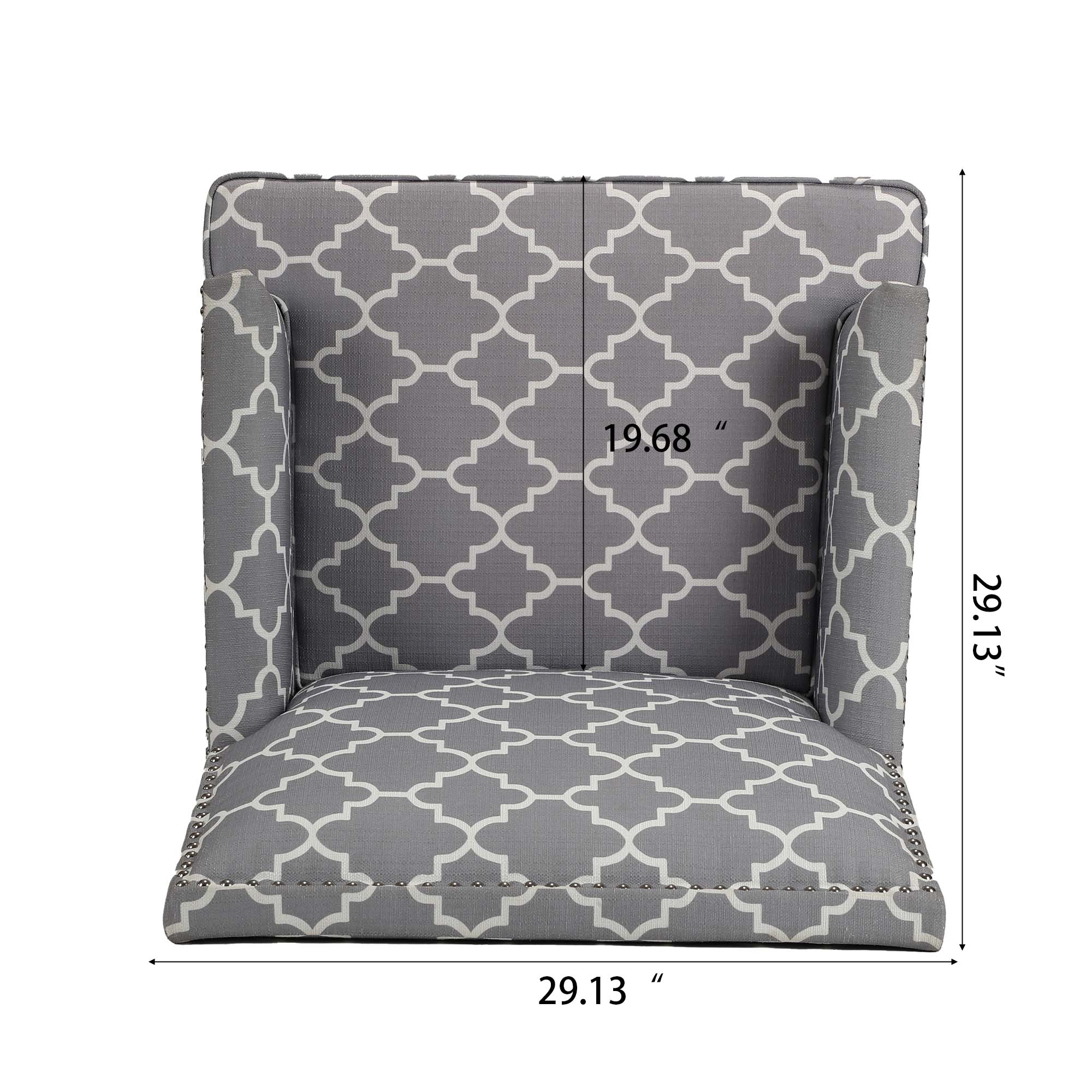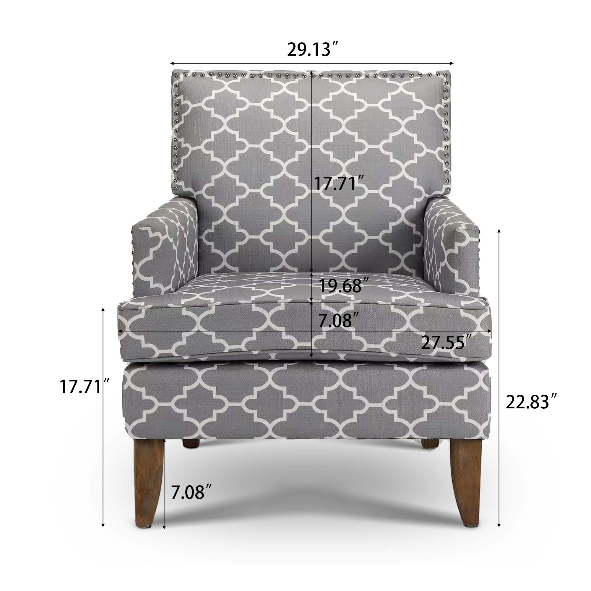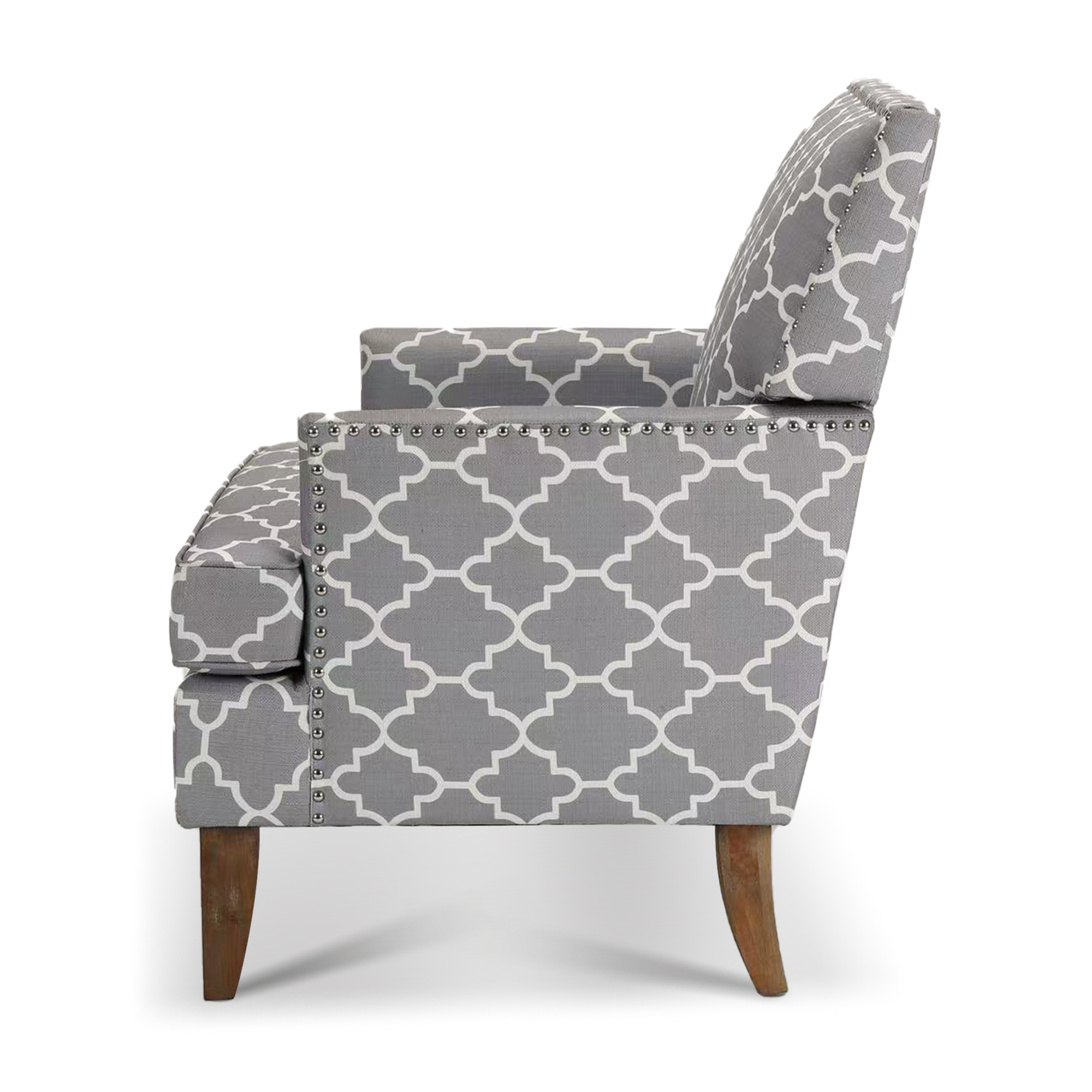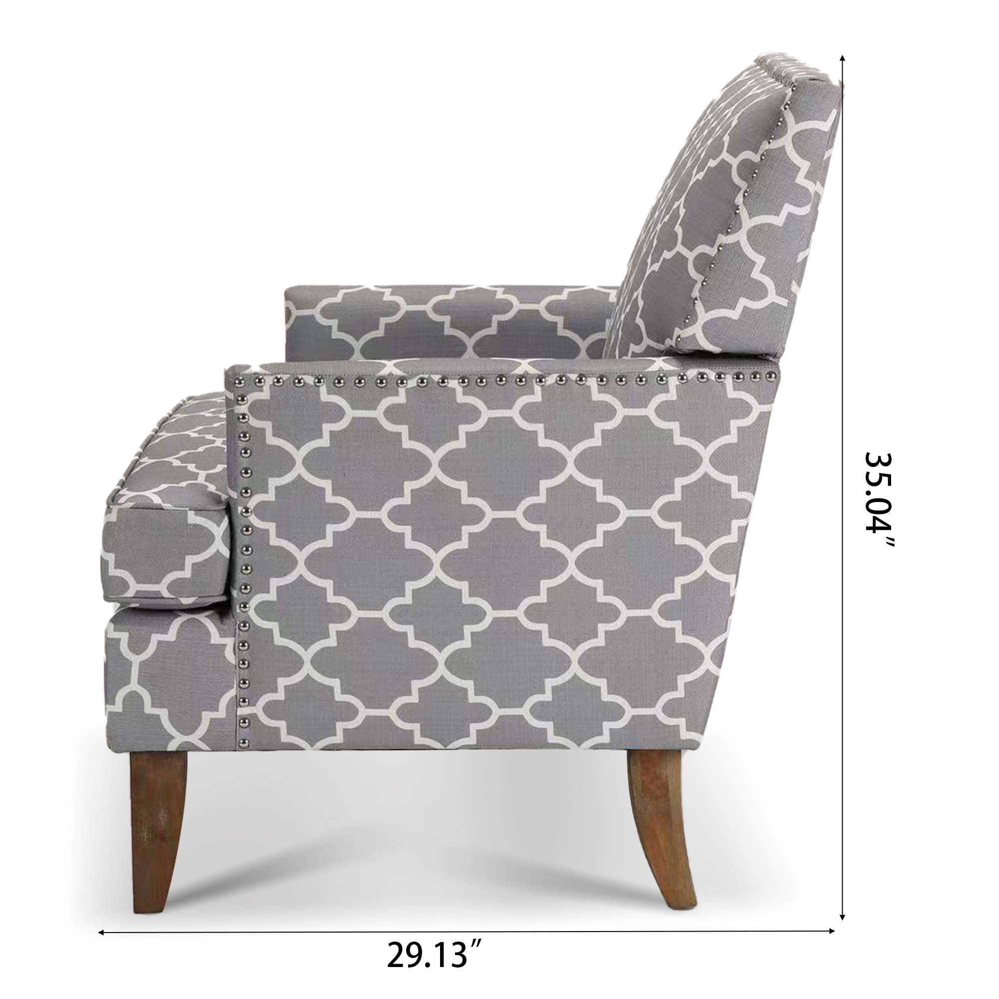 This armchair brings a traditional style to your office or living room. It's built with plywood and a solid wood frame that sits on tapered legs with an ancient walnut hue, while its square arms and tight back showcase polyester blend upholstery. The printed fabric pattern features a design. The seat is filled with foam for just the right amount of support. We love how metallic nailhead trim adds a dash of refined style.