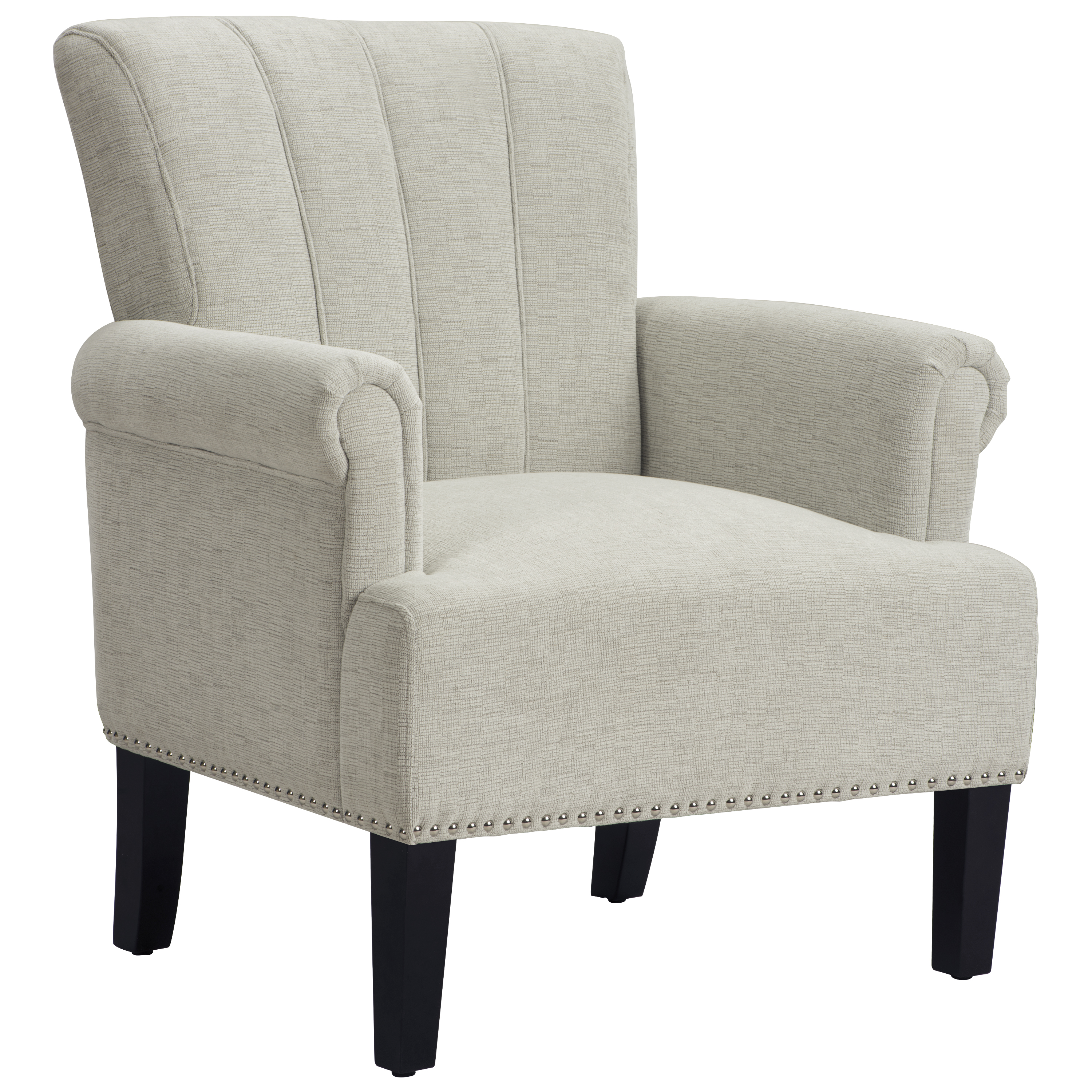 · The chair founded top a solid and engineered wood frame, with tapered, square legs down below. It features a squared back with channel tufting and rolled arms for a traditional appeal.
