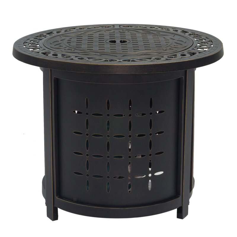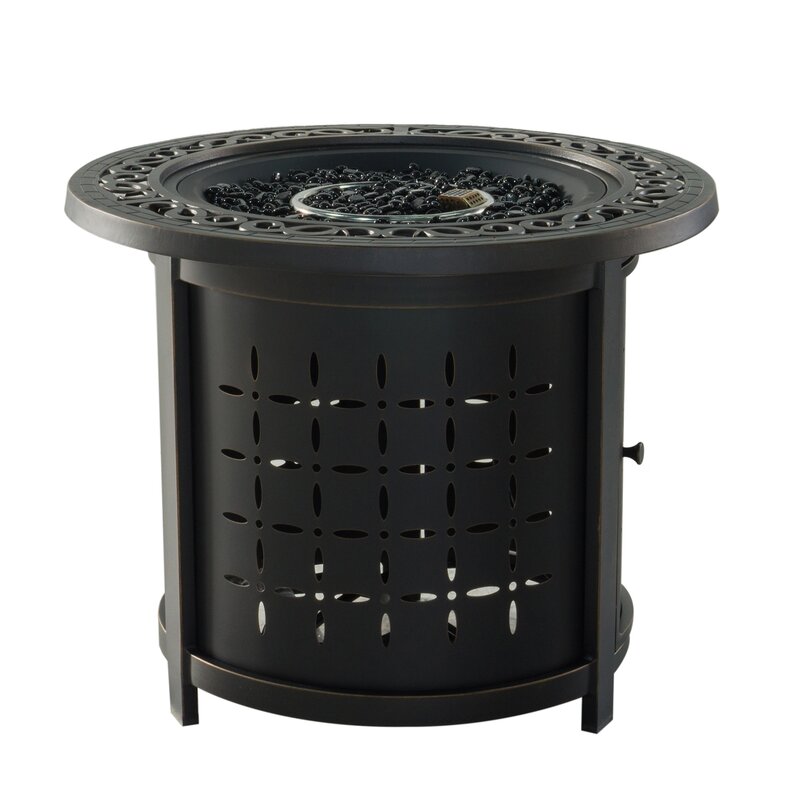 This small round fire pit table features the sophisticated elements of high-end furniture, with the durability of weather resistant cast aluminum. Its decorative base hides a propane tank, not included, and control panel, making it an attractive focal point for your outdoor living space. Non-corrosive cast aluminum frames finished with our specially formulated, high UV-resistant powder coating. Firepit BTU 55,000BTU/hr. Glass firebeads to fill the burner.