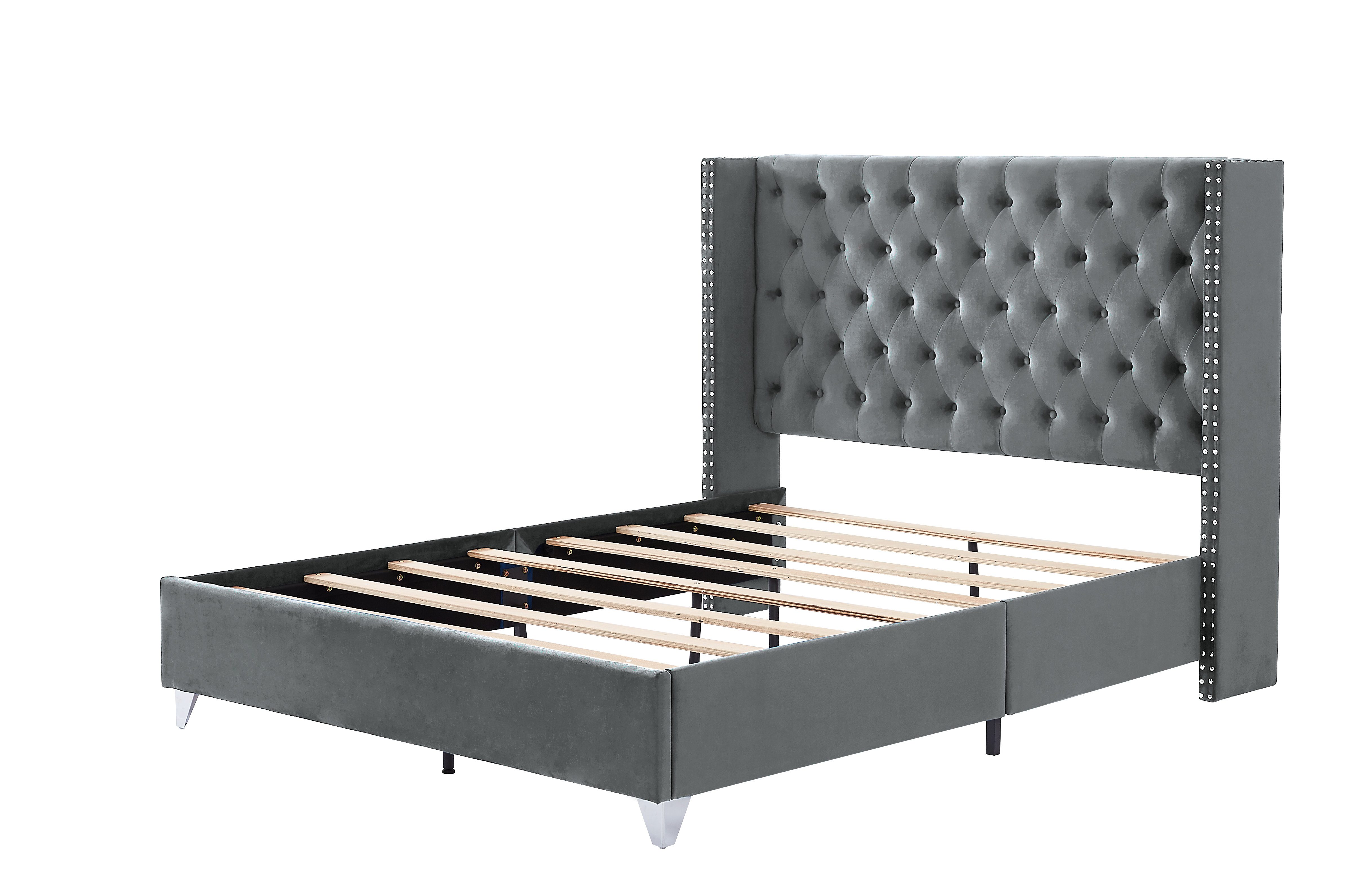 Velvet Upholstered headboard, The design of the beauty is generous, with Wood Slat Support, No Box Spring Needed, Easy Assemble, Queen Size, Blue / Brown / Gray