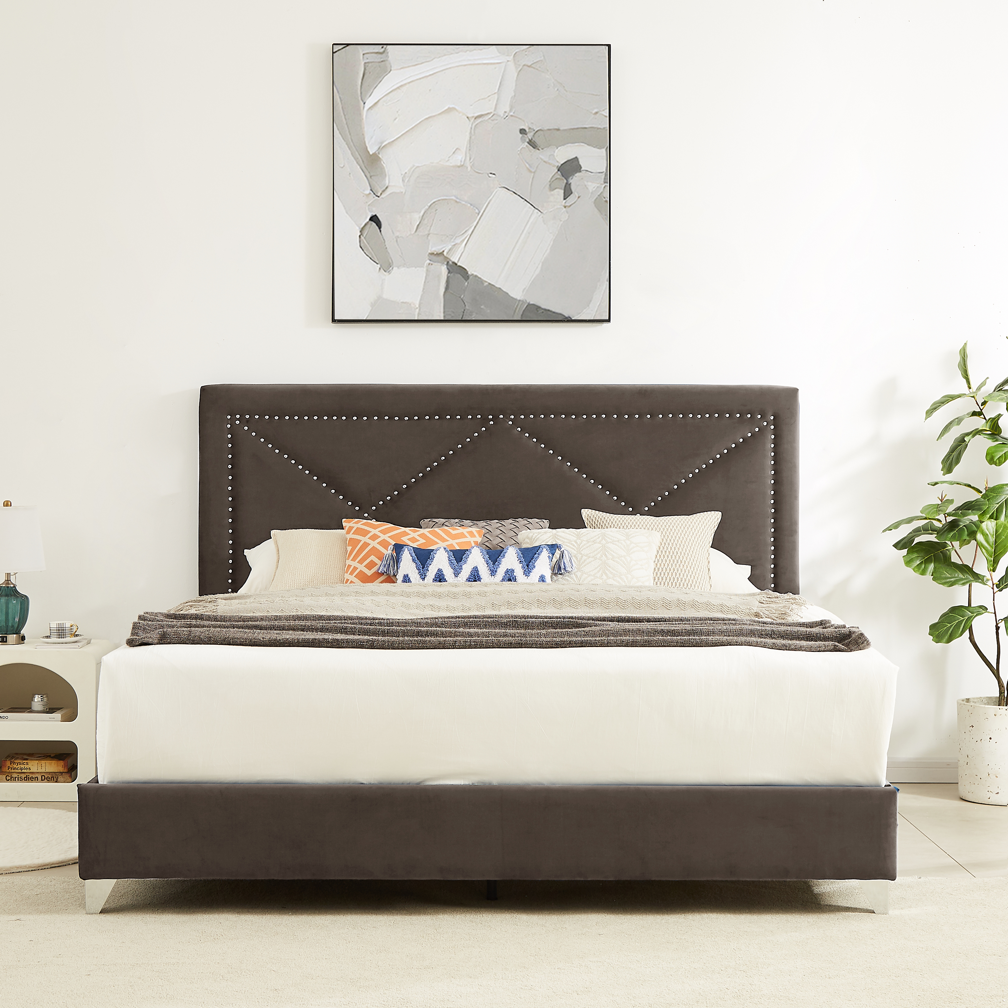 Soft Cloth Upholstered Platform Bed Frame, The design of the beauty is generous, Wood Slat Support, No Box Spring Needed, Easy Assemble, King Size, Brown