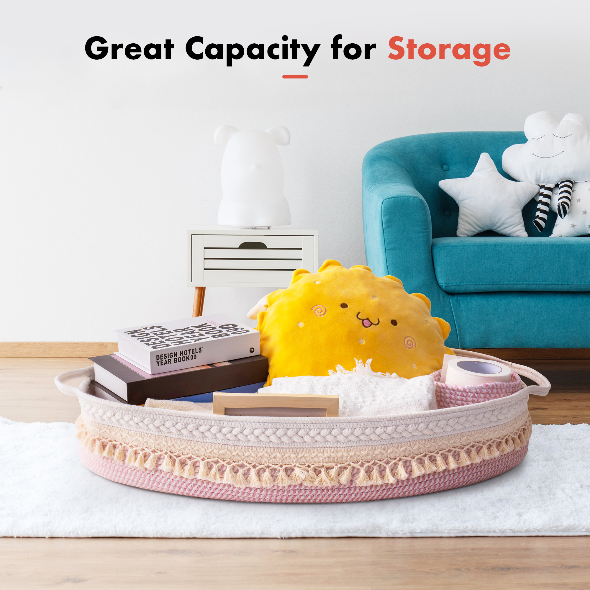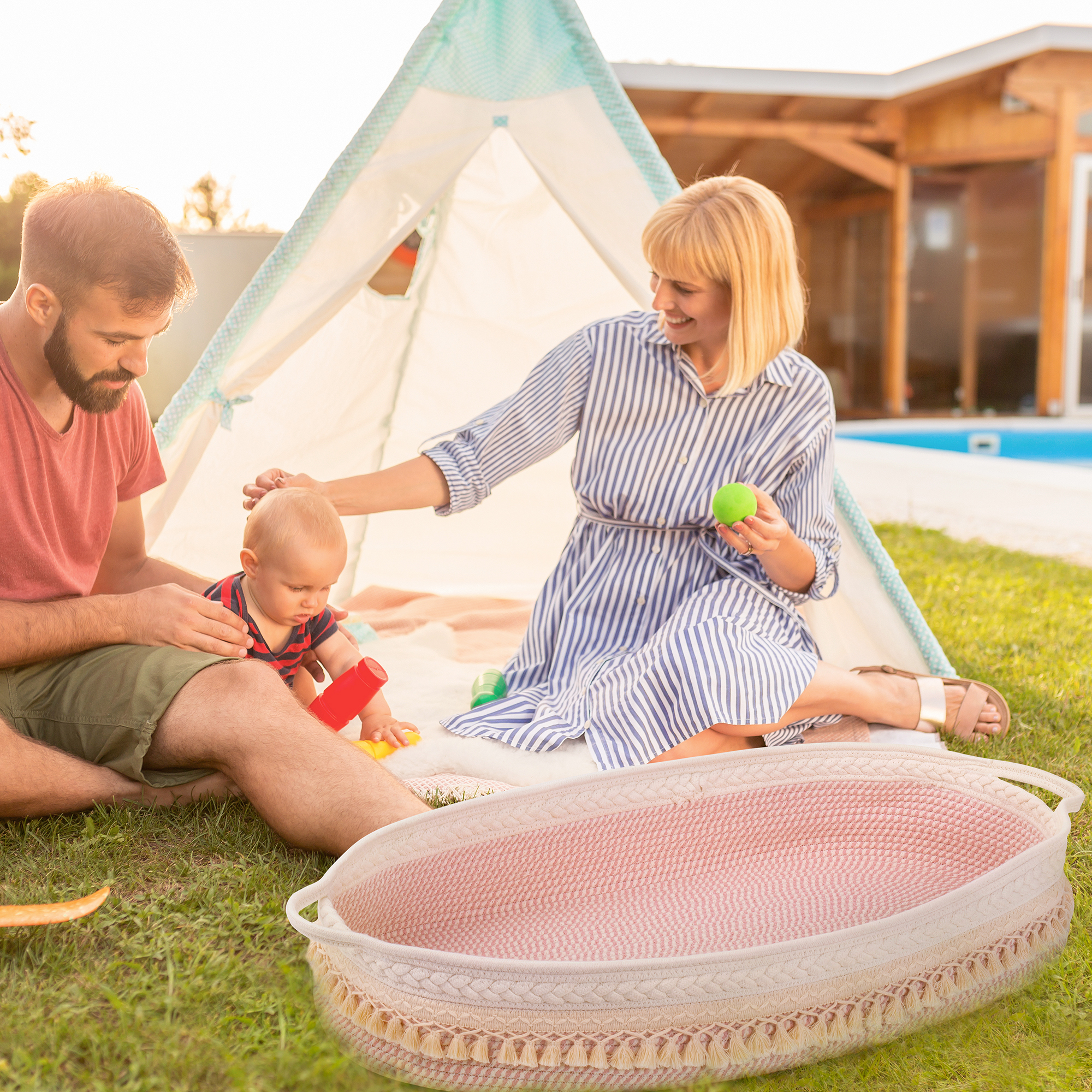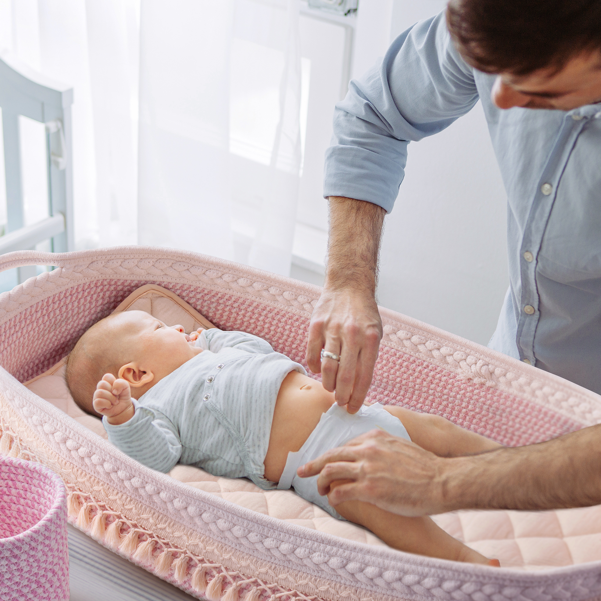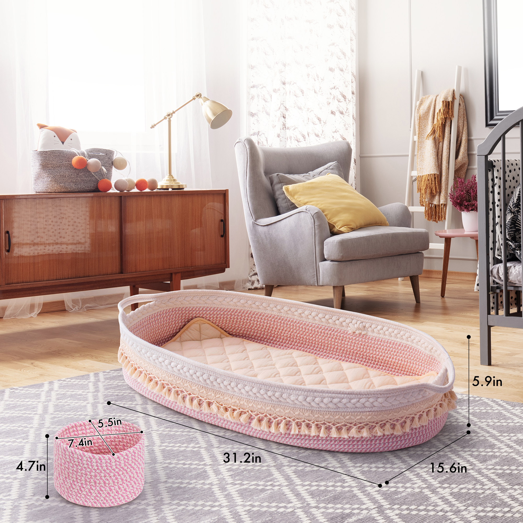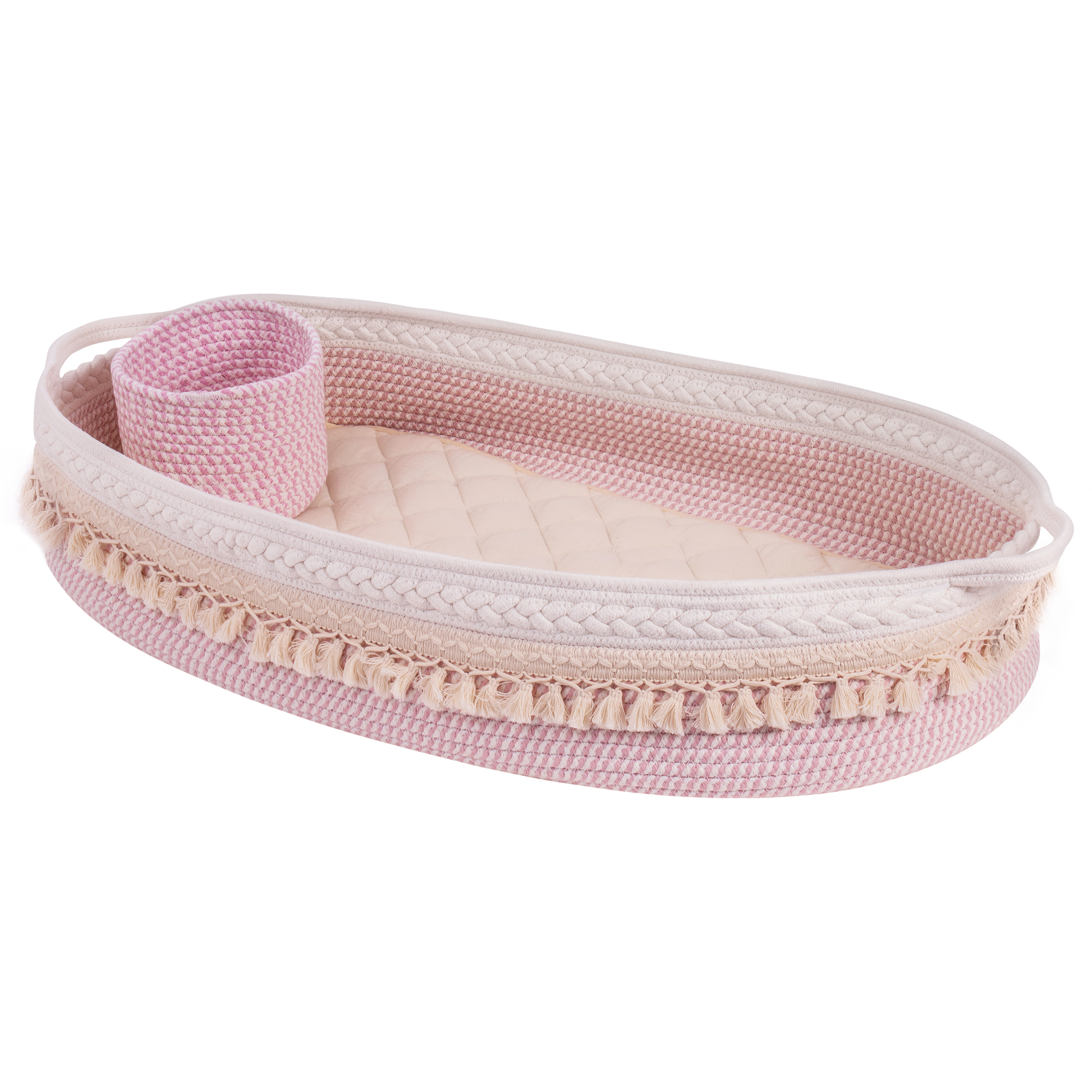 Baby Changing Basket, Handmade Woven Cotton Rope Moses Basket, Changing Table Topper with Mattress Pad(Beige&Pink)