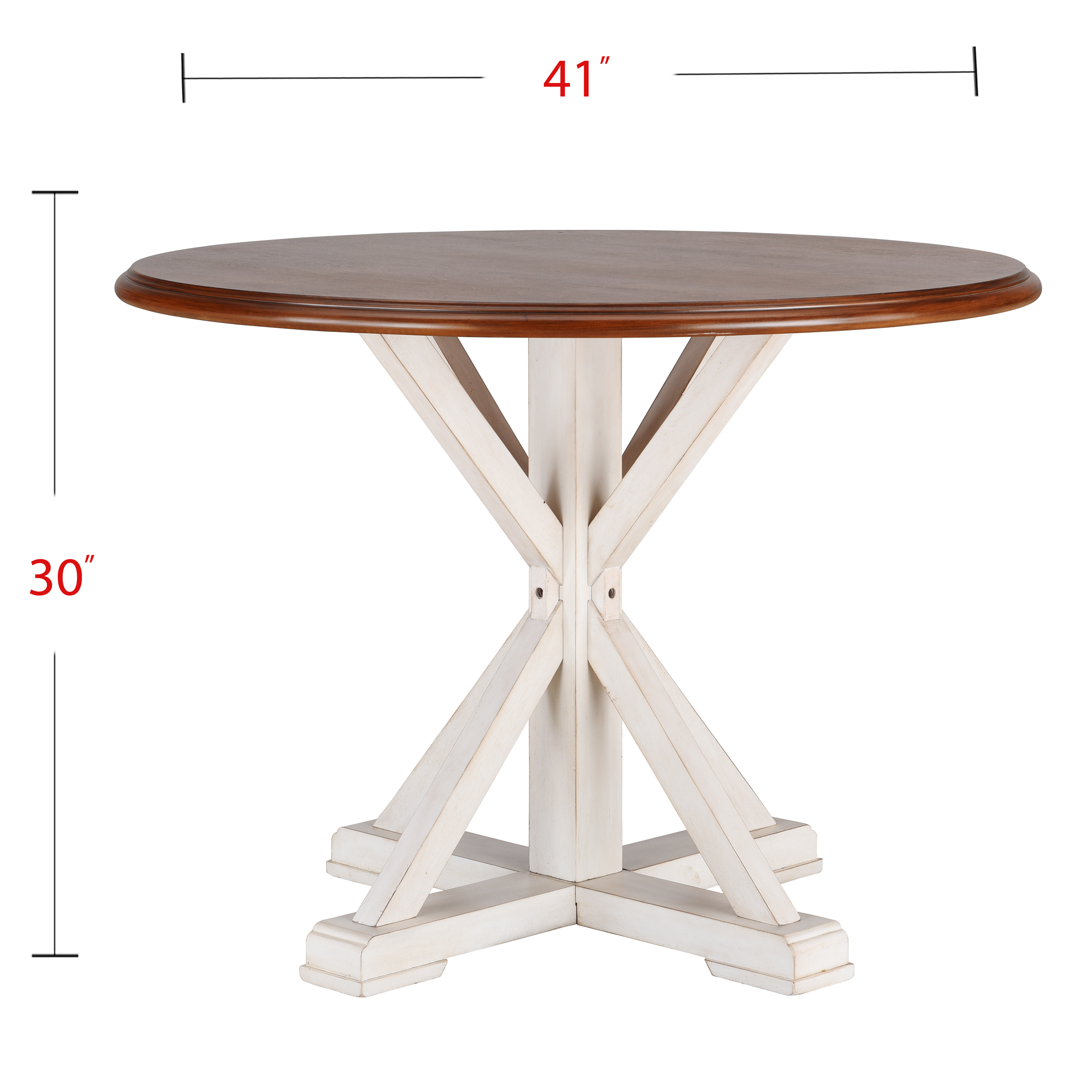 Bring classic farmhouse charm home with this trestle inspired pedestal dining table. Intimate dinners for two or card games for four, this universal dining table is an ideal host. Gather 'round and let the kitchen or dining room be the center of yourhome. The high contrast, two tone color captivates your family and guests during meals or chats over coffee. Antiqued finish will vary.