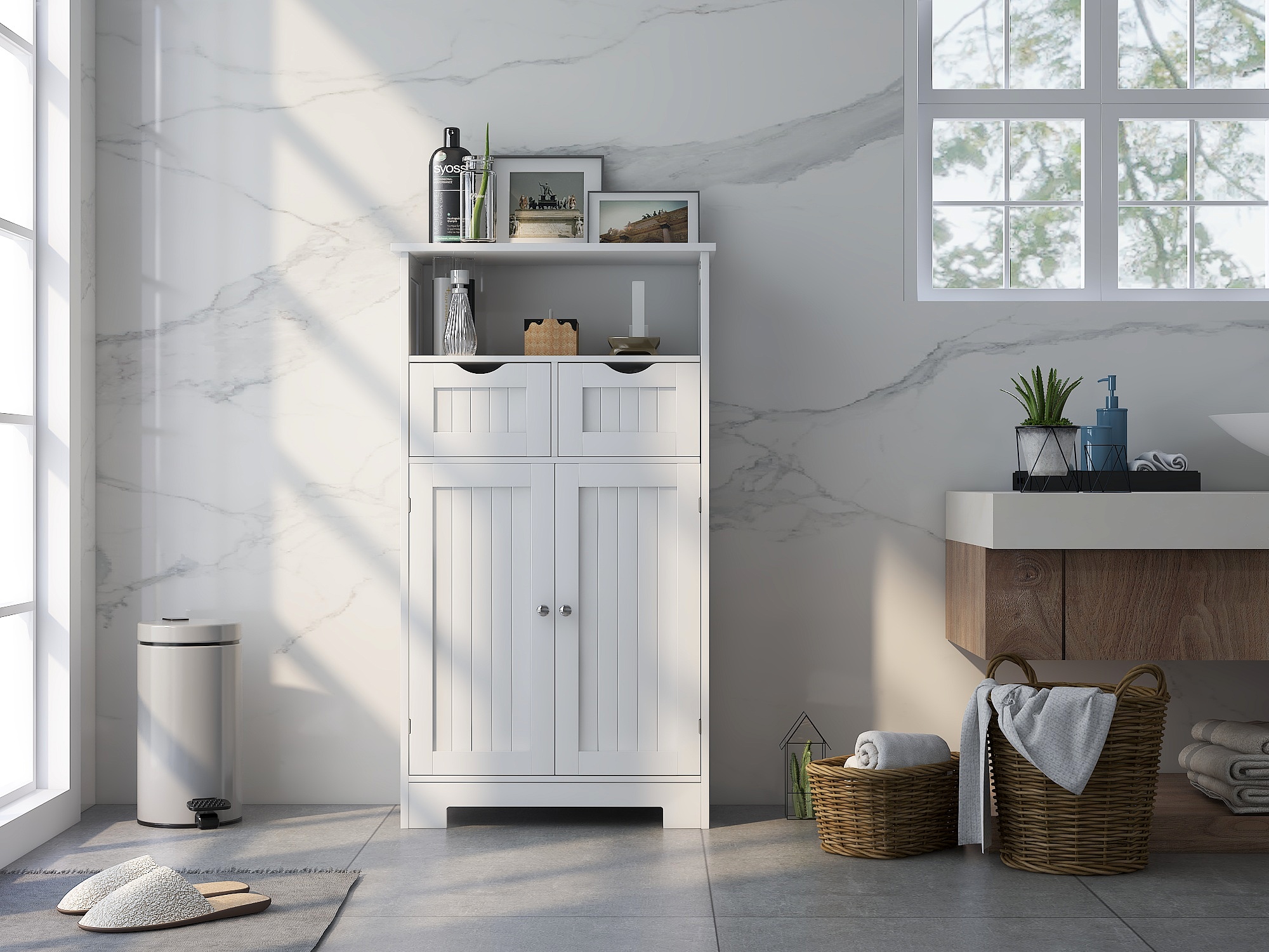 - Large Storage Capacity: This Bathroom freestanding cabinet comes with 2 doors, allowing you to store toiletry supplies and other skin products and protect them from water, and inside there is an adjustable shelf to face your different needs. And 2 drawers and one open storage shelf allow you to put bath towels or other stuff in it and get them easily when finished bathing or showering.