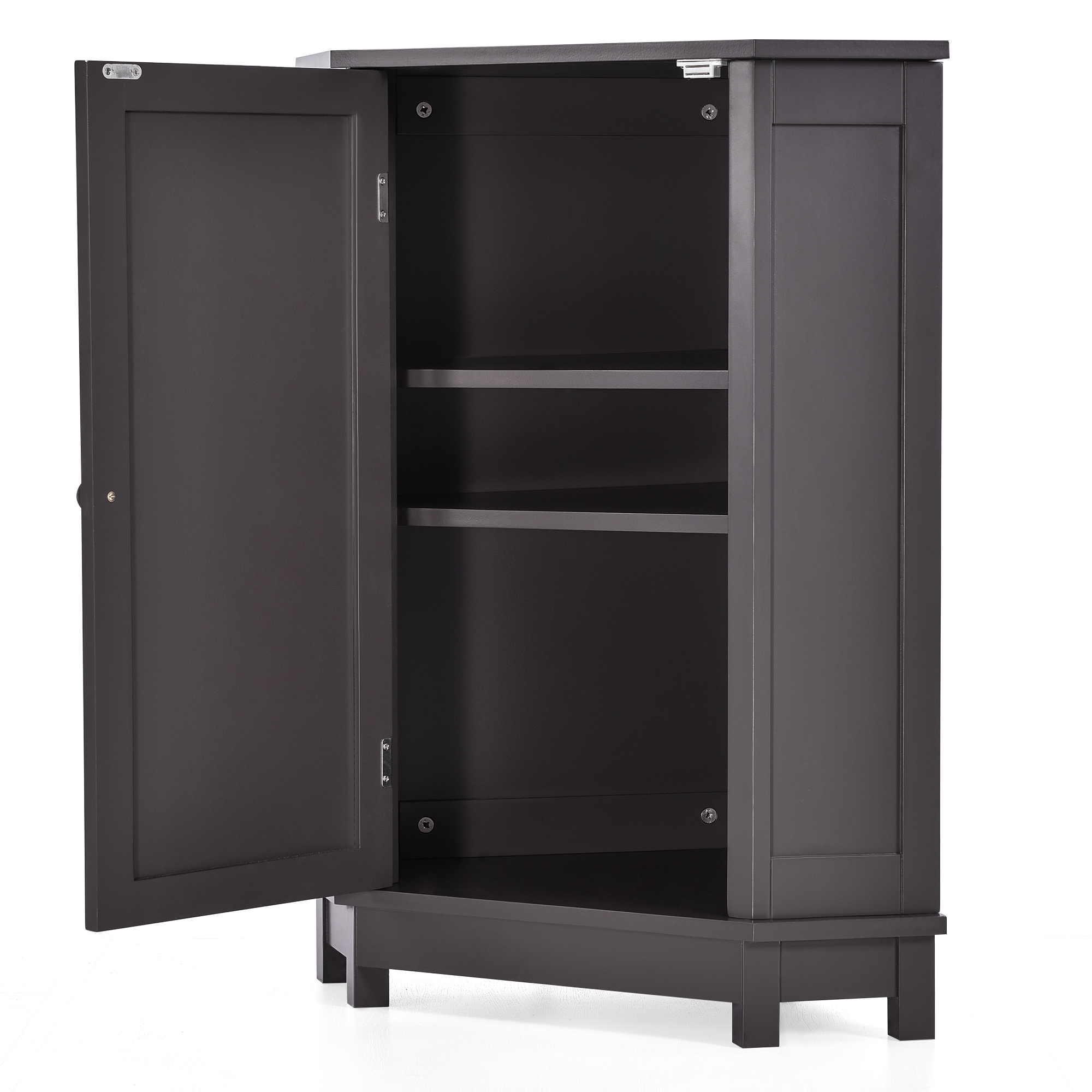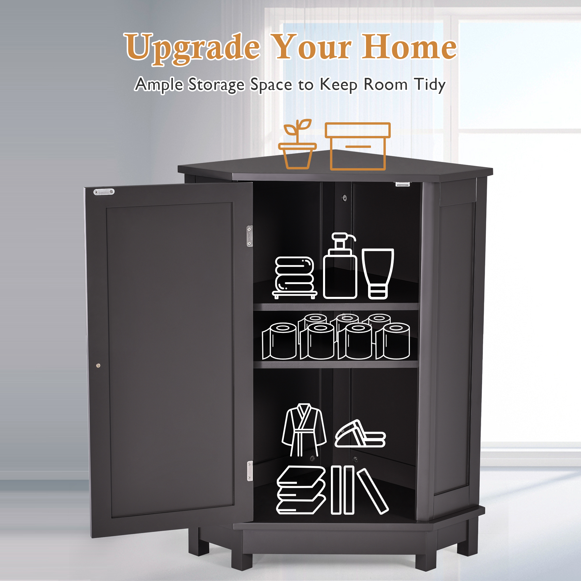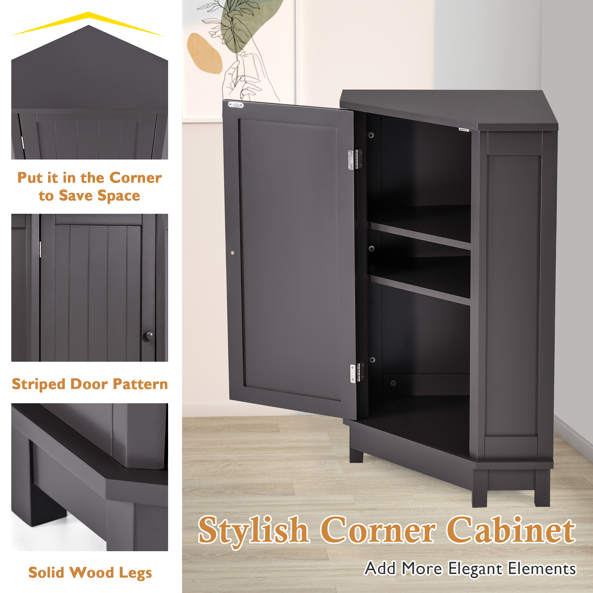 ★ELEGANT & STYLISH: This black-brown corner storage cabinet with doors is designed not only to meet your visual demands but also to satisfy your functional needs. With inside two shelves, it can meet your various storage needs. Ceramic knobs make it convenient for you to open and close. The closed storage room with doors can keep your stuff dry and clean.