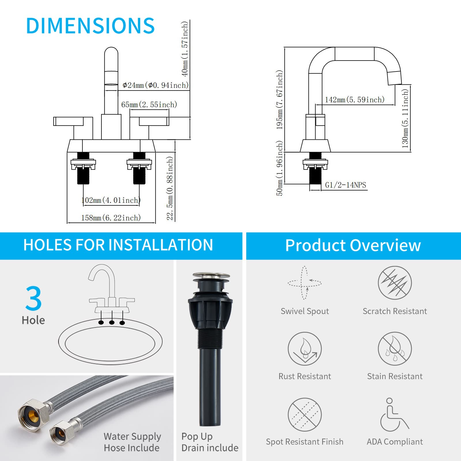 [EASY INSTALLATION]: Bathroom faucet comes with a plastic Pop up Sink Drain Assembly with Overflow and 2 high-density solid braided nylon tub water supply lines. 4-inch centerset and 3 hole mount design allow for easy installation. Detailed installation instructions will guide you on how to perform installation quickly.