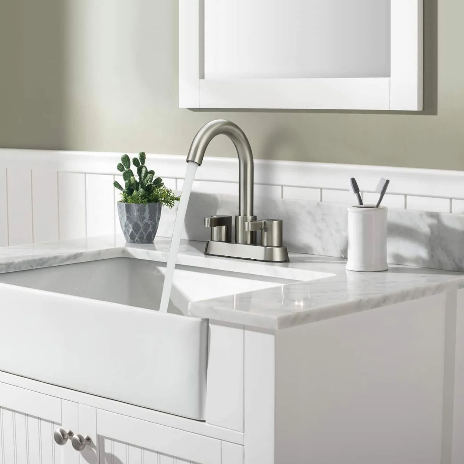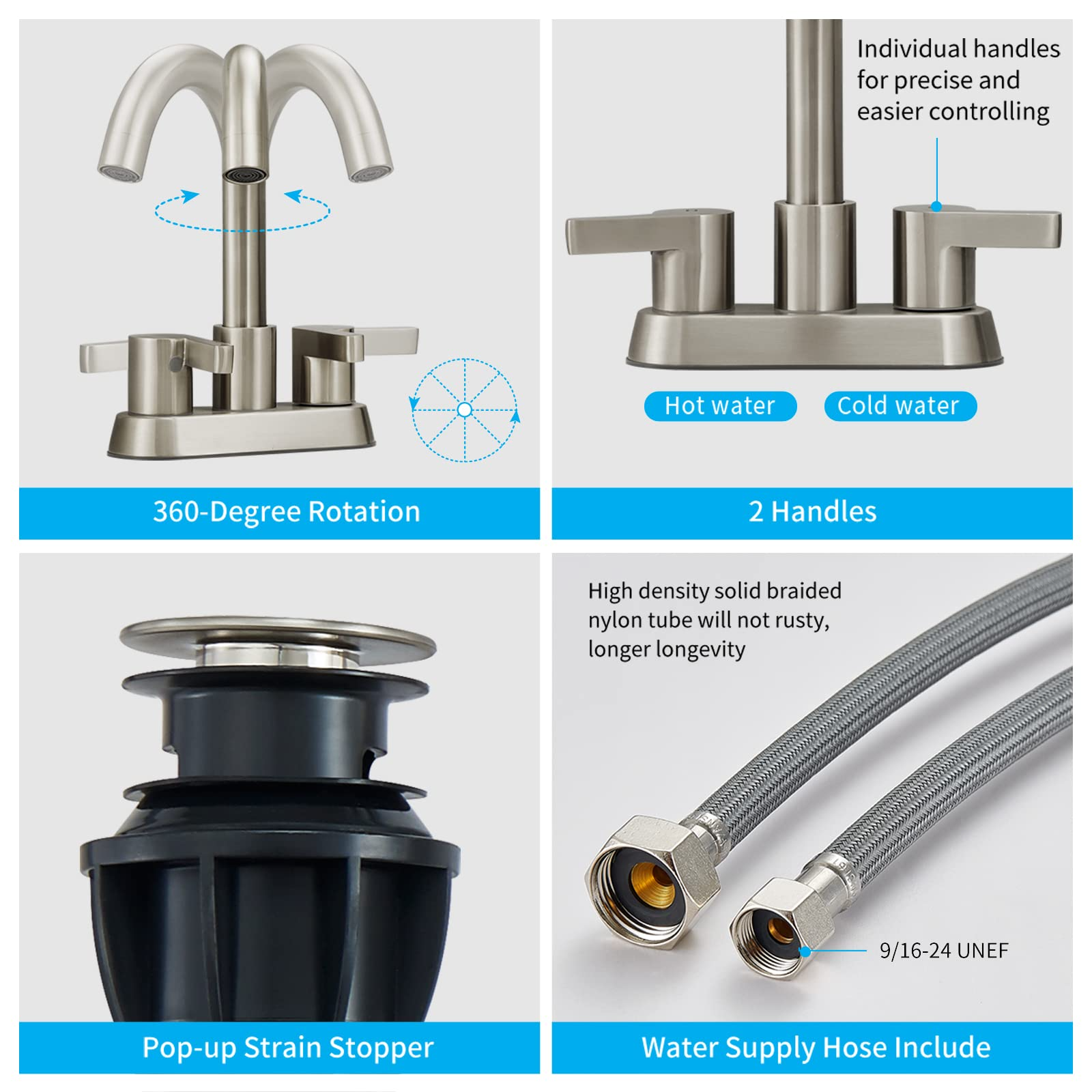 [HIGH QUALITY]: This centerset bathroom faucet for vanity sink is made of high quality 304 stainless steel Body and Lead-Free Waterway. Fingerprint free, resist corrosion, Perfectly decorate your bathroom.[EXQUISITE DESIGN]: This Lavatory Faucets has 360° Swivel Spout and double straight handles that are convenient for Preciser and easier Control in water temperature and volume, The easy-to-clean nozzle is convenient for your daily cleaning, and the high arc is convenient for your unrestricted use, and is suitable for most bathroom designs.[EASY INSTALLATION]: The brushed nickel bathroom faucet comes with a plastic Pop up Sink Drain Assembly with Overflow and 2 high-density solid braided nylon tub water supply lines. 4-inch centerset and 3 hole mount design allow for easy installation. Detailed installation instructions will guide you on how to perform installation quickly.[DIMENSIONS]: Spout Height is 6.1"(154mm), Spout Reach is 5.1"(130mm), overall height is 8.7"(220mm), 4-Inch center set installation, fit max countertop thickness 1.0" and pre-drilled hole 1.5".[WORRY-FREE WARRANTY]: We are committed to providing you with quality products and customer service support, For any quality issue, please feel free to contact us, we will provide you with a satisfactory solution within 24 hours.(Each faucet needs to be watered before leaving the factory, So it is normal to have some water stains in the faucet ).