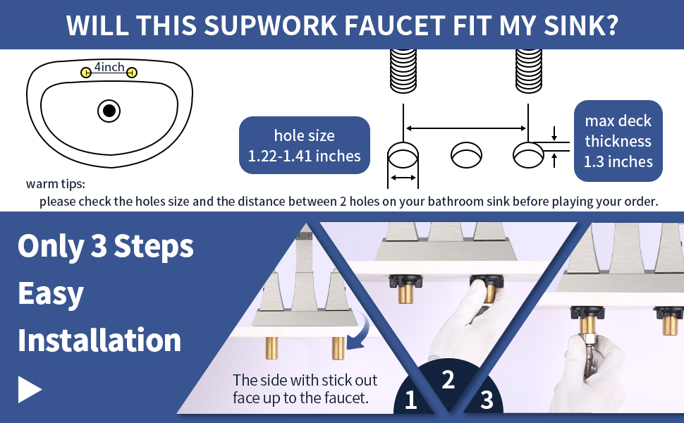 Recommended Uses For Product Bathroom Mounting Type Deck Mount Finish Type Brushed Color Brushed Nickel Number of Handles 2 Included Components Aerator Number Of Holes 3 Special Feature Lead Free Handle Type Lever Style Modern Installation Method Centerset Item Dimensions LxWxH 12.8 x 10.4 x 7.08 inches Manufacturer Supwork Item Weight 3.92 pounds Product Dimensions 12.8 x 10.4 x 7.08 inches Finish Brushed Special Features Lead Free