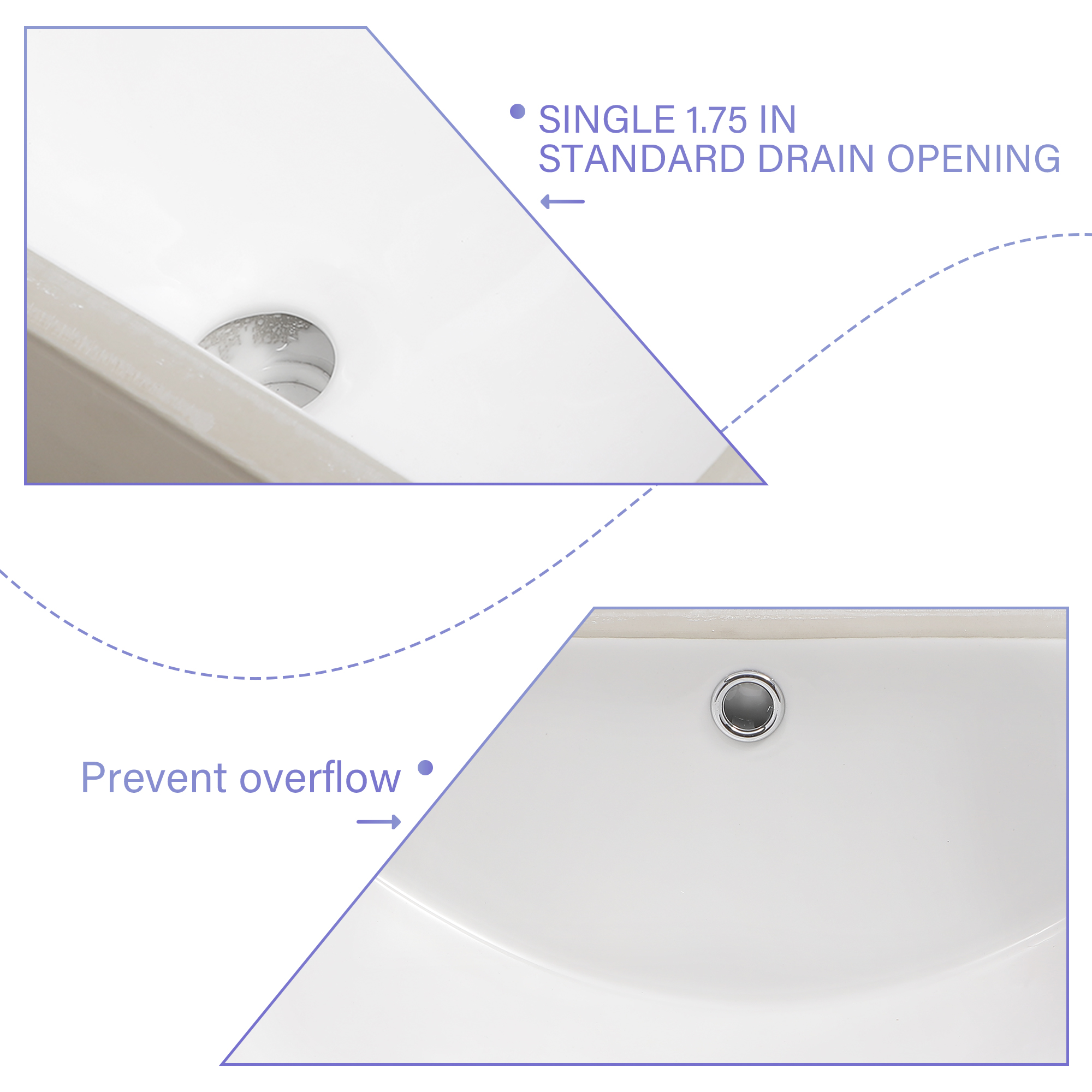 - No faucet holes, requires wall or counter-mount faucet.