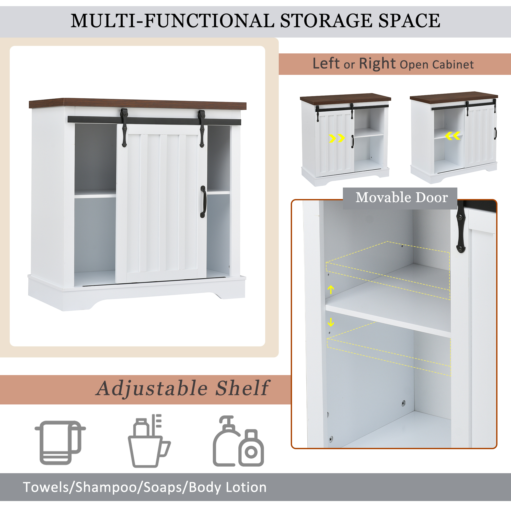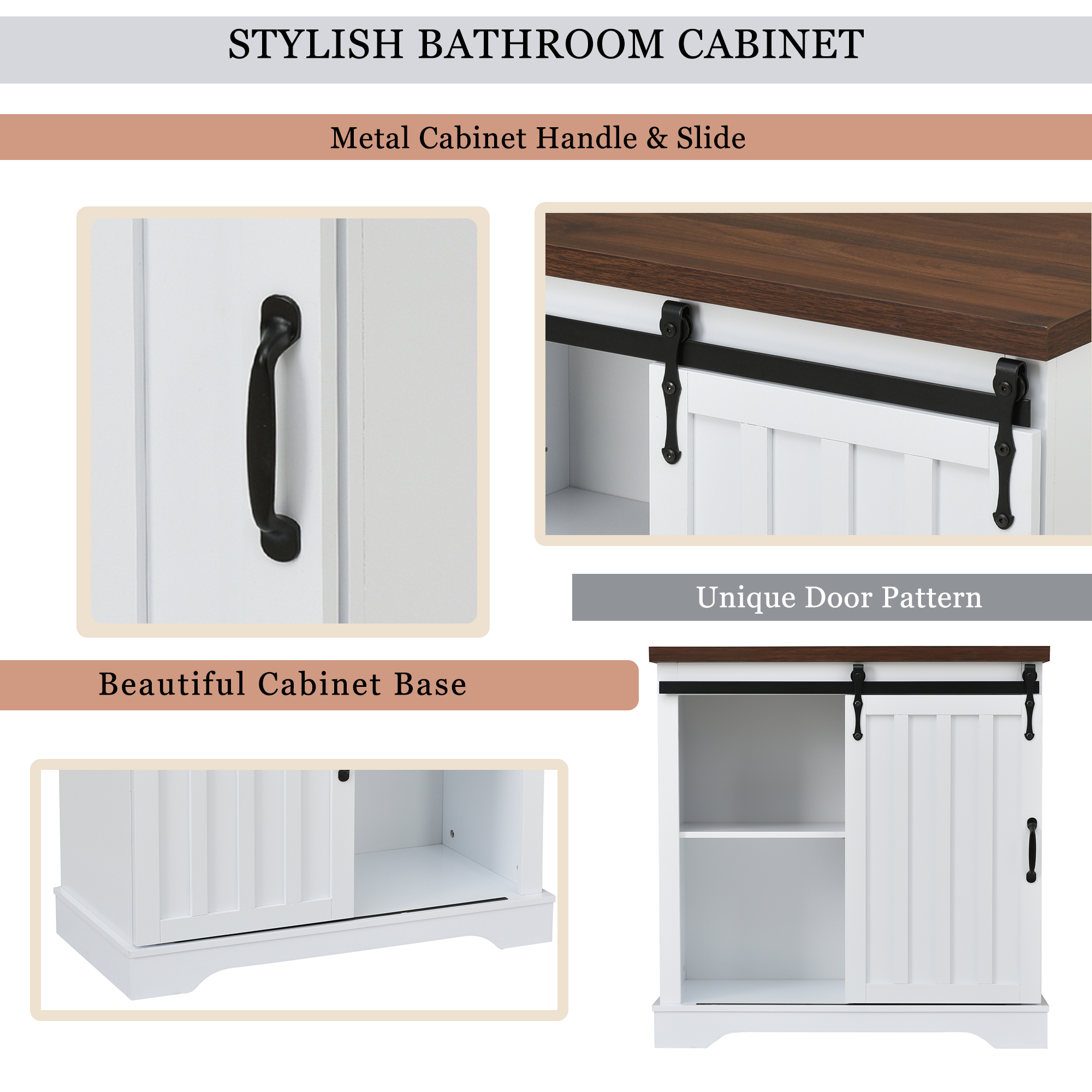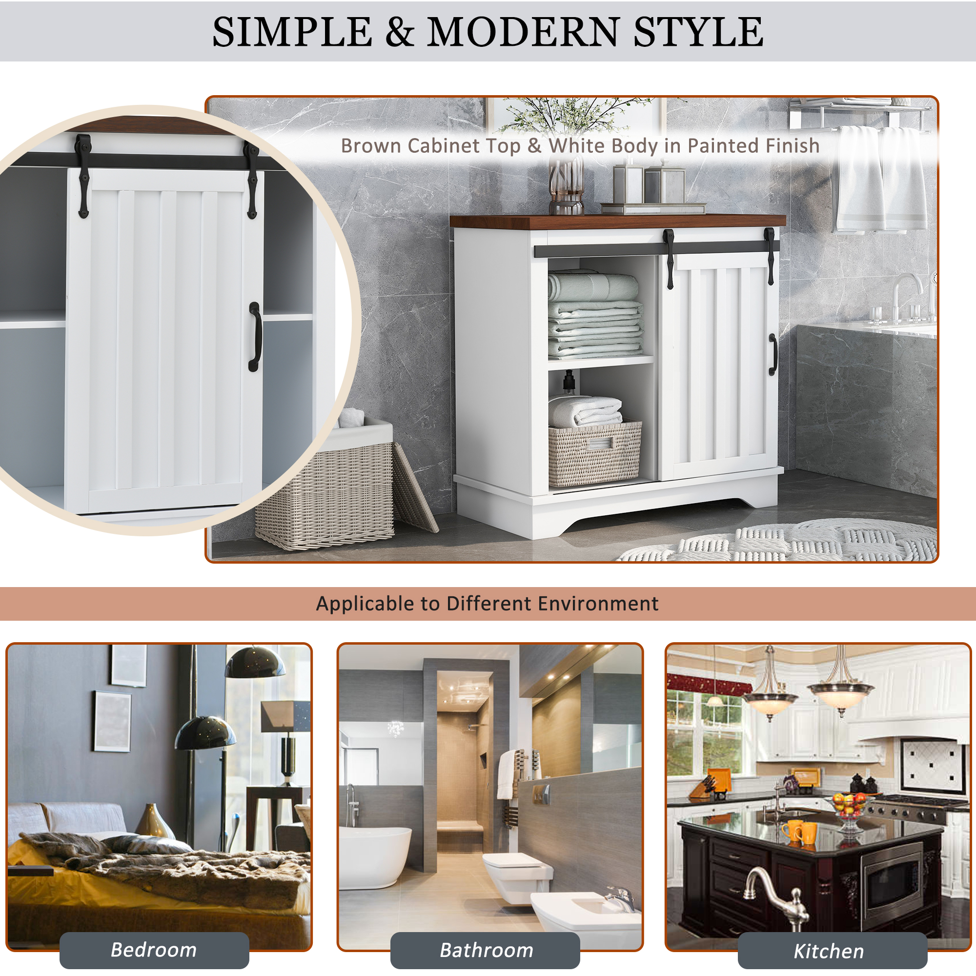 Bathroom Storage Cabinet, Freestanding Accent Cabinet, Sliding Barn Door, Thick Top, Adjustable Shelf, White, and Brown