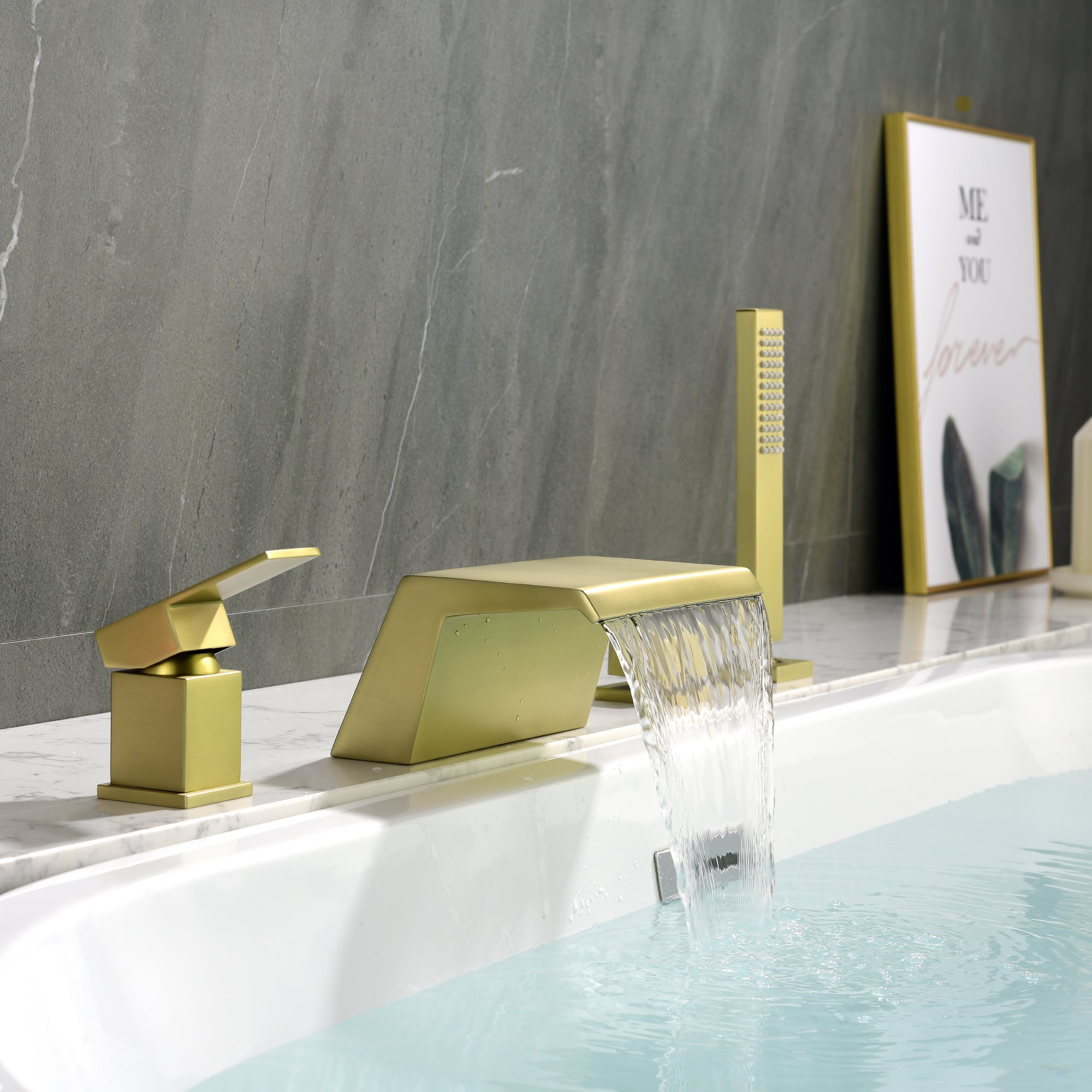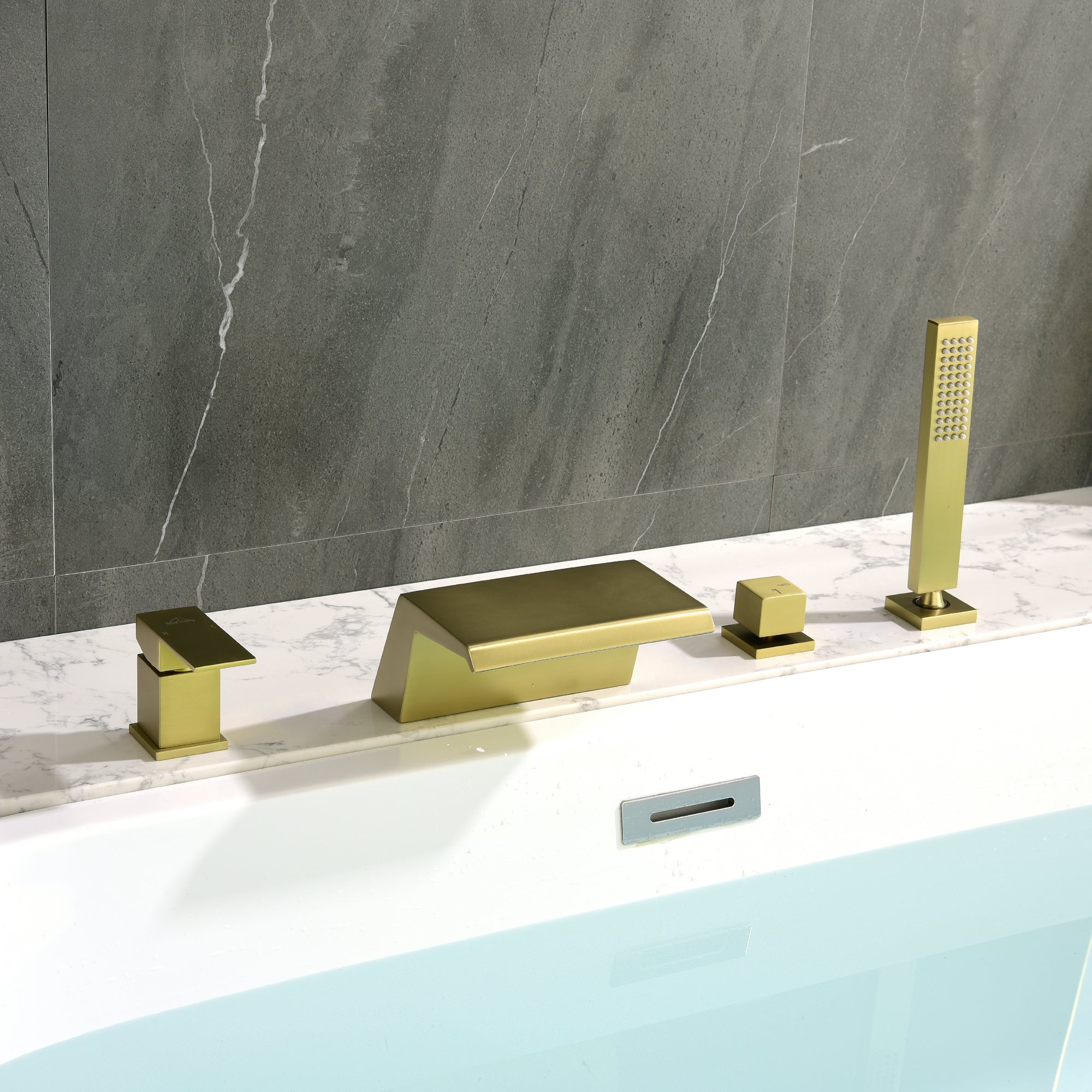 This is a modern Deck Mount Roman Tub Faucet with a minimal, streamline design and elegant hand shower that makes bathing a truly pleasurable experience. 4 Hole installation. This tub faucet requires low maintenance and is easy to clean.