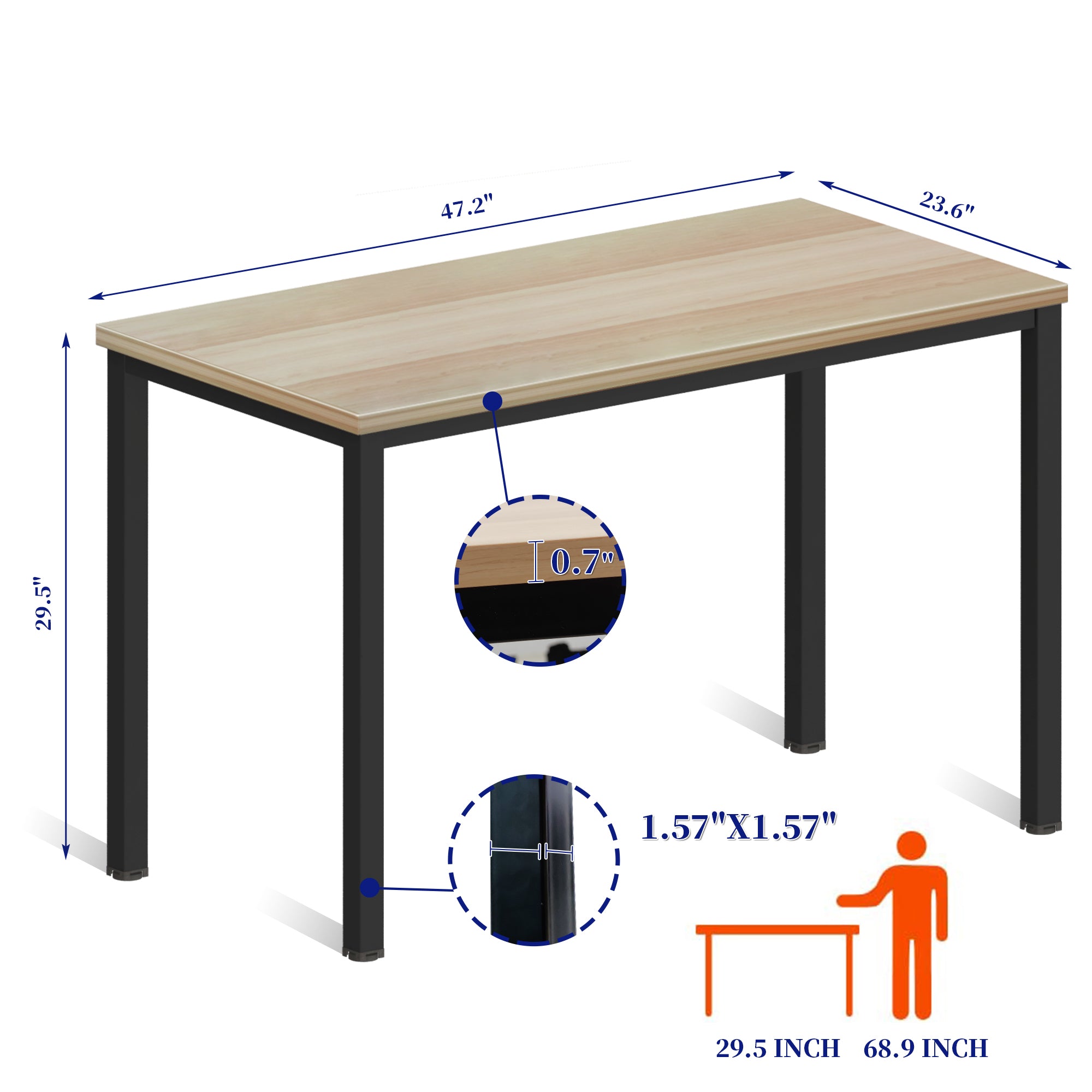 PRODUCT DIMENSIONS: 47.2(L)x23.6(W)x29.5(H) inch .0.7in for MDF desktop, Black metal powder coated leg:1.57"x1.57".
