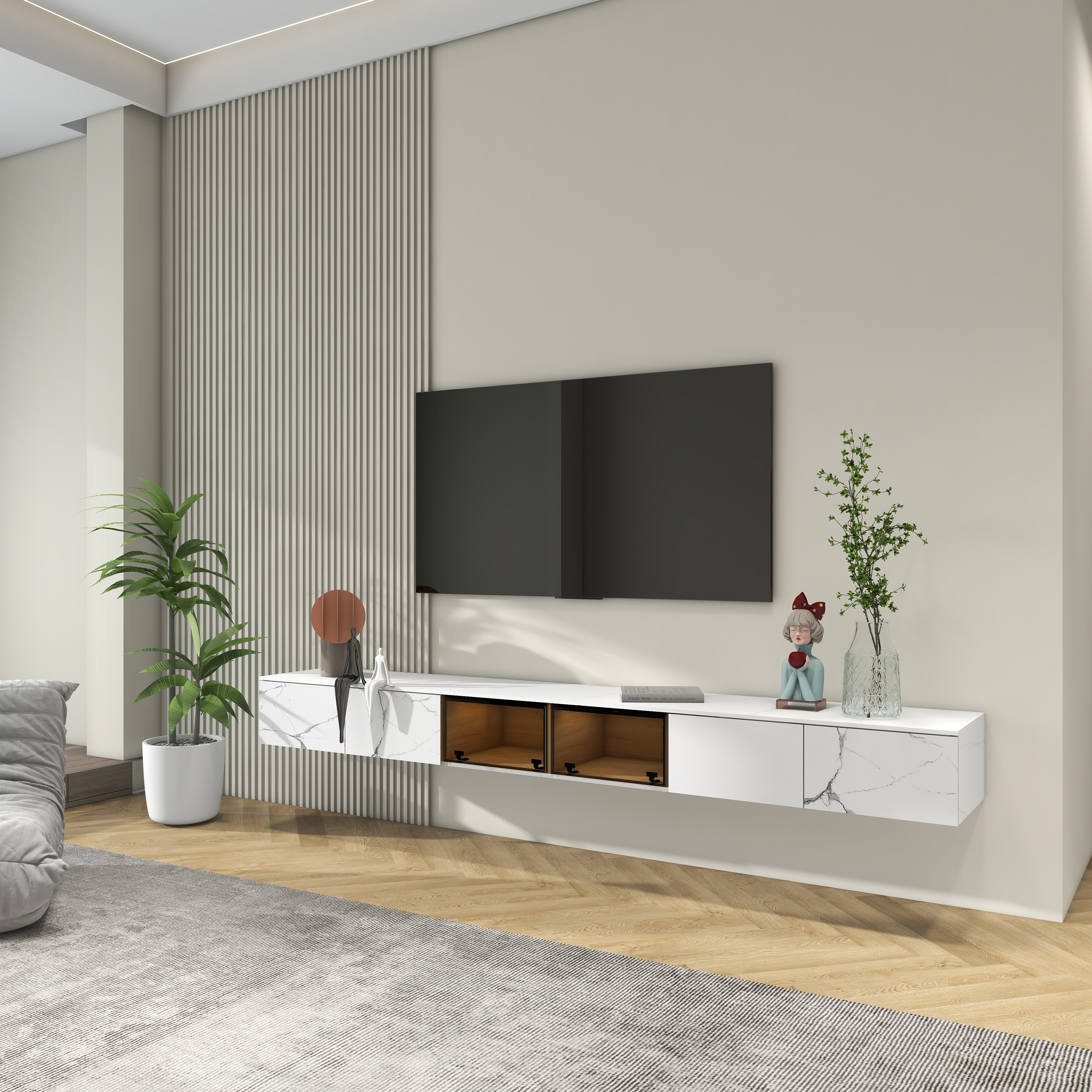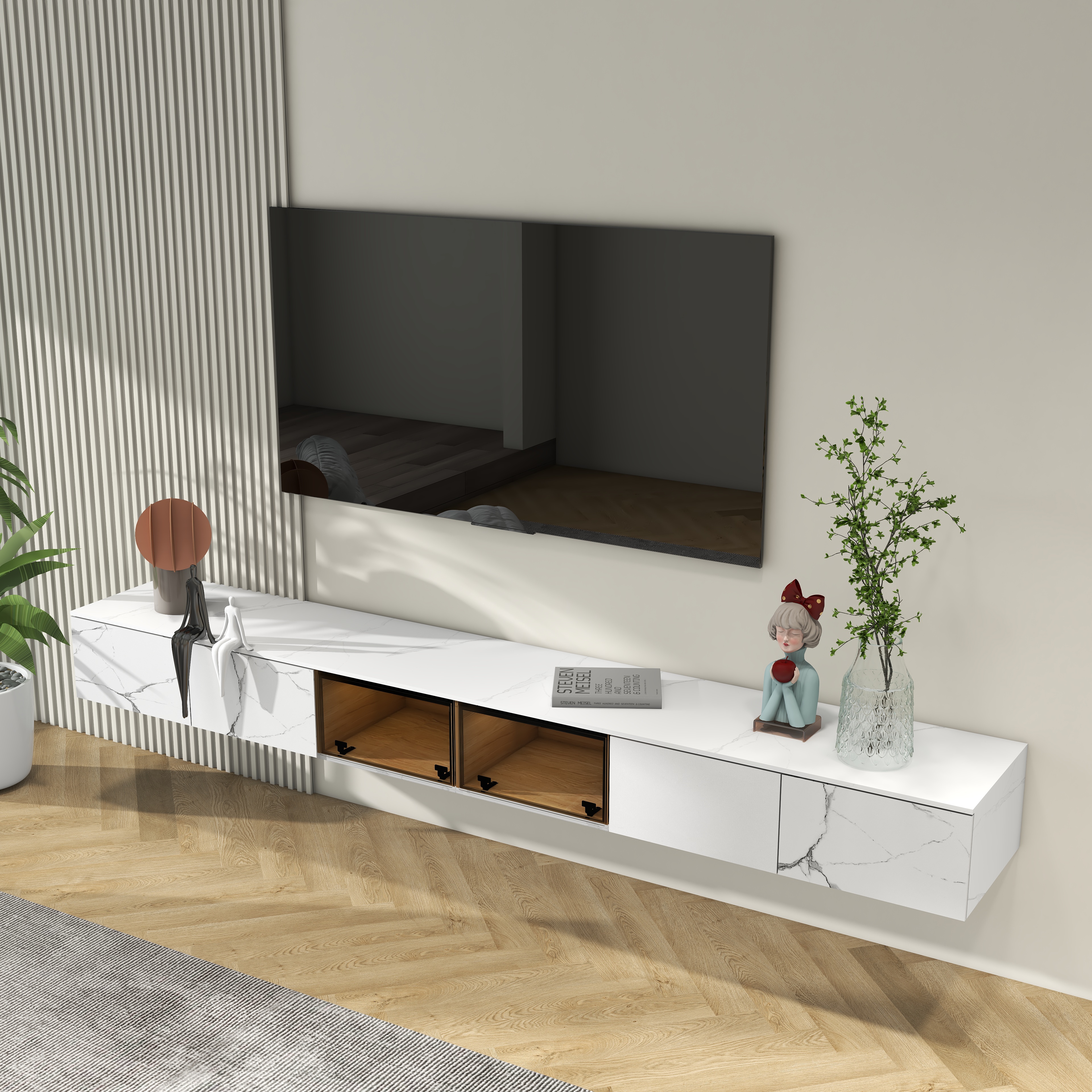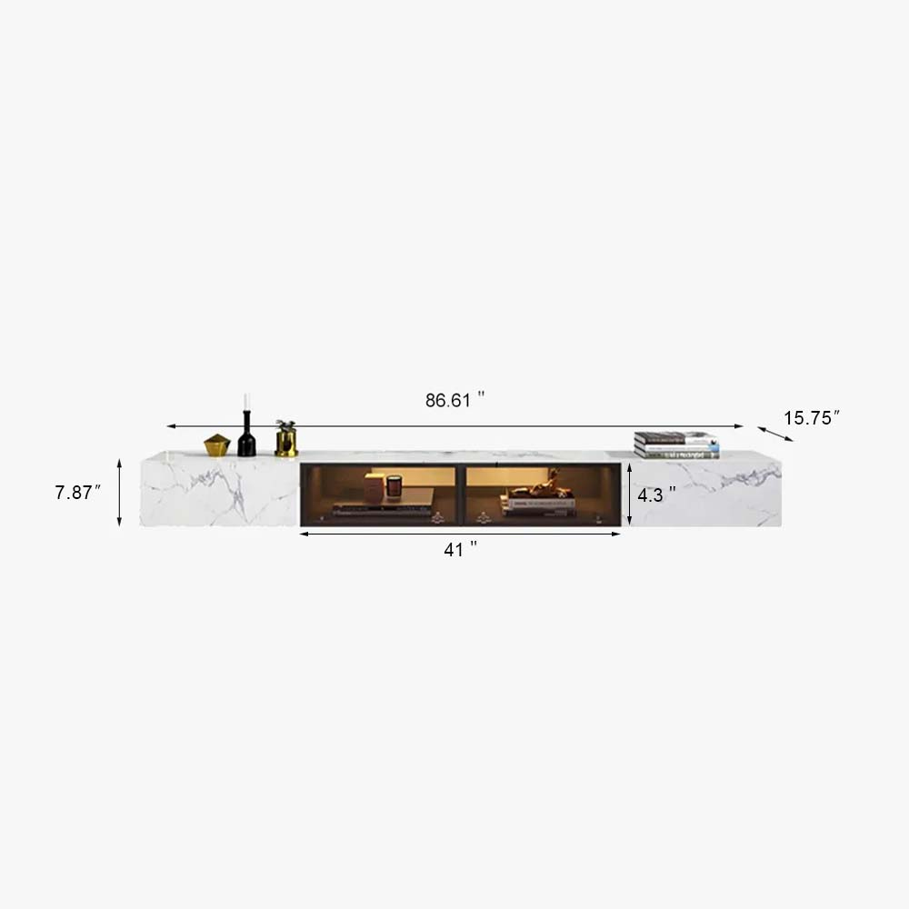Use this wall-hung tv cabinet to add a modern flavor to your living room. It is equipped with a transparent glass door, which can display the collectibles in the cabinets and prevent dust from entering. It provides plenty of space for storing all of your media accessory necessities, practical and stunning. With the floating design, it is easy to clean the spot under the stand. It's made of MDF and sintered stone, which ensures a strong structure and eternal beauty. This modern hanging TV cabinet is an exquisite focus from any angle.