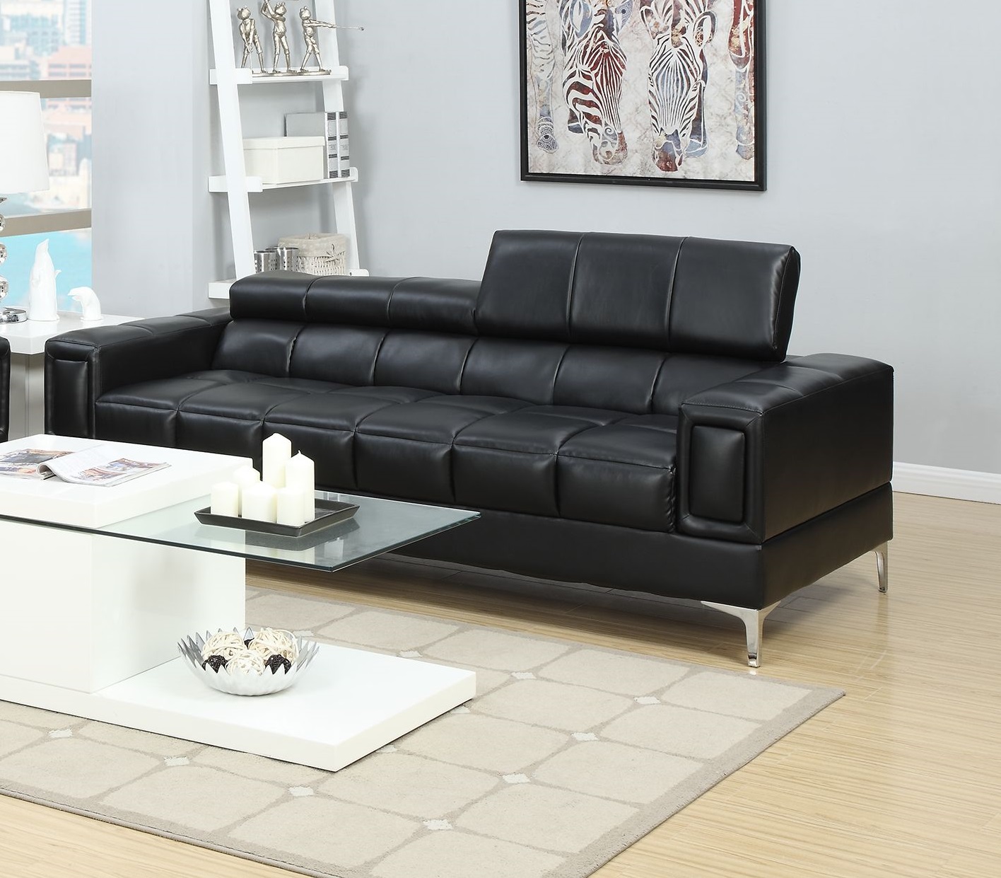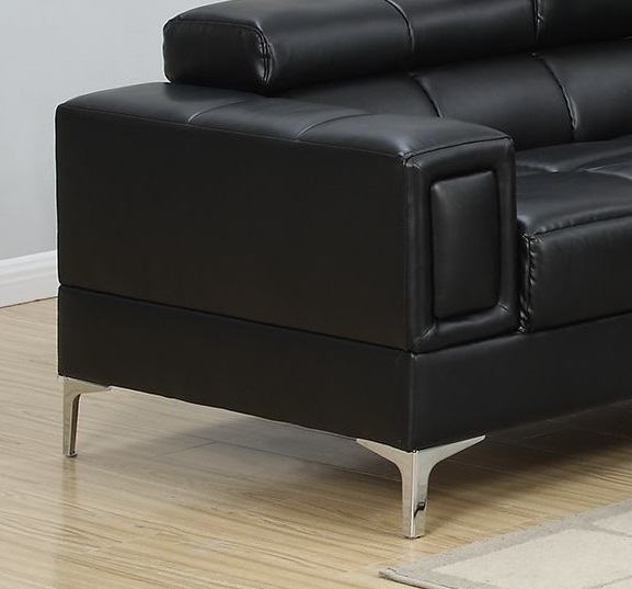 This innovatively designed 2-piece sofa set features long sleek lines and curves with cube shapes befitting a living space out of this world. Each piece includes adjustable head rest for added comfort and chrome leg supports. Available in black and cream (Faux Leather).