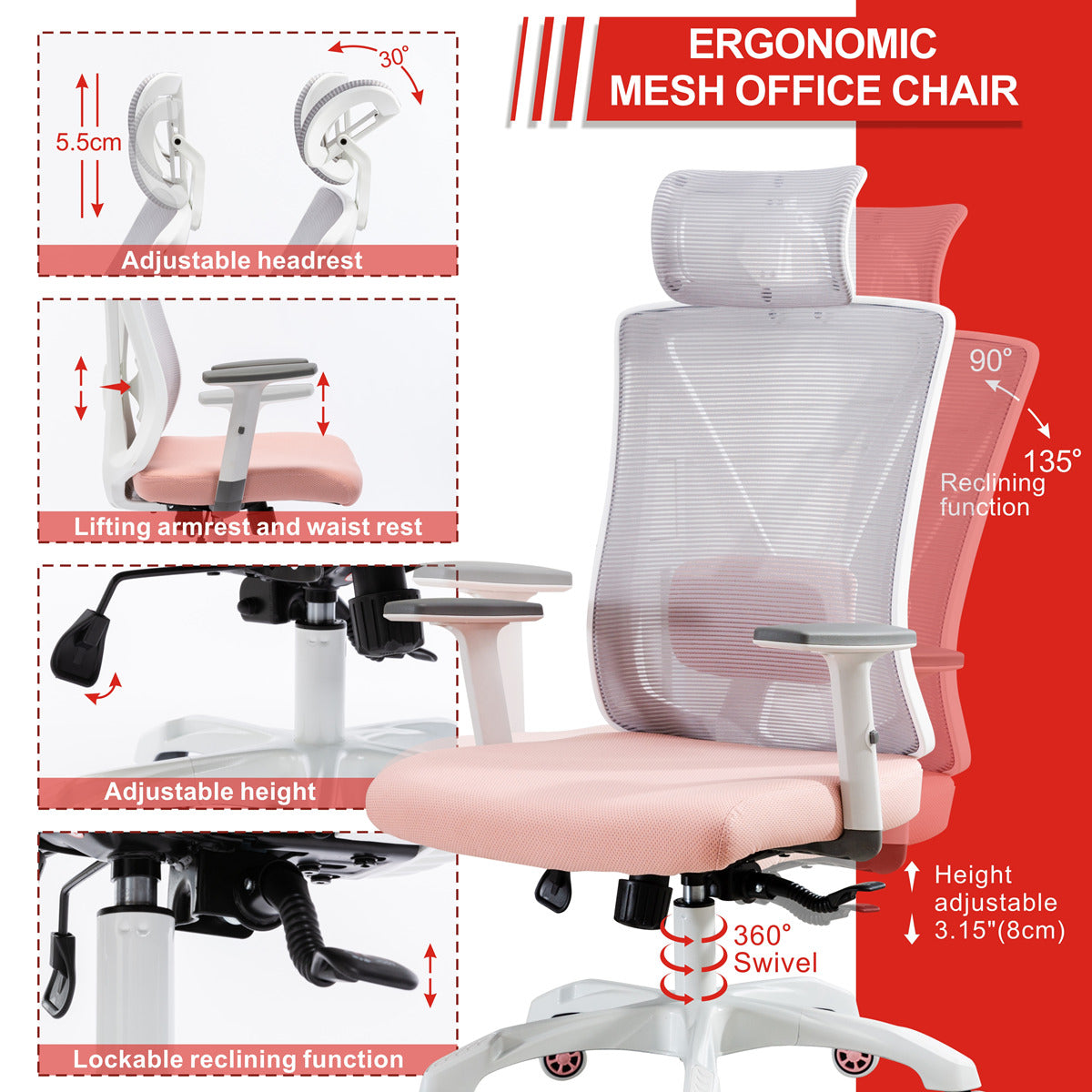 The inclination of the backrest and headrest can be adjusted to suit different needs,The ergonomic office chair is built with adjustable back rest from 90°-130°, Work and relaxation will not be delayed.