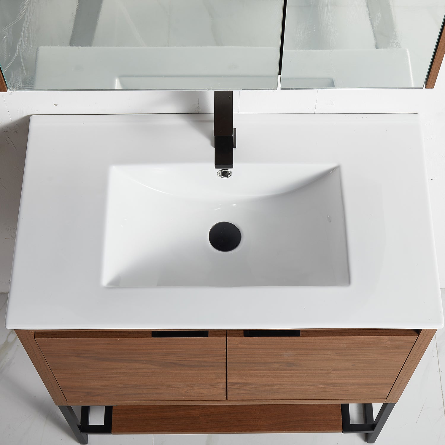 Small depth, the use of integral ceramic basin allows the whole to save space while having a larger use of sinks, so that your decoration is more flexible; The use of solid wood and plywood materials makes the product more durable. The production process of high-gloss paint makes the surface form a waterproof layer, and the surface that does not turn yellow allows you to take care of it better. The drawer and cabinet door are equipped with a hinges, which makes daily use more convenient and quieter. Hinges have been tested for millions of times to ensure the service life of the cabinet door and drawer.
